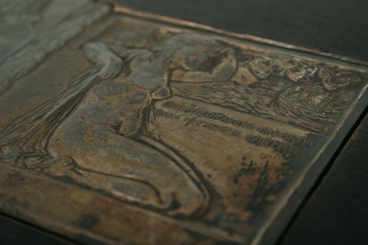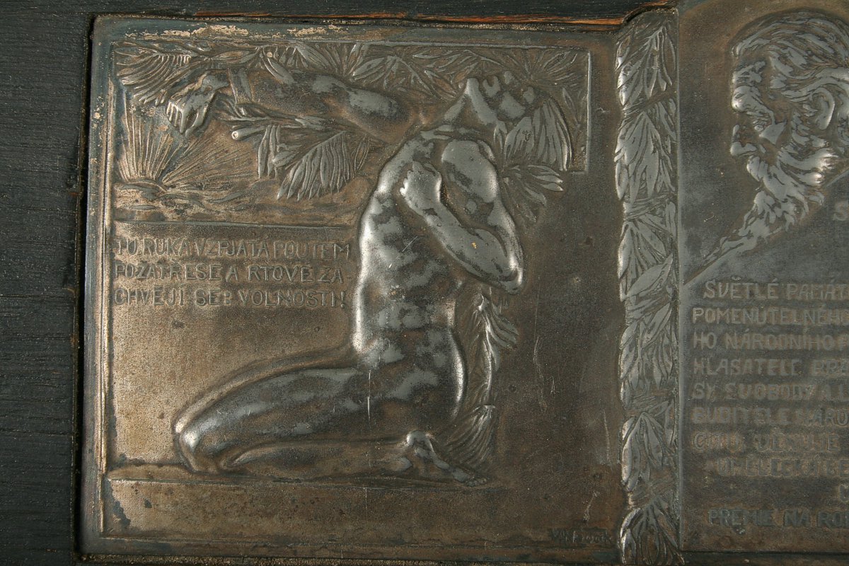 plaketa Sv. Čecha secesně stylizovaná s alegoriemi po stranách, autor Václav Novák (1880 – 1917), vytvořeno jako prémie Umělecké besedy v Praze na rok 1910, litý obecný kov, značeno V. Novák, adjustováno do desky z černě mořeného dřeva, 22 x 33 cm