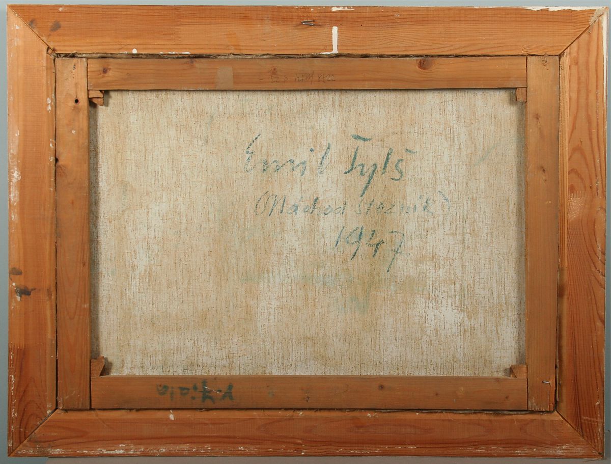 cesta s koňským povozem v Náchodě za ekonomickou školou u Metuje, olej na plátně, ve výřezu 48 x 68 cm s rámem 64 x 84 cm, autor Emil Tylš, podepsáno vzadu s dedikací Emil Tylš Náchod Slezník 1947, rámováno