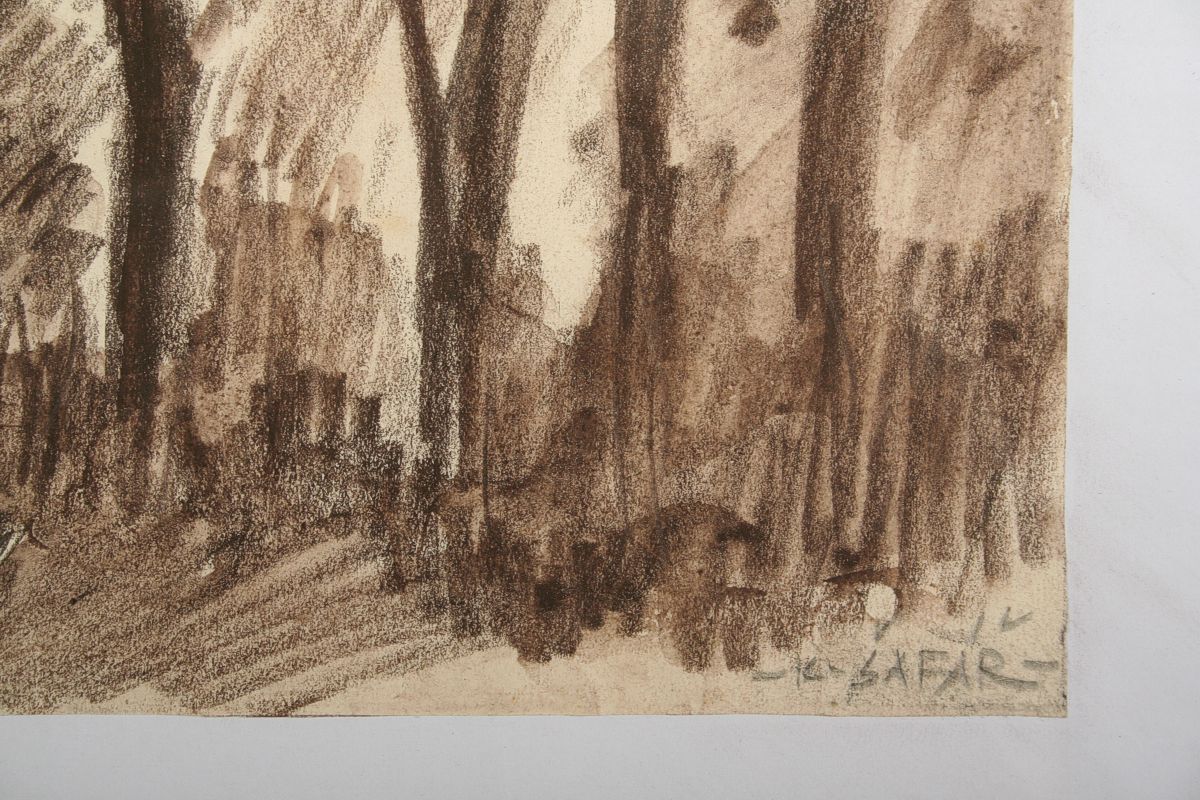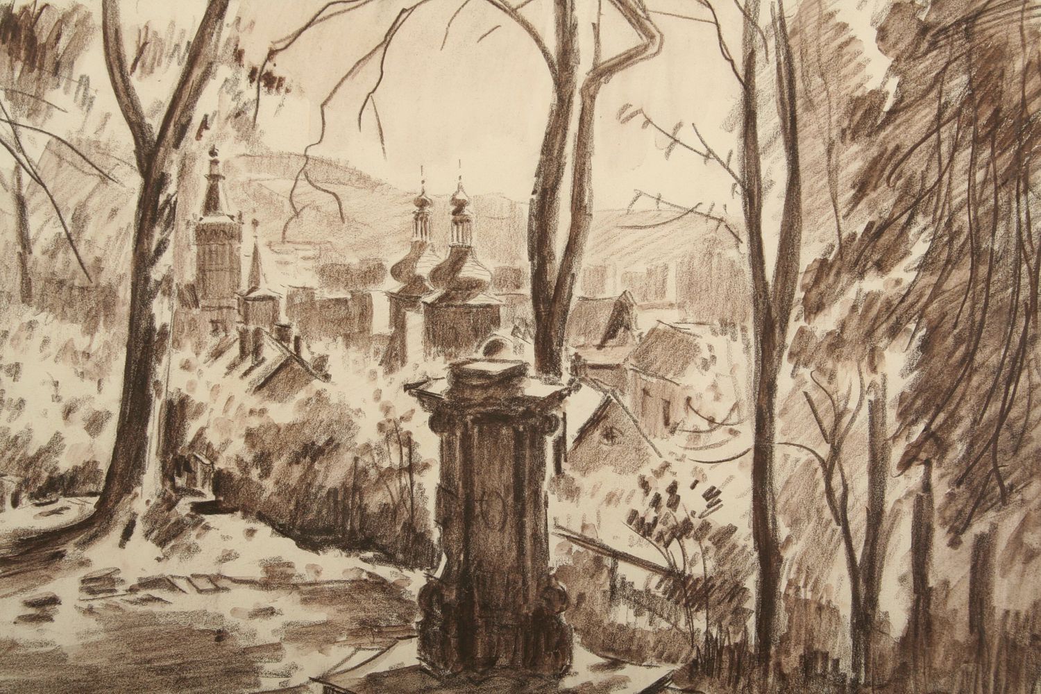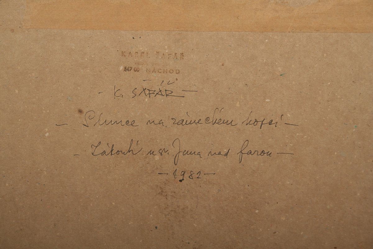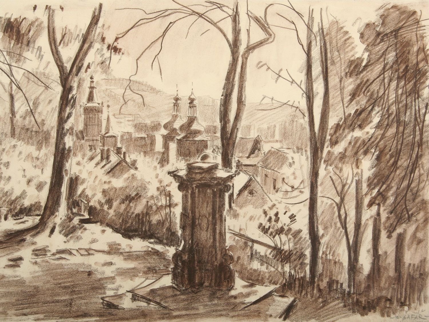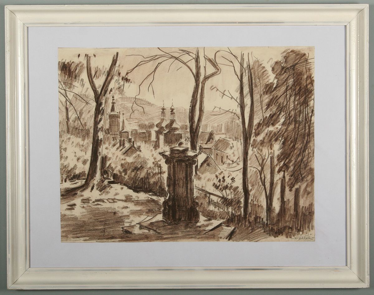 pohled na náchodské náměstí ze zámeckého kopce od sv. Jana nad farou, lavírovaná kresba rudkou na papíře, ve výřezu 35 x 45 cm s rámem 50 x 64 cm, autor Karel Šafář podepsáno vpravo dole K.Šafář ze zadu autorský přípis s datací, rámováno v paspartě a rámu pod sklem