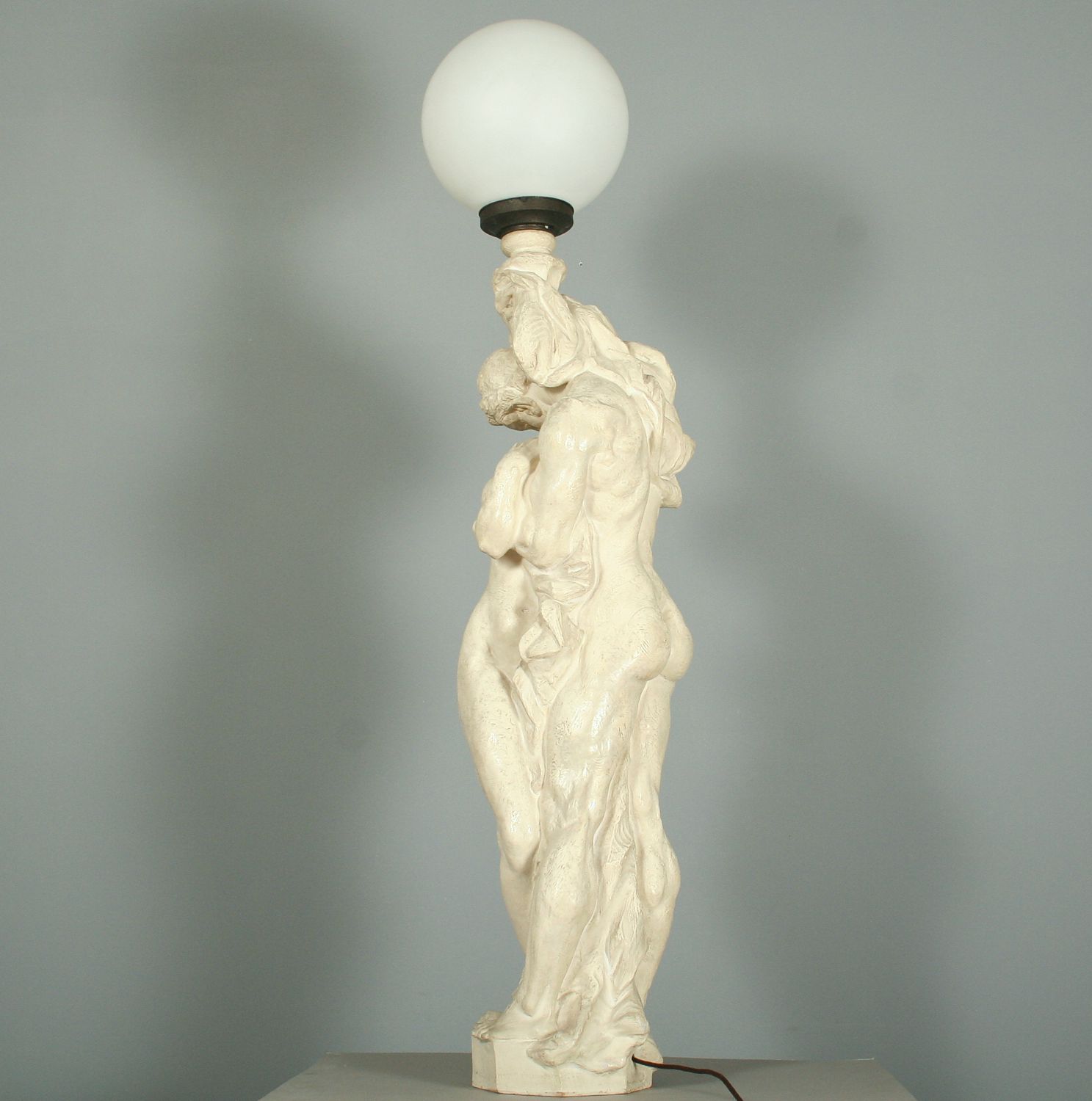 veliká figurální lampa s motivem milenců, patinovaná keramika značená Bechyně číslo modelu 525, autor Karel opatrný, výška 150 cm, podepsáno na podstavci Opatrný, původní skleněné stínidlo, funkční stav