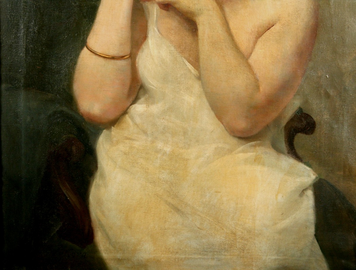 obraz cudné dívky při raní toaletě v interieru, olej na plátně 78 x 64 cm s rámem 98 x 84 cm, autor Gustav Sýkora, podepsáno vlevo dole G. Sýkora, rámováno v původním zdobeném rámu, obraz pochází z významné náchodské pozůstalosti