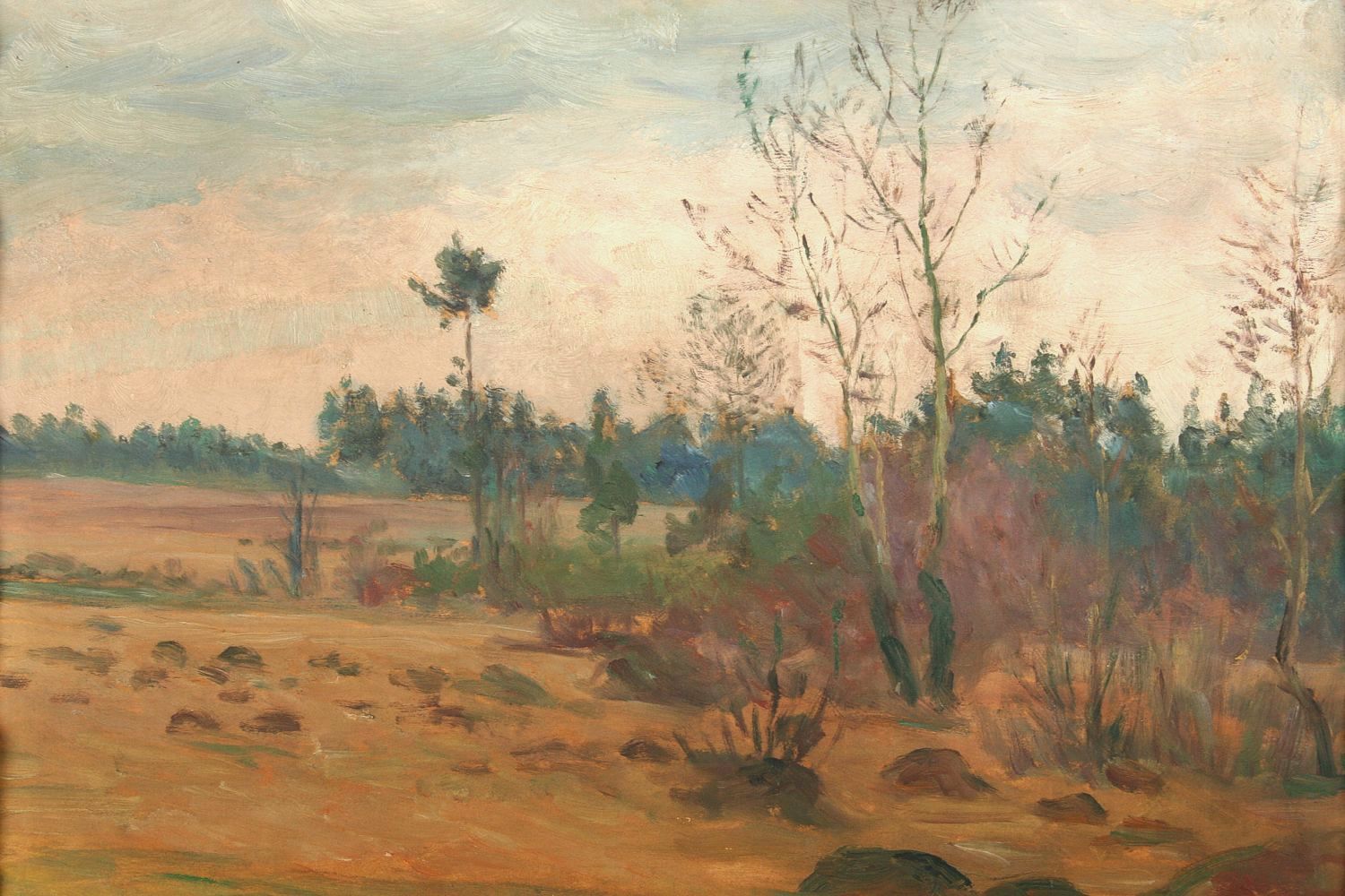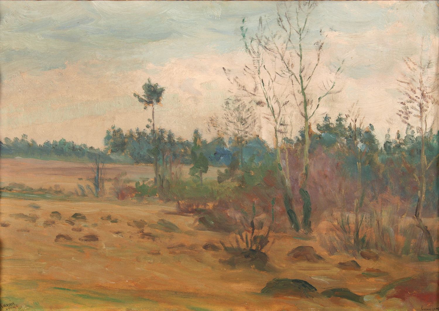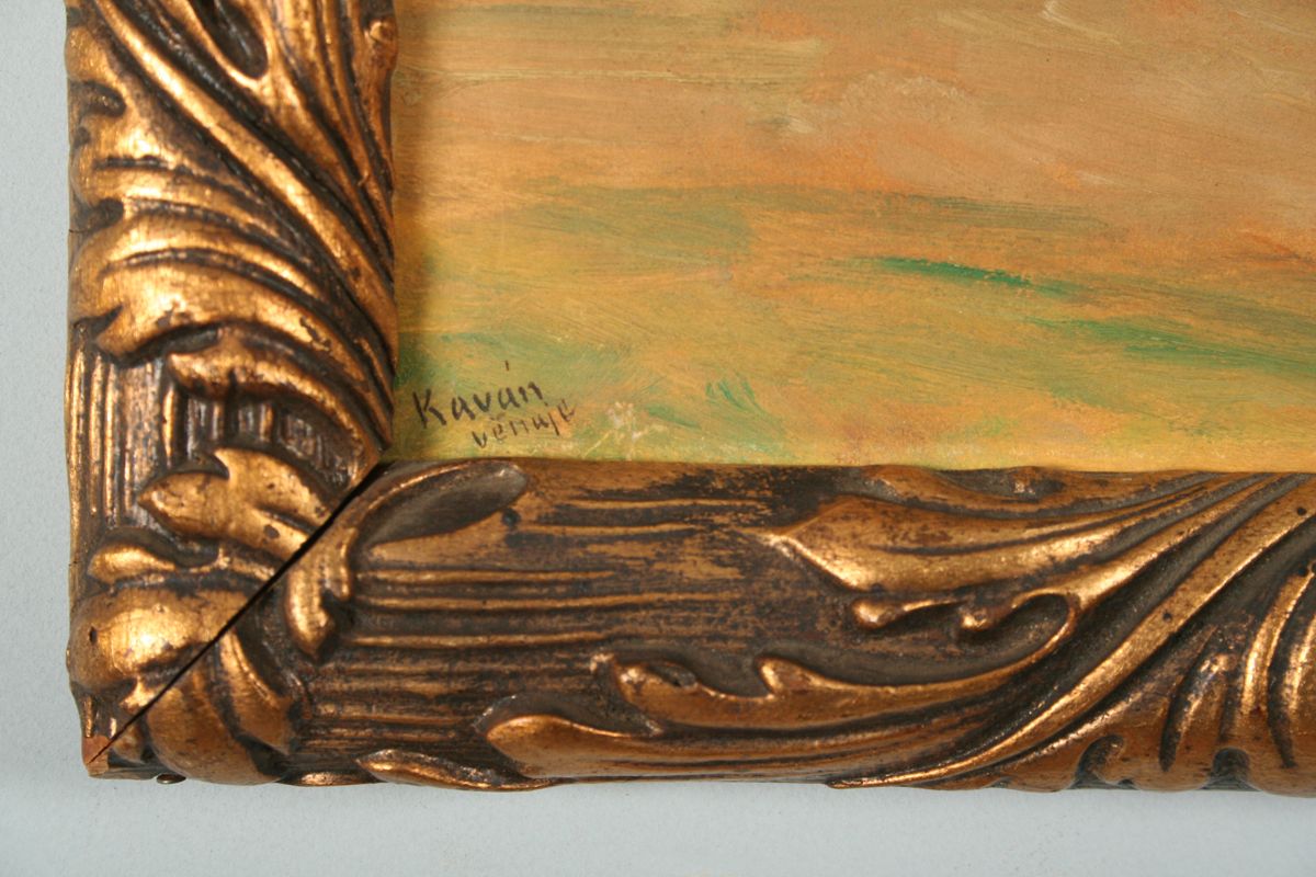 obraz krajiny v časném jaru okolo roku 1905, olej na tenké lepence, 27 x 38 cm s rámem 33 x 44 cm, autor František Kaván, podepsáno vlevo dole Kaván věnuje a vpravo přípis Časné jaro, rámováno v původním rámu, autorství a dedikace konzultována a potvrzena PhDr. Michaelem Zachařem, vzácně se vyskytující ranná práce Fr. Kavána okolo roku 1905, obraz pochází z významné náchodské pozůstalosti