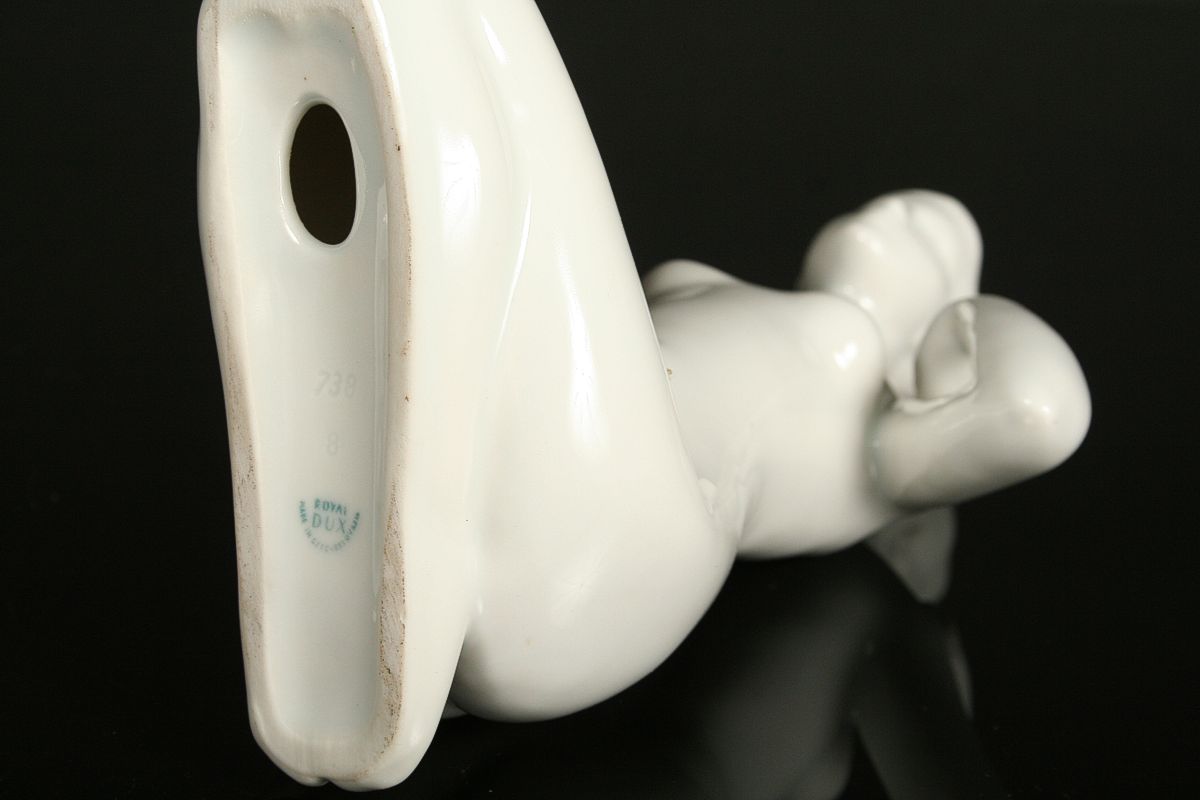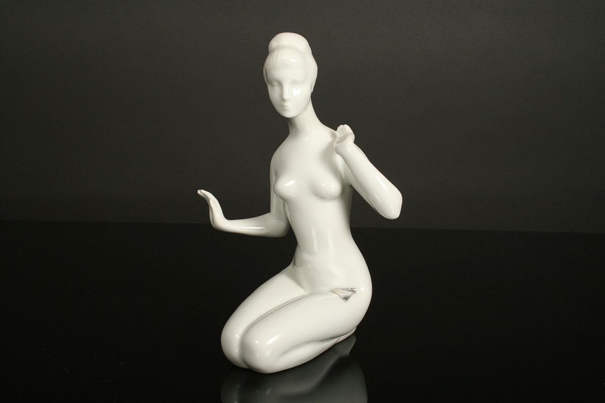 stylizovaná soška, sedící dívčí akt 60. léta tzv bruselský styl, bílý porcelán glazovaný značený na dně starou tištěnou značkou Royal DUX Duchcov, 50 - 60. léta 20. století, koncem 70. let se již tato značka nepoužívala, výška 18 cm