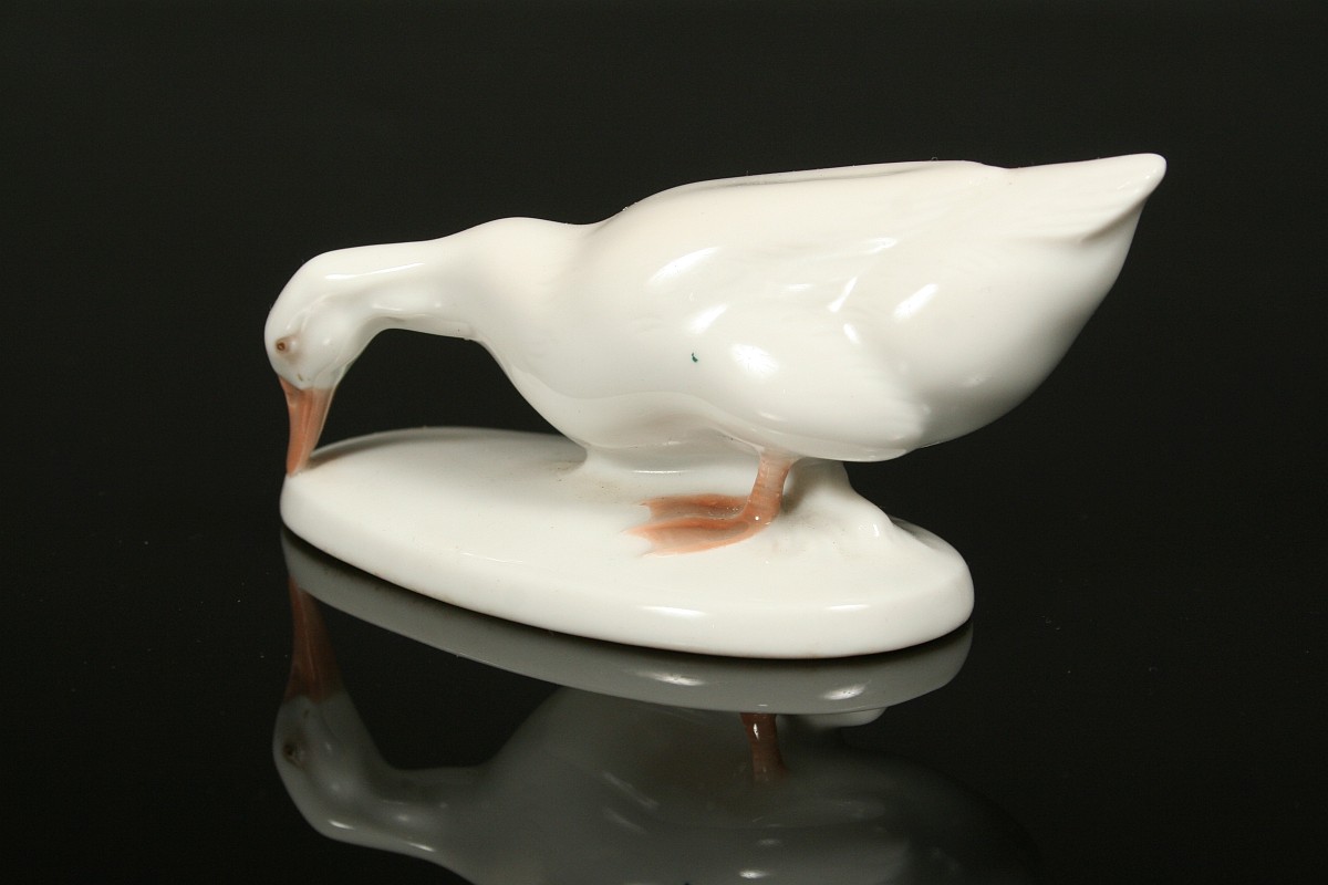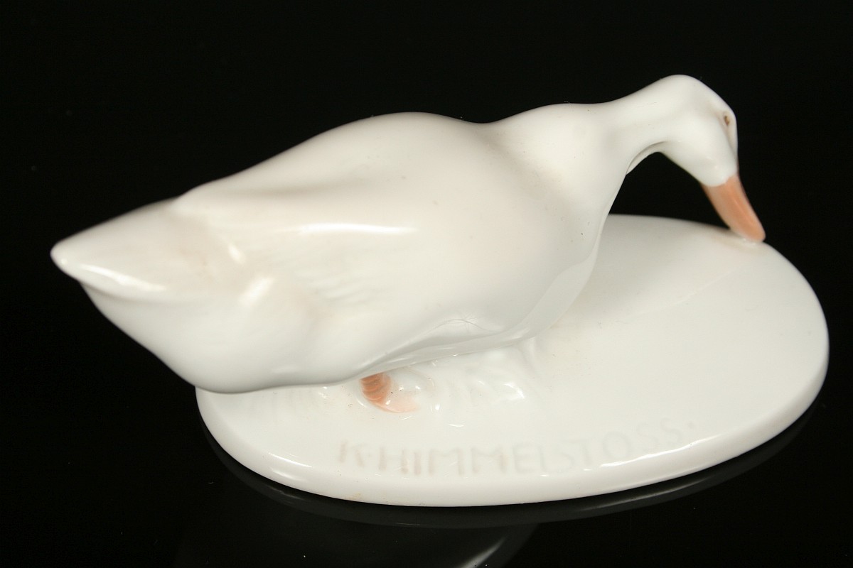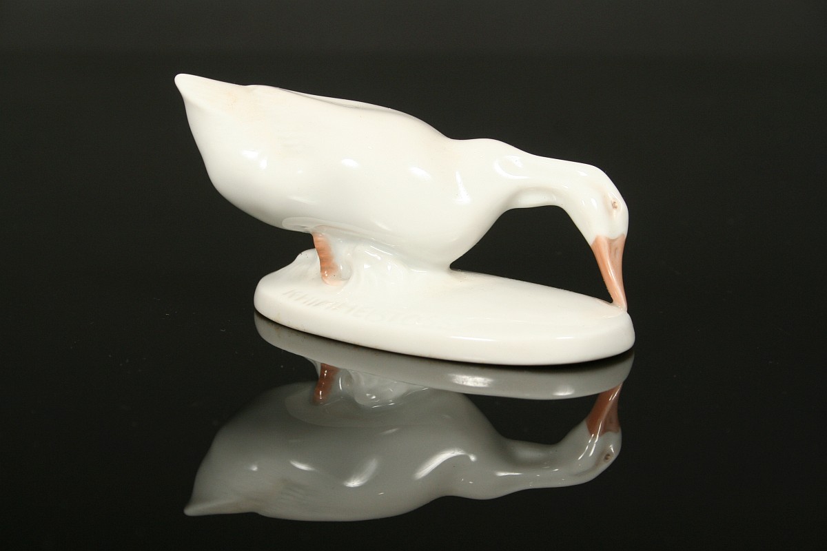 porcelánová figurka domácí kačenky, malovaný porcelán na dně značený tištěnou značkou Rosenthal a tlačenými čísly, návrh číslo K. 172, autor K. Himmelstoss, 1. polovina 20. století, značeno na podstavci tlačené K. Himmelstoss, 5 x 10 cm, bez poškození v perfektním stavu