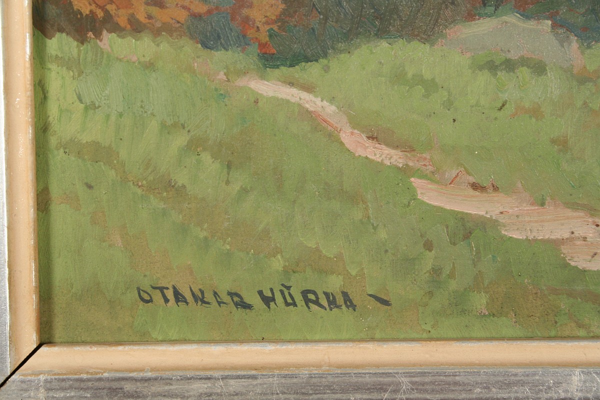 obraz krajiny s cestou, olej na kartonu, 34 x 49 cm, s rámem 49 x 64 cm, autor Otakar Hůrka, podepsáno vlevo dole Otakar Hůrka, rámováno v původním rámu