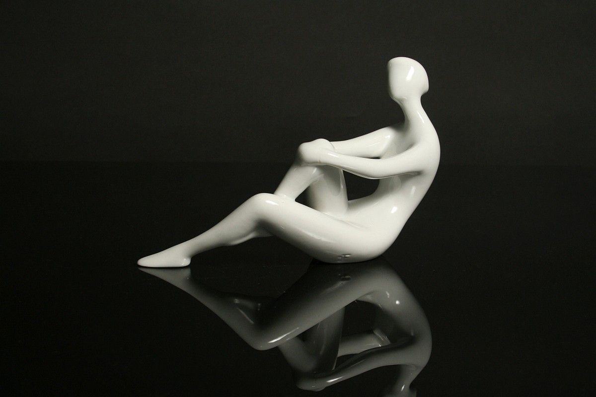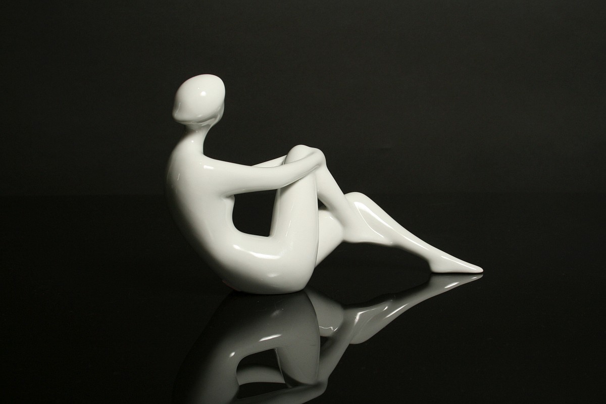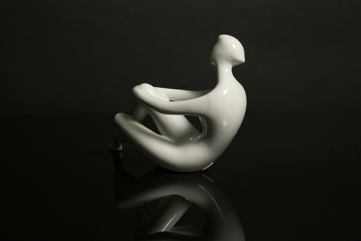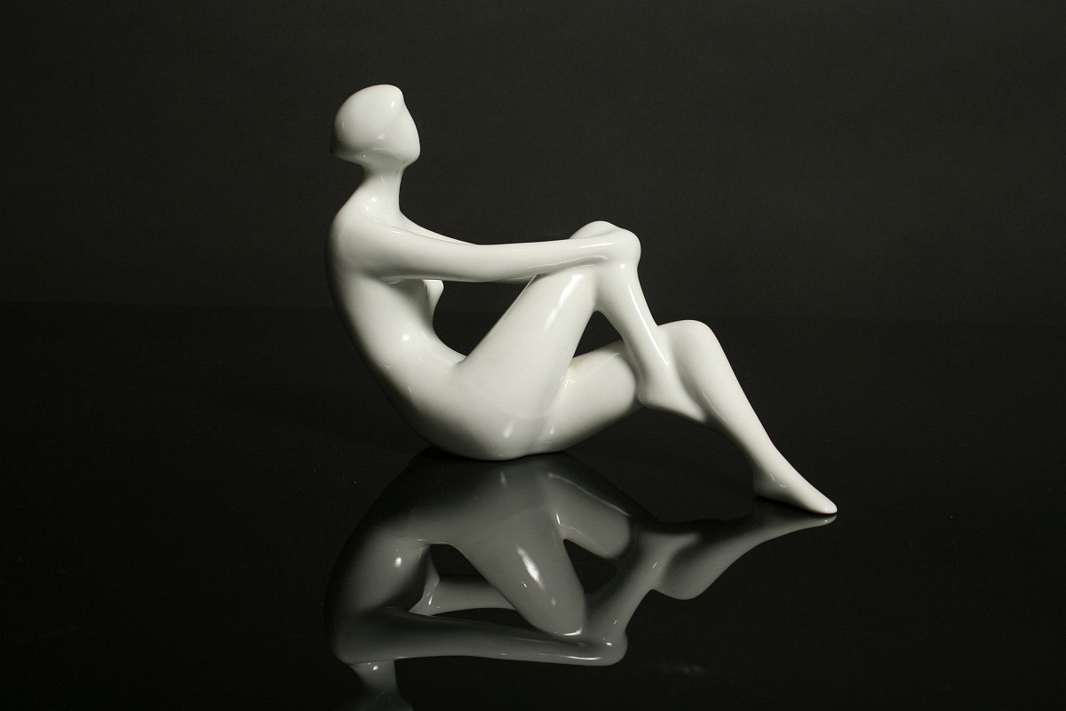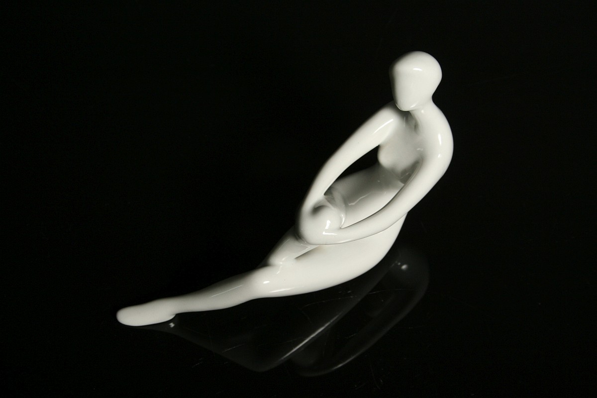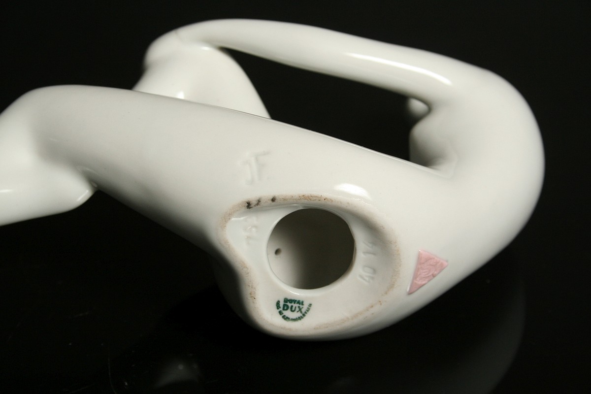 soška dívčího aktu, bílý glazovaný porcelán, autorka návrhu Jitka Forejtová, značené tlačeným monogramem JF, tlačené číslice, značená na dně starou tištěnou značkou do podkovy Royal DUX Duchcov 60. léta 20. století, koncem 70. let se již tato značka nepoužívala produkce Royal DUX Duchcov 60. léta 20. století, tzv bruselský styl, výška 13,5 x 21 cm