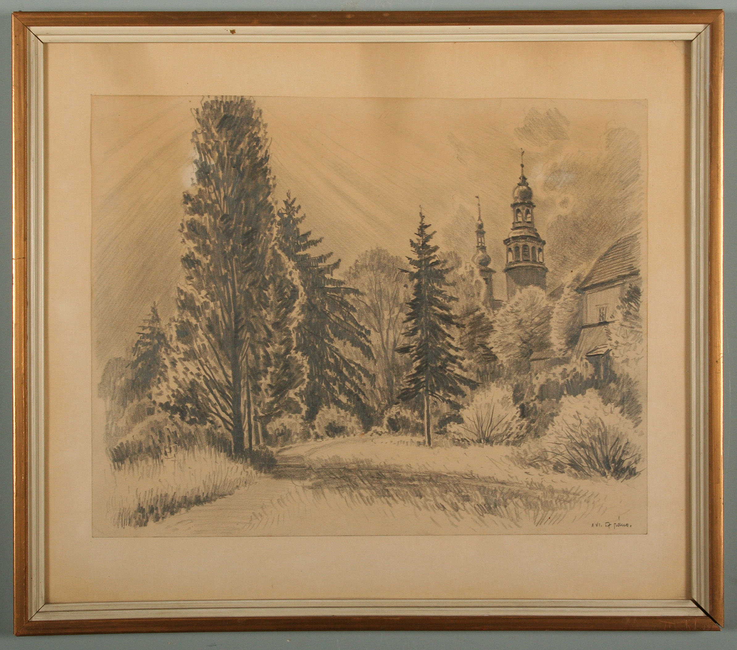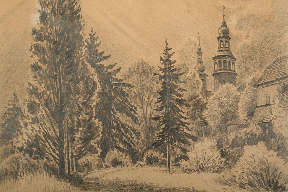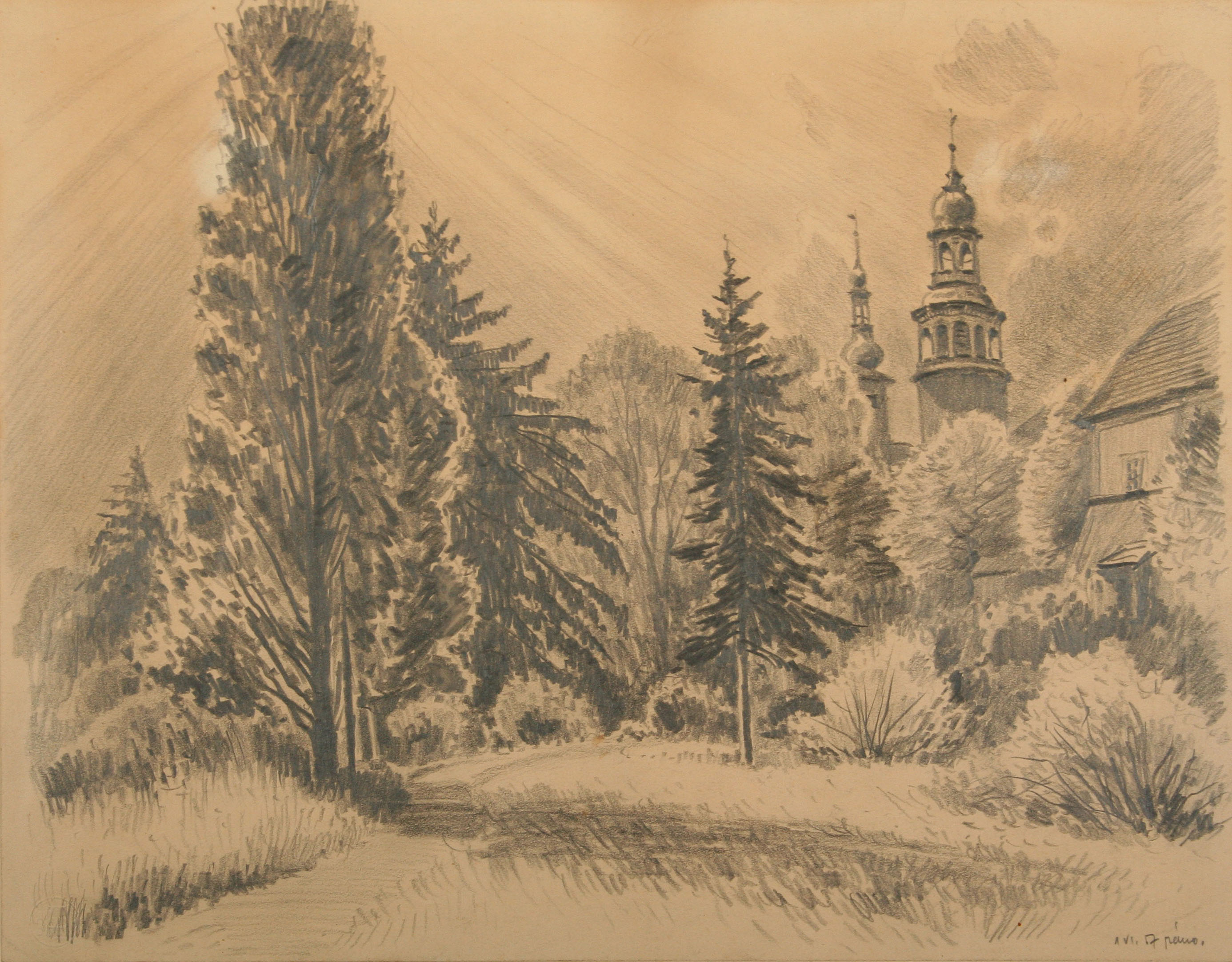 ranní pohled do východní zahrady náchodského zámku, kresba úhlem na papíře, ve výřezu 26 x 33 cm s rámem 37 x 42 cm, autor Karel Šafář značeno dedikací vpravo dole 1.7.57 ráno, papír značen slepotiskovým razítkem H ECO, rámováno v paspartě a rámu pod sklem