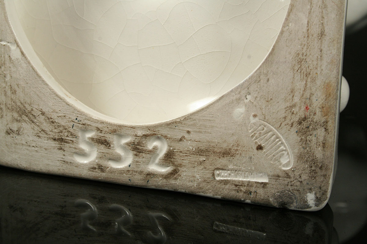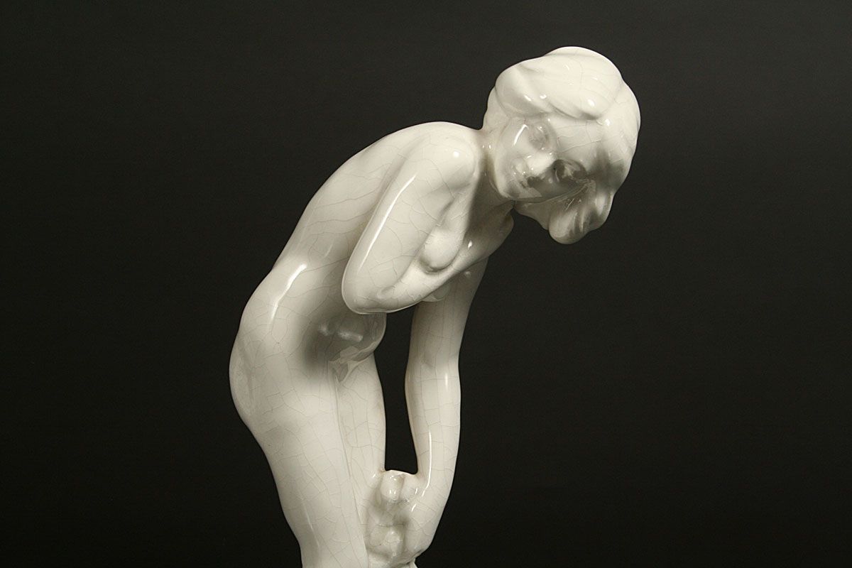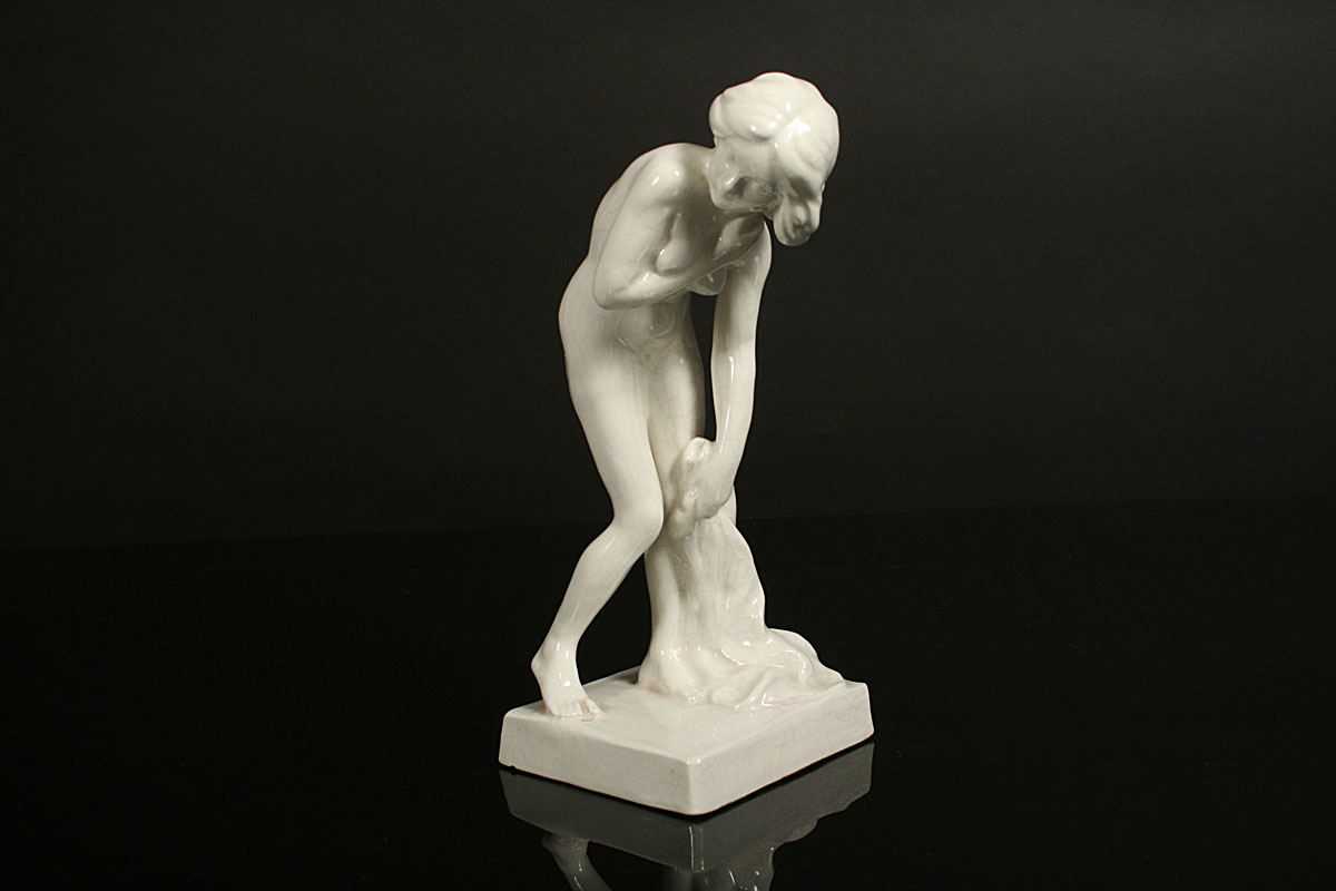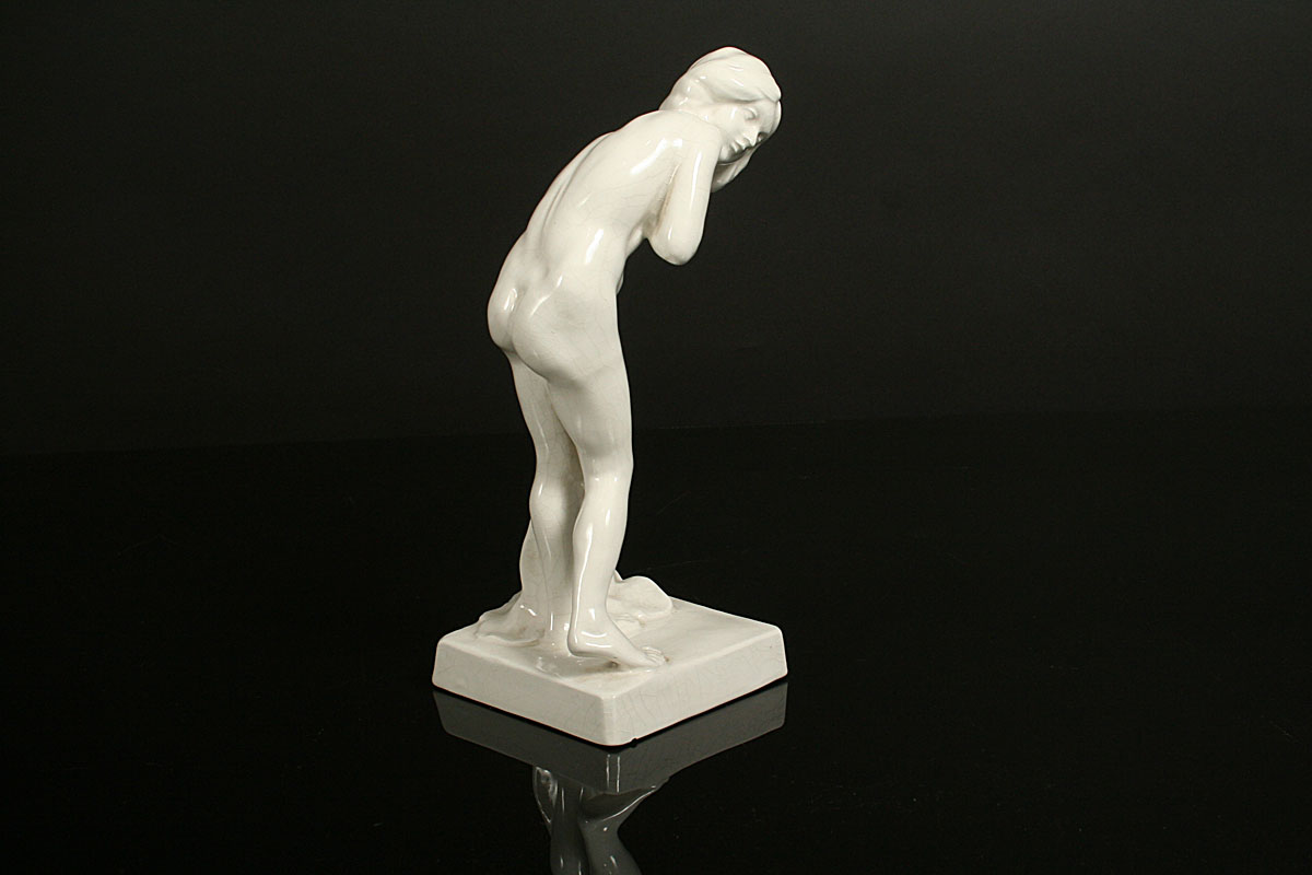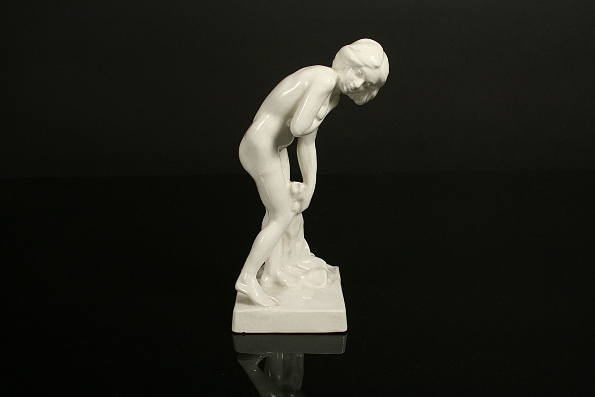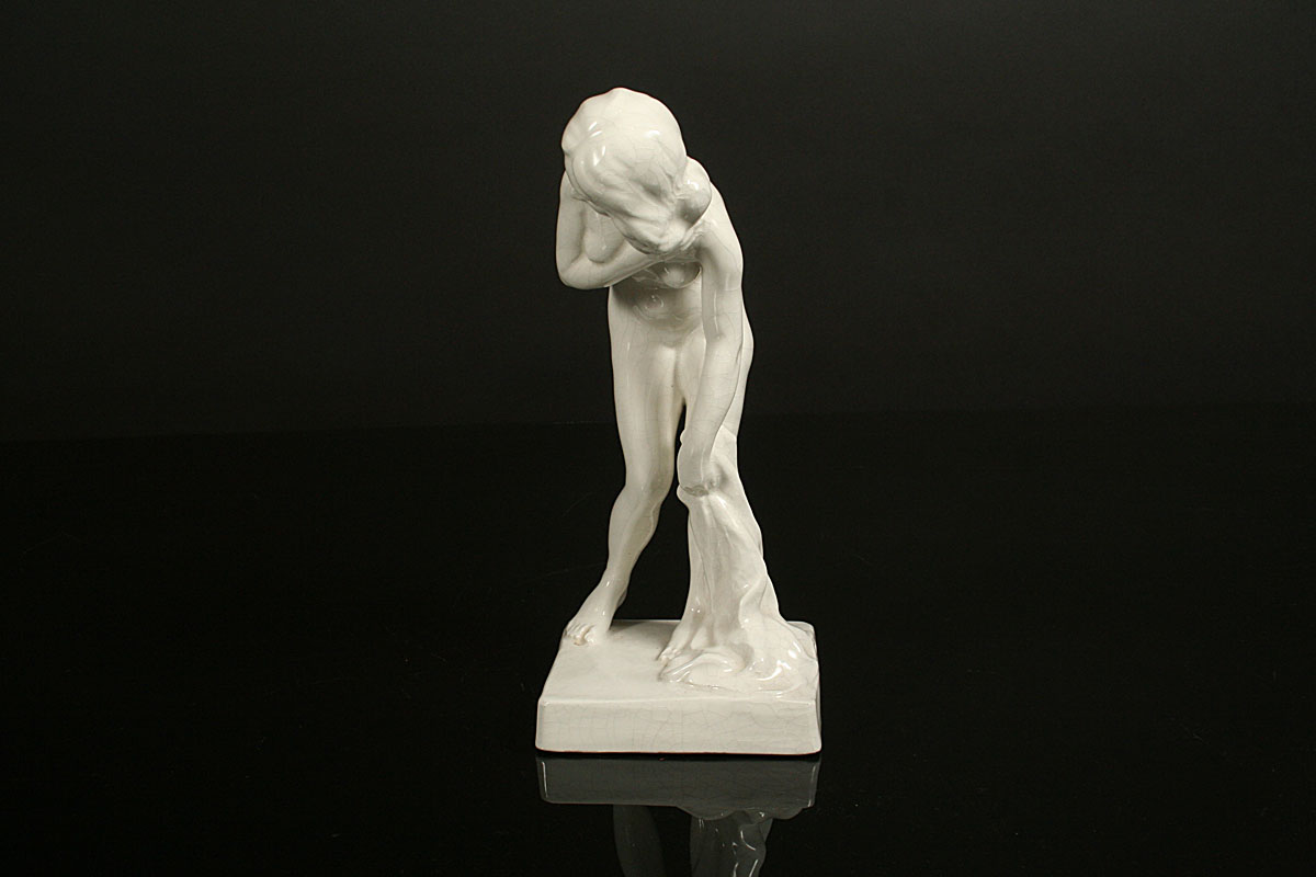 soška dívčího aktu "Po koupeli", bílá glazovaná keramika, autor Emanuel Julian Kodet, značená na dně výrobcem Graniton, 23,5 cm