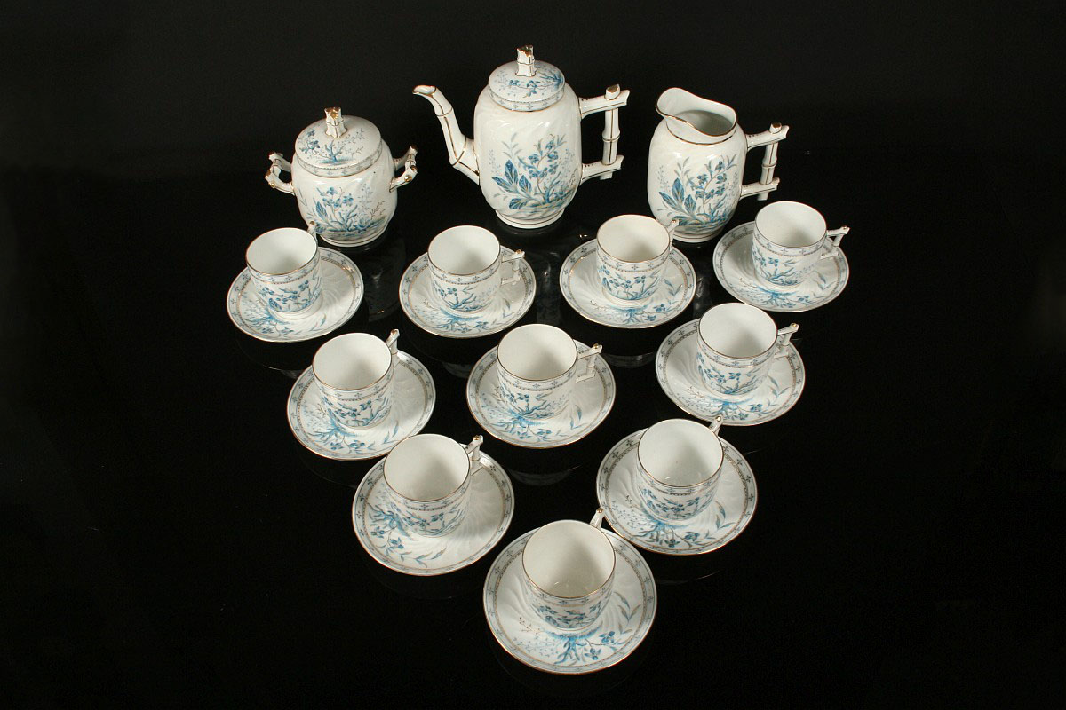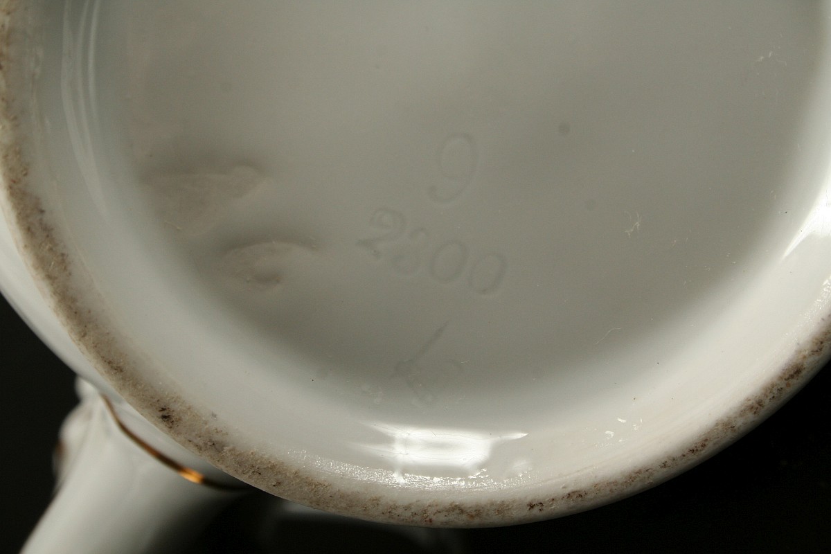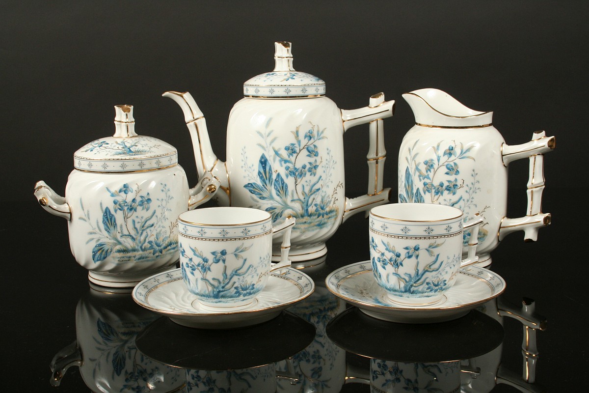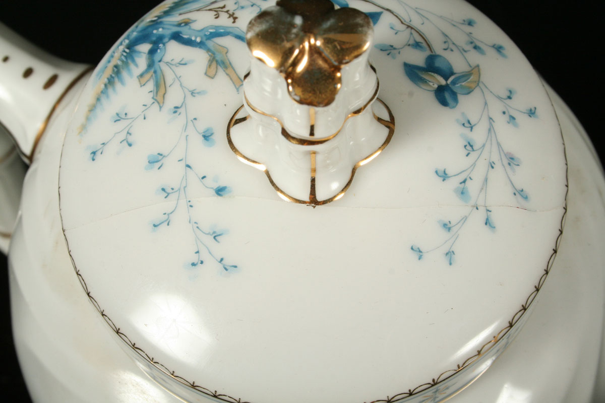 deseti osobní čajový / kávový servis s ručně malovaným florálním dekorem a zlacenými detaily, bílý porcelán, velká konvice s víčkem, menší konvice na mléko, cukřenka s víčkem, deset šálků s podšálky, značeno čísly a tlačenou značkou Loket z 19. století, výška konvice 22 cm, bez otluků, prasklé víčko konvice a vlas na jednom šálku viz foto (není okem téměř vidět)