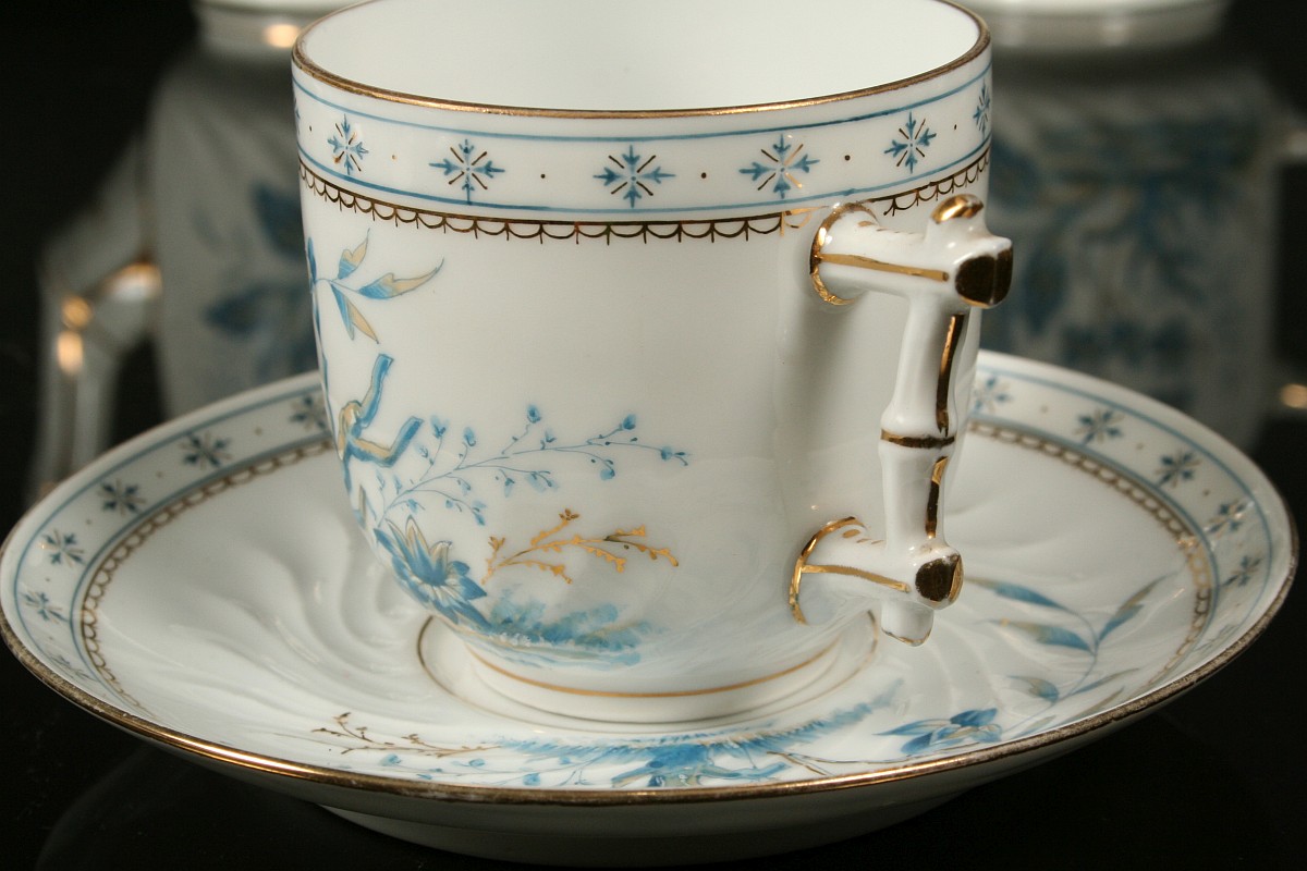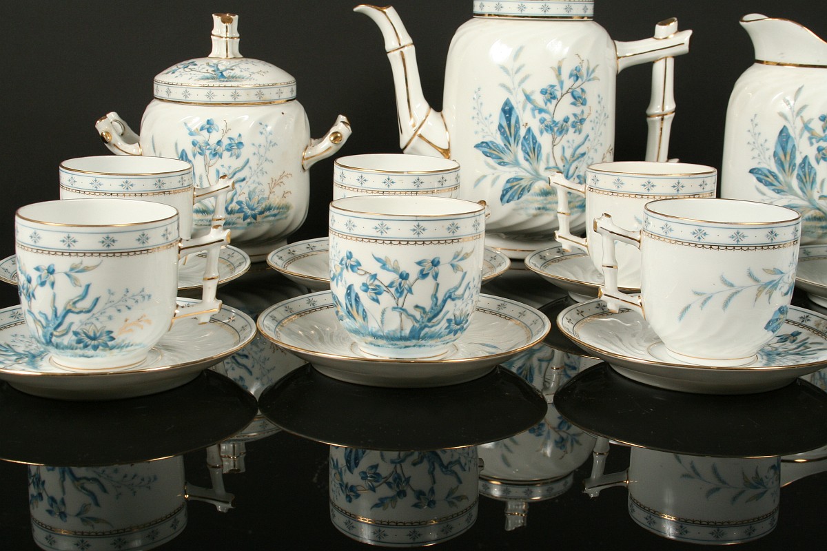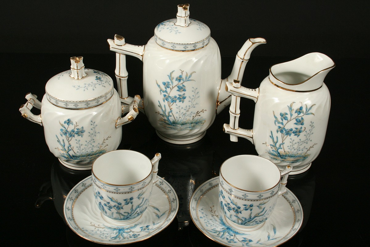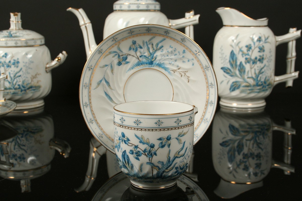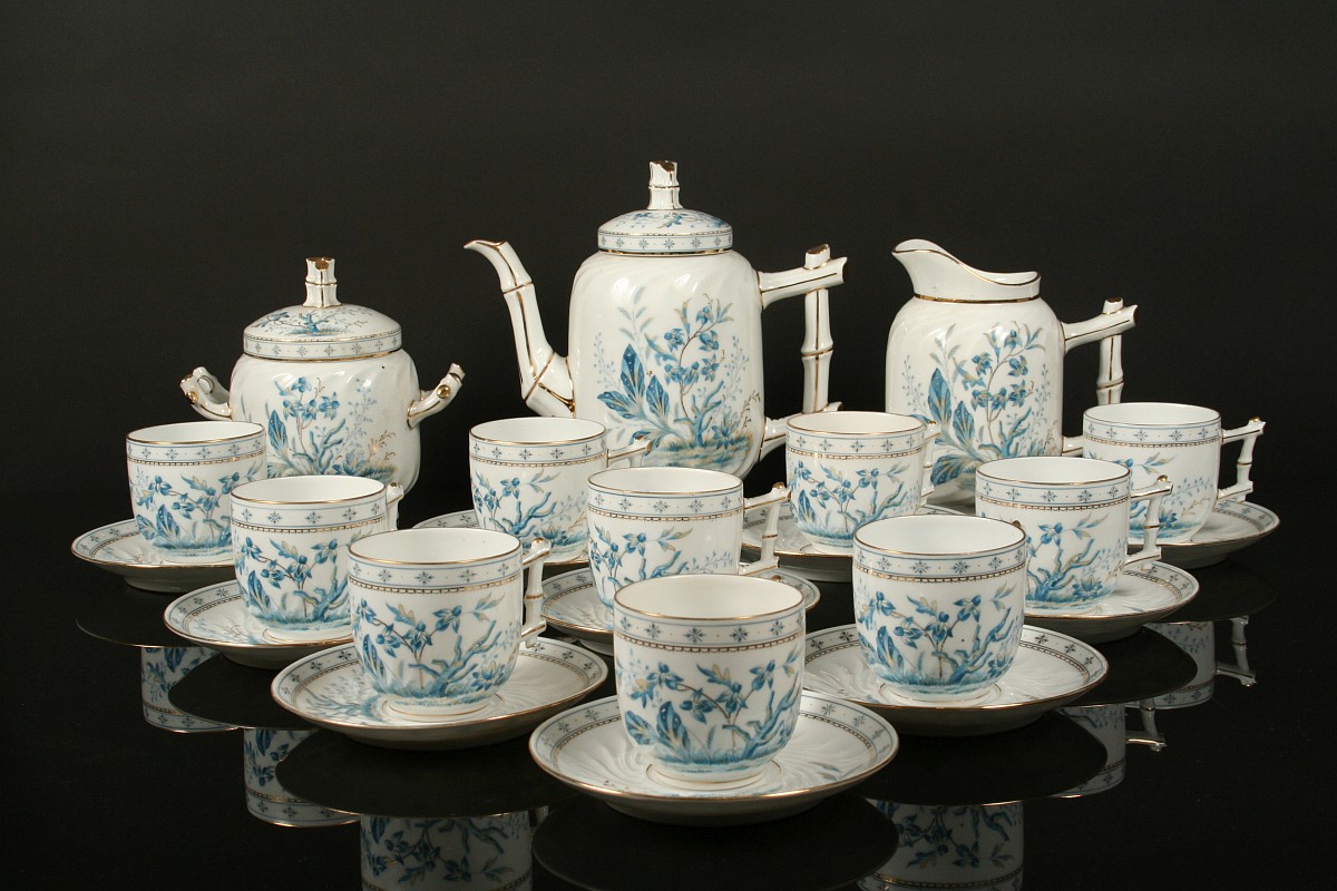 deseti osobní čajový / kávový servis s ručně malovaným florálním dekorem a zlacenými detaily, bílý porcelán, velká konvice s víčkem, menší konvice na mléko, cukřenka s víčkem, deset šálků s podšálky, značeno čísly a tlačenou značkou Loket z 19. století, výška konvice 22 cm, bez otluků, prasklé víčko konvice a vlas na jednom šálku viz foto (není okem téměř vidět)