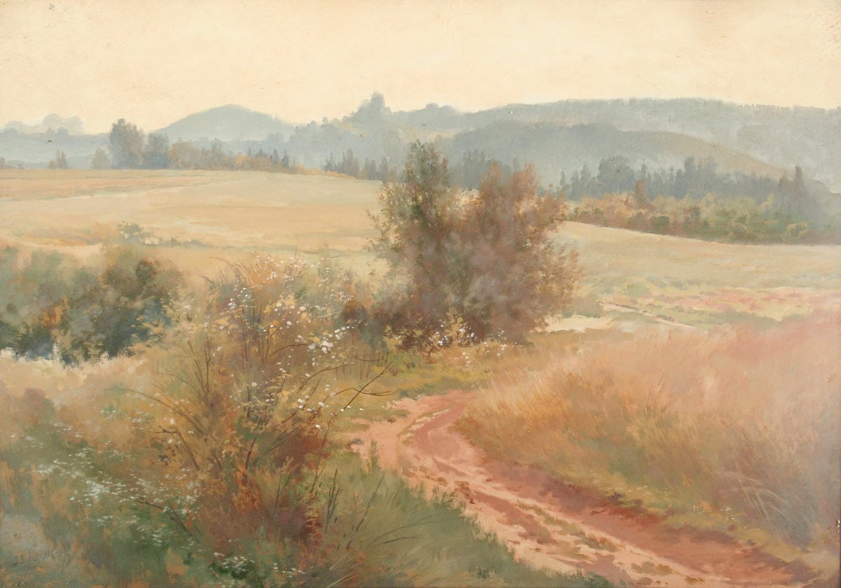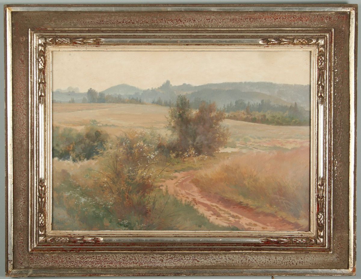 obraz krajiny s vysokým horizontem, rozkvetlým keřem a cestou do polí, olej na kartonu 35 x 50 cm, s rámem 51 x 67 cm, autor Josef Soukup, podepsáno vlevo dole Jos. Soukup, na zadní straně atorské štítky a dedikace, zcela původní adjustace