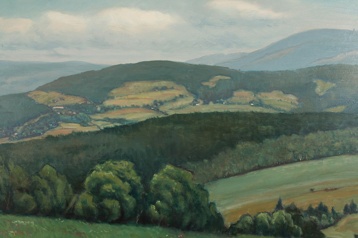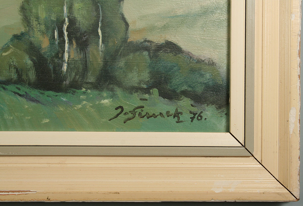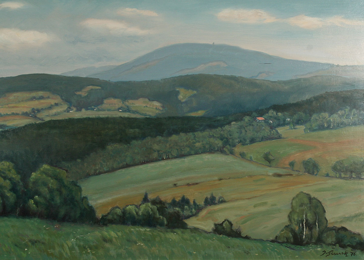 obraz hornaté krajiny, olej na desce 55 x 112 cm s rámem 66 x 122 cm, autor Jindřich Šimek, podepsáno vpravo dole J. Šimek 75 a ze zadu na desce autorský štítek, rámováno