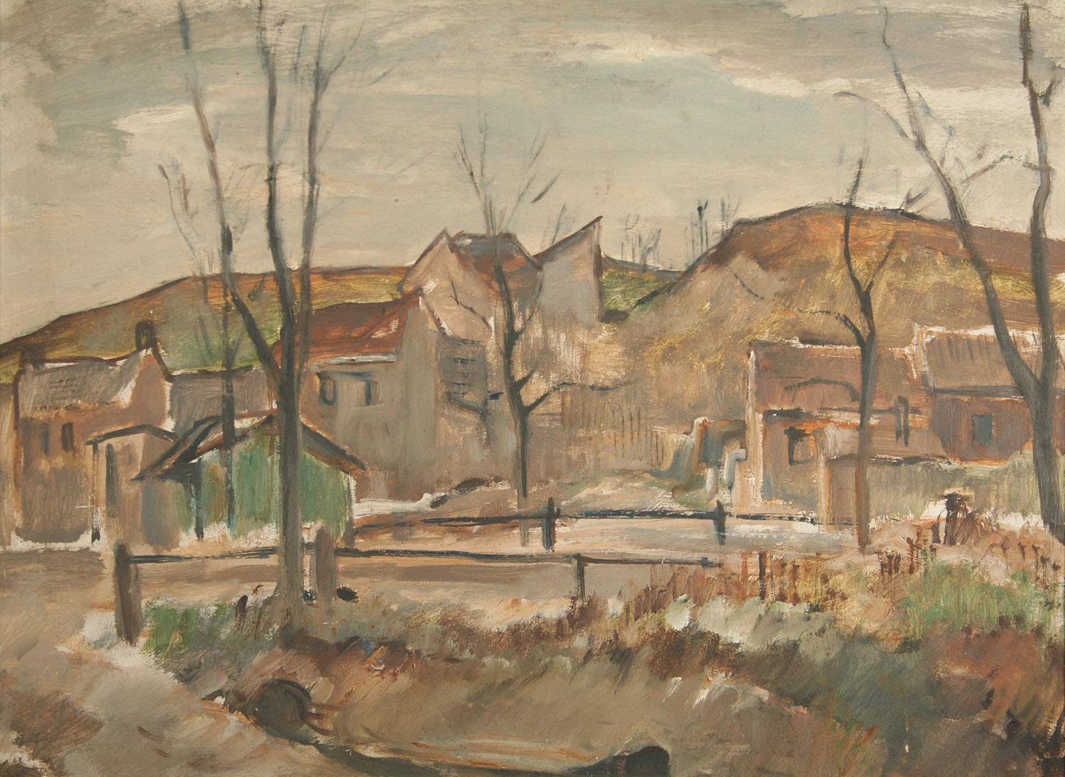 obraz periferie města, olej na kartonu, 48 x 64 cm, s rámem 62 x 78 cm, autor Emil Tylš podepsáno vlevo dole špatně čitelně E. Tylš, rámováno v původním stříbřeném rámu