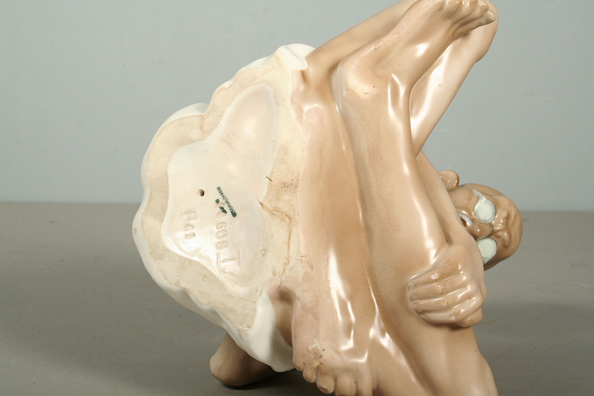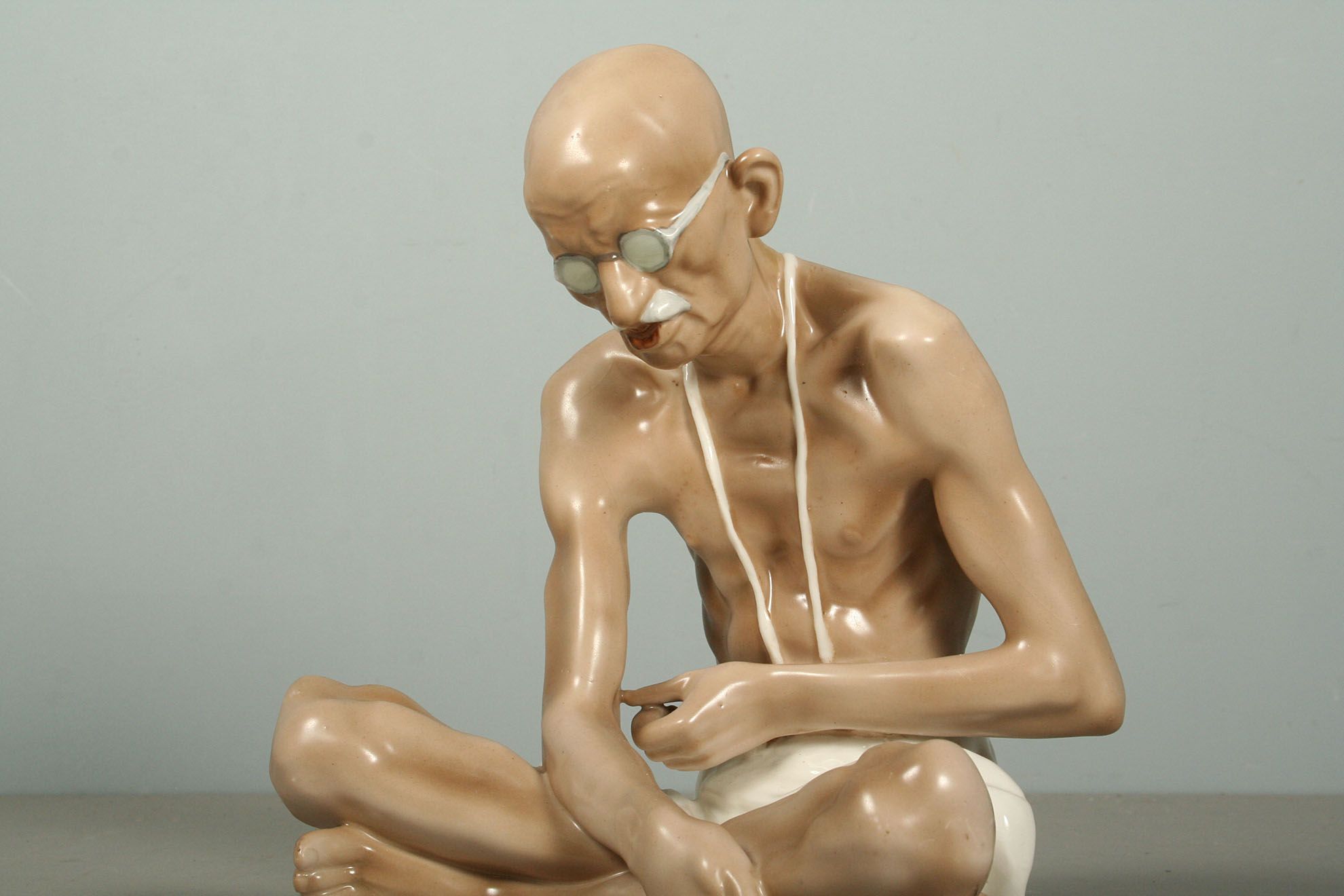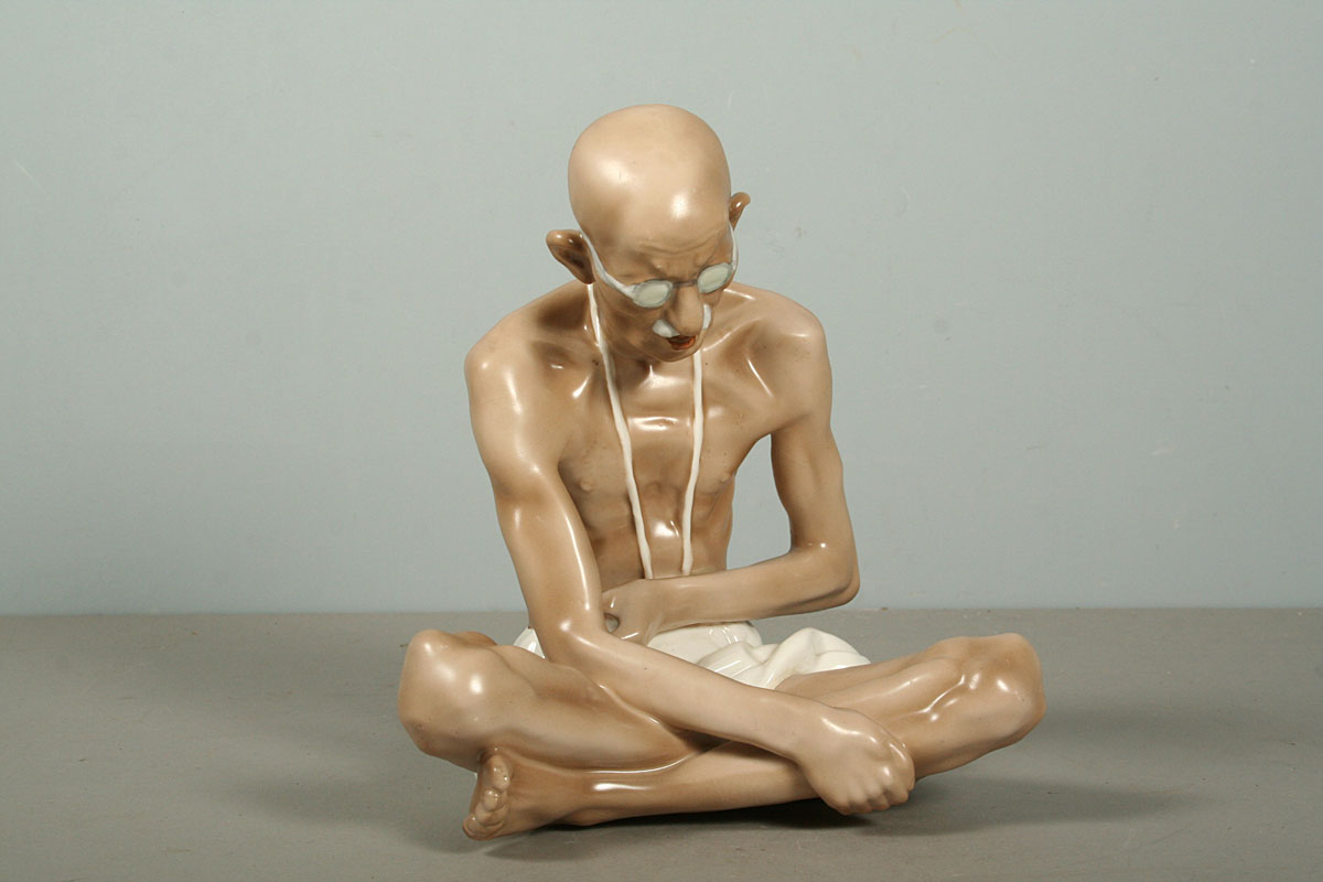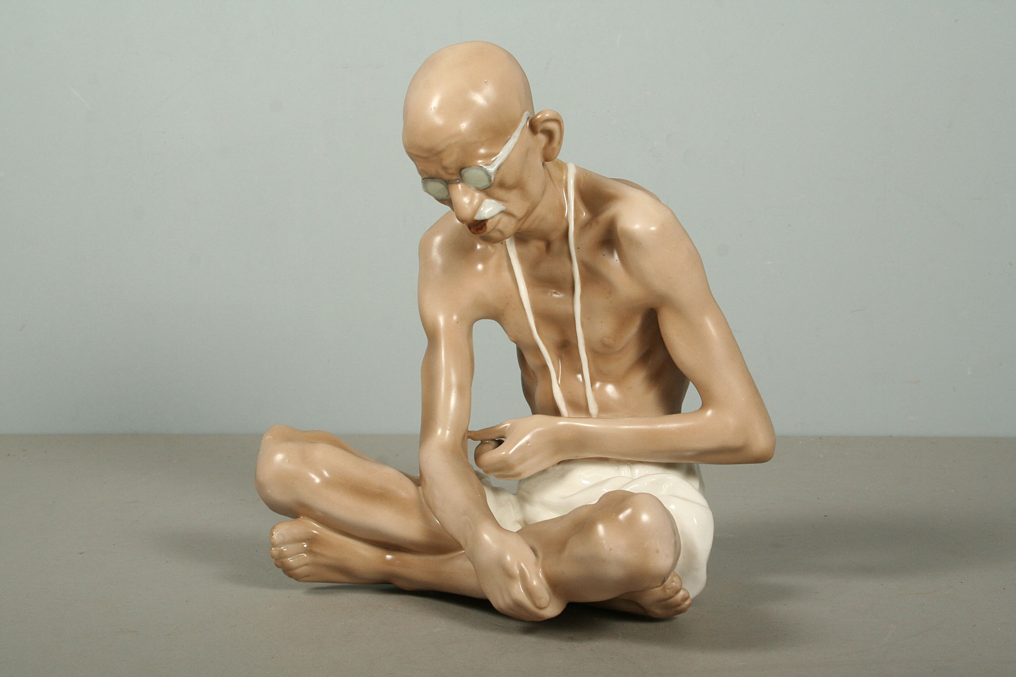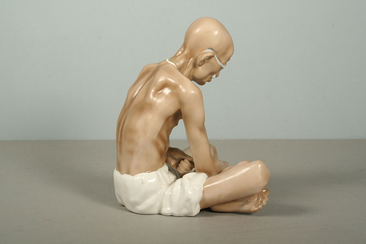 porcelánová socha Mahátma Gándhí, bílý porcelán malovaný, značeno tlačenými čísly a tištěnou značkou Royal DUX Duchcov, 22 x 20 cm