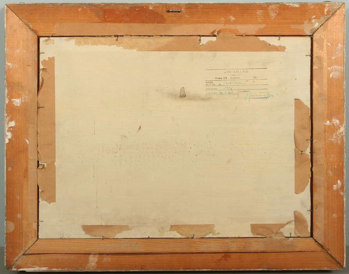 zátiší s miskou jablky a fíky, olej na kartonu 30 x 40 cm s rámem 41 x 51 cm autor Jiří Balling, podepsáno vpravo dole Balling Jiří, na zadní straně autorské razítko s přípisem, rámováno v původním zdobeném rámu pod sklem