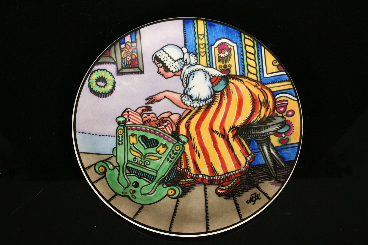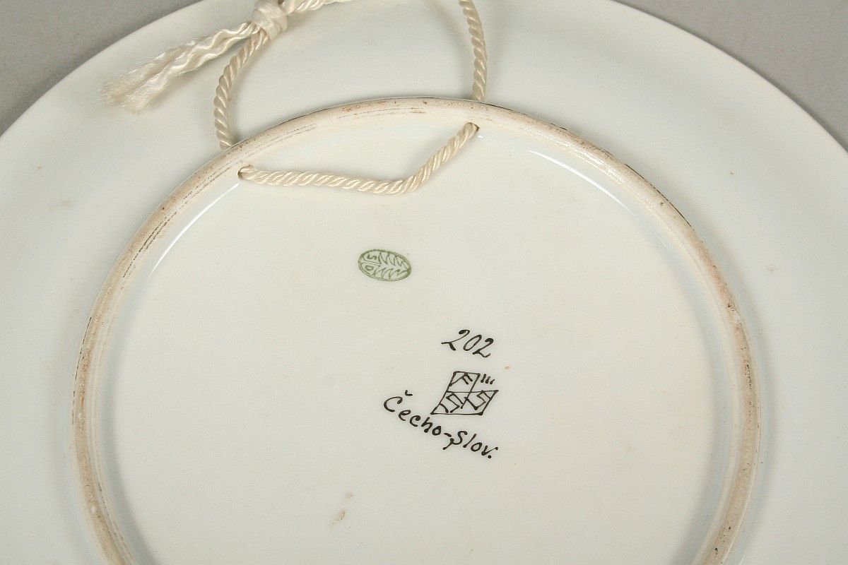 porcelánový závěsný talíř, ručně malovaný motiv Marie Fišerové-Kvěchové, značeno vpravo MFK, na zadní straně značka porcelánu, průměr 21,5 cm