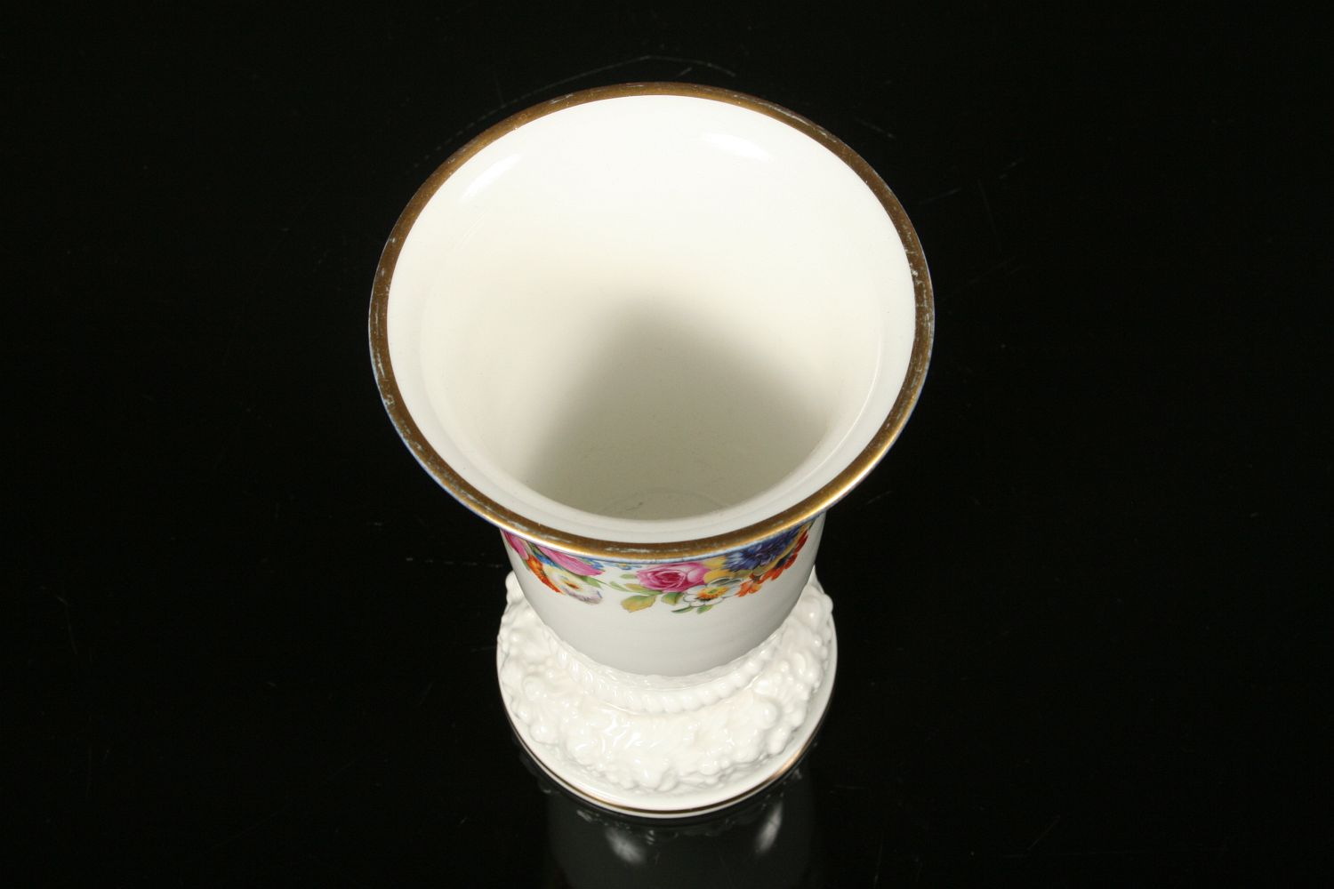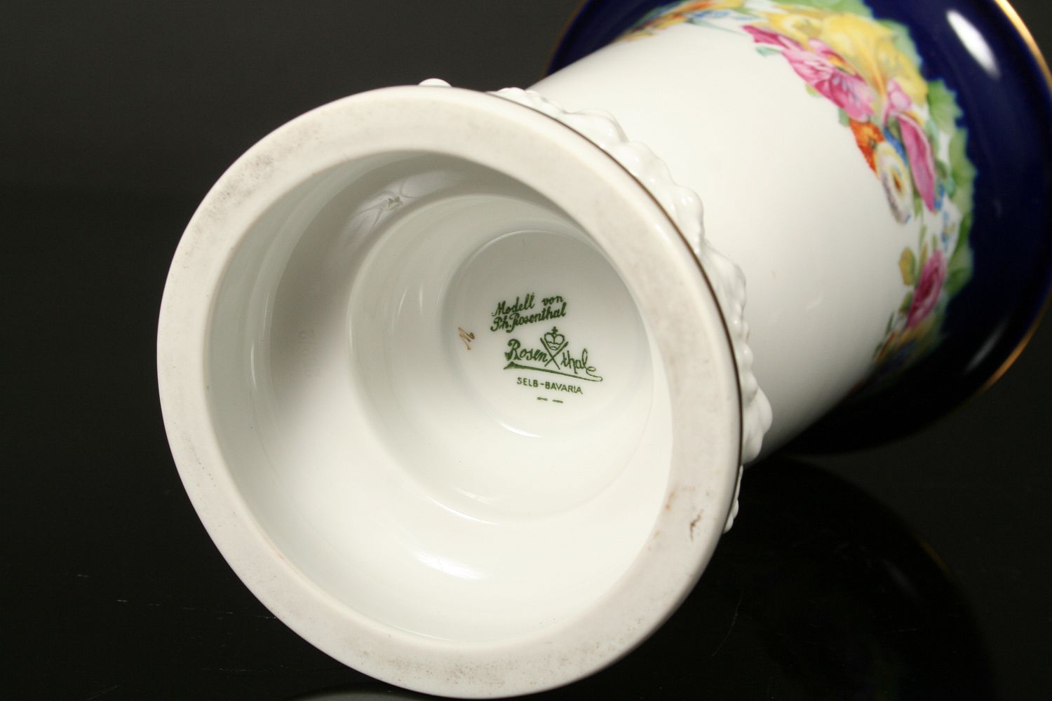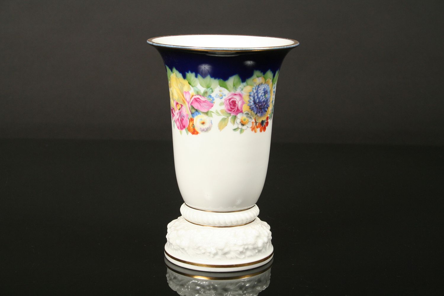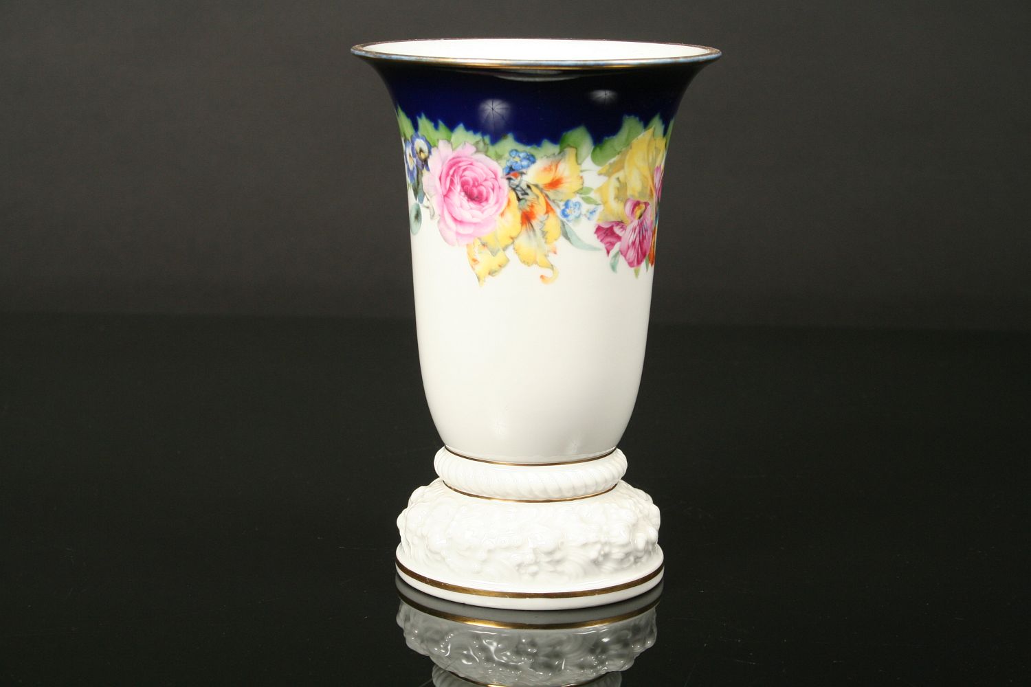 luxusní váza s květy, bílý glasovaný porcelán, dekorovaný kobaltem a květy, podstava plastický reliéf se zlacenými linkami, značeno na dně tištěnou značkou Rosenthal, Model von Ph. Rosenthal, 1. polovina 20. století, 17,5 cm