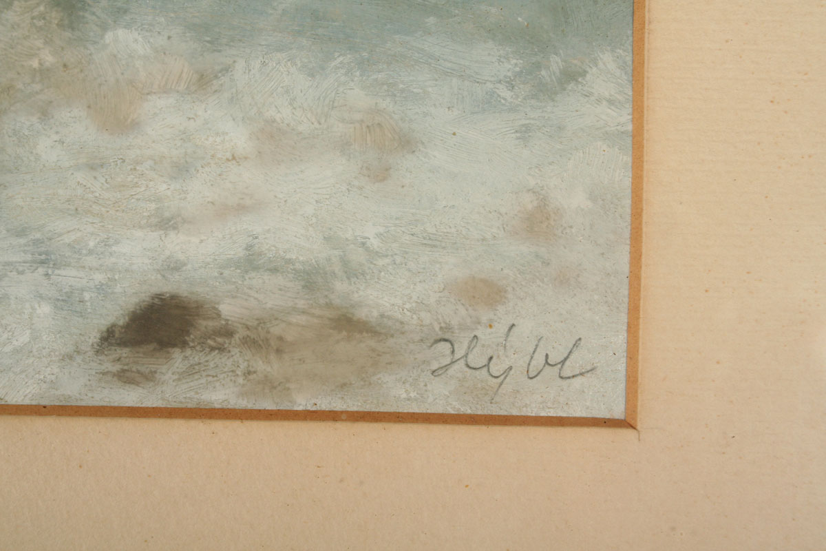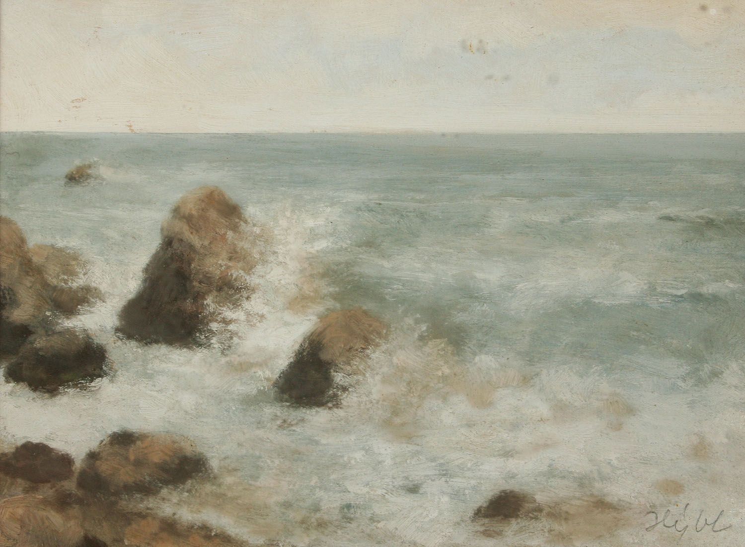 obraz moře s příbojem, olej na lepence 16 x 21 cm s rámem 35 x 41 cm, autor Karel Hýbl, podepsáno vpravo dole Hýbl, rámováno v původní paspartě a rámu pod sklem