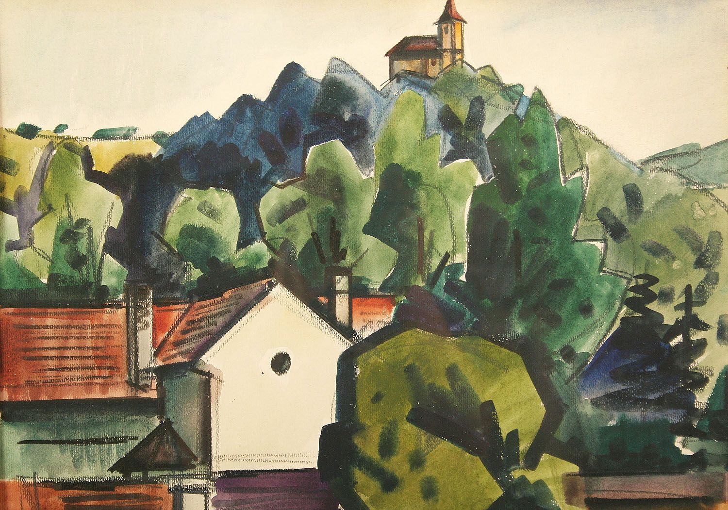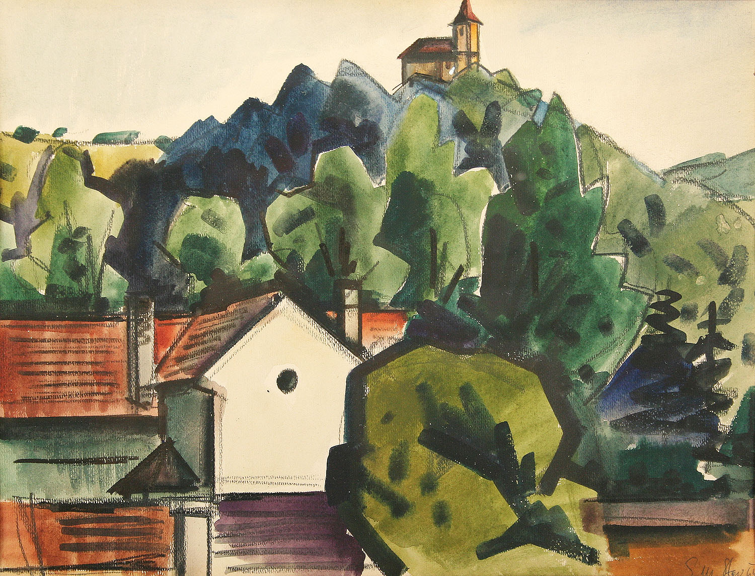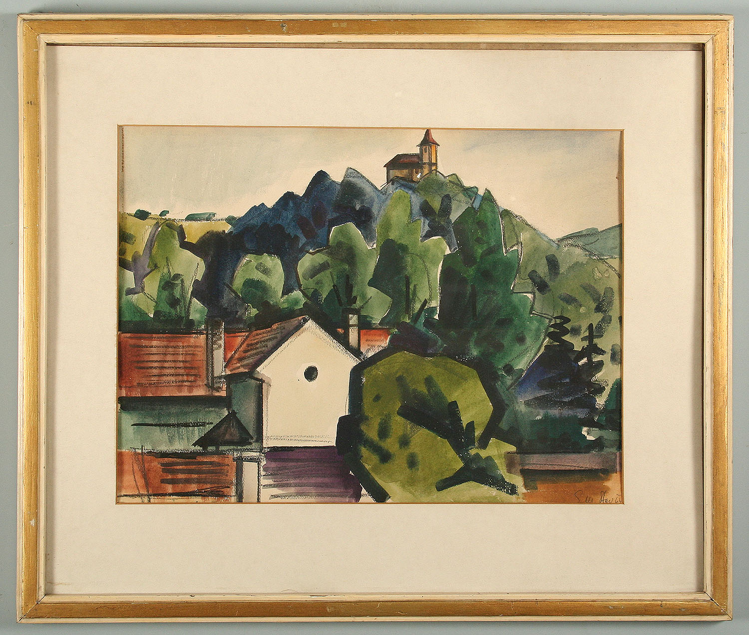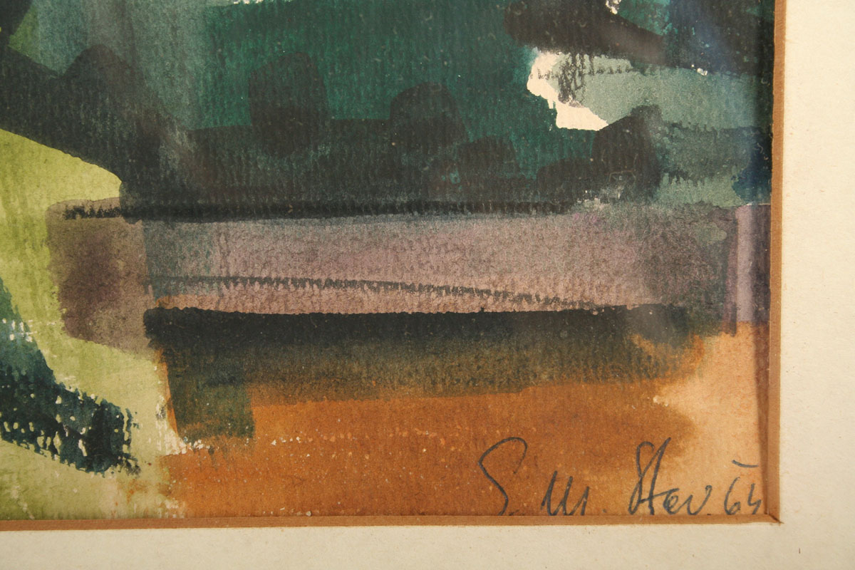 kresba partie pod kostelíkem sv. Matěje v Praze u Šáreckého potoka, akvarel na papíře, ve výřezu 36 x 48 cm, s rámem 60 x 70 cm, autor Eduard Stavinoha, podepsáno vpravo dole tužkou Edu Stav 64, na zadní straně autorský štítek s dedikací, rámováno v původní paspartě a rámu pod sklem