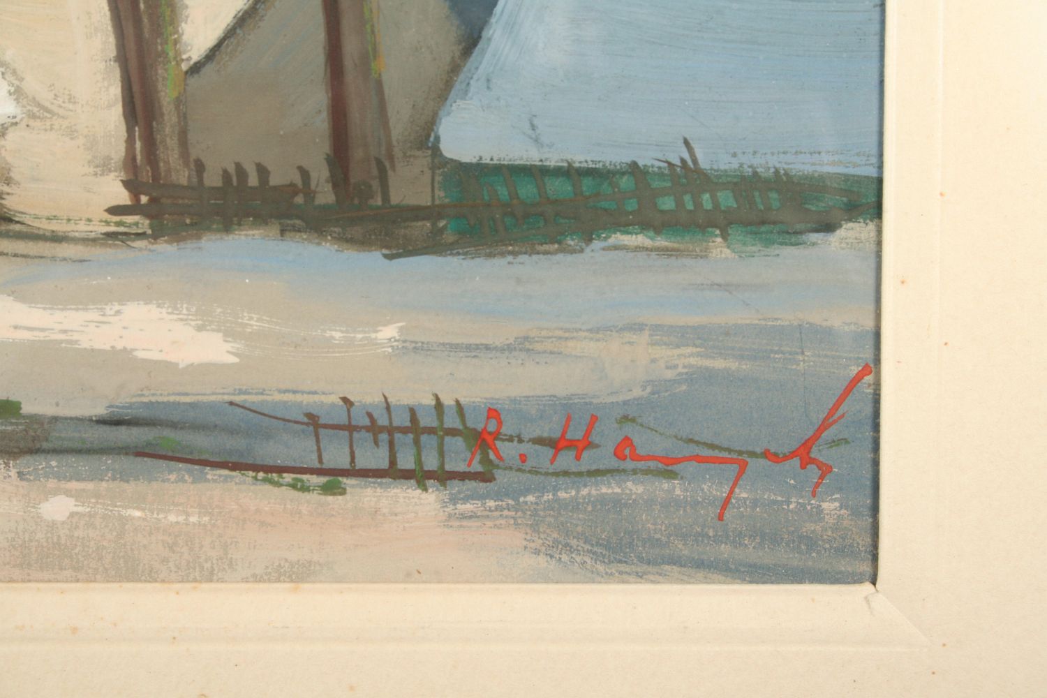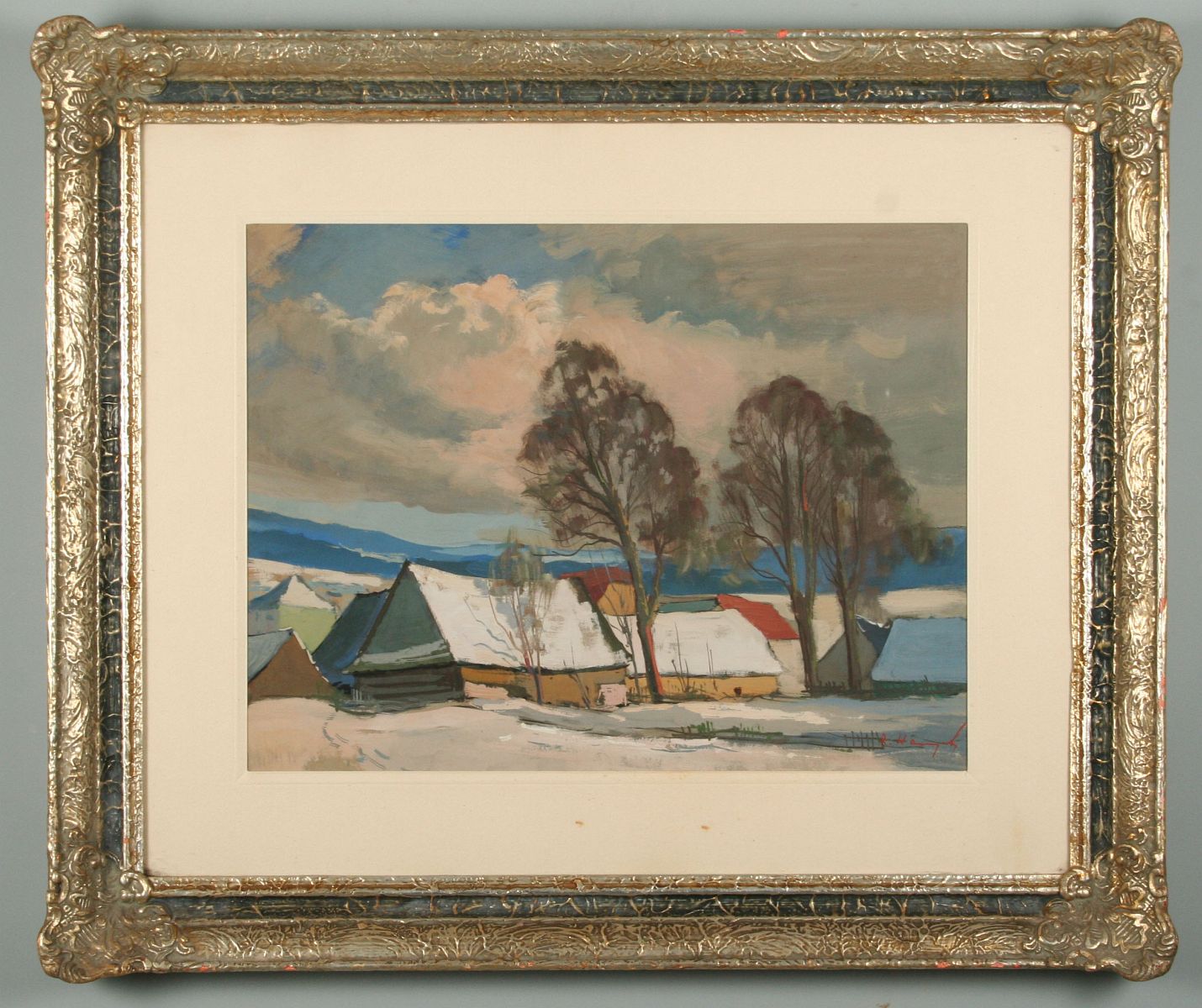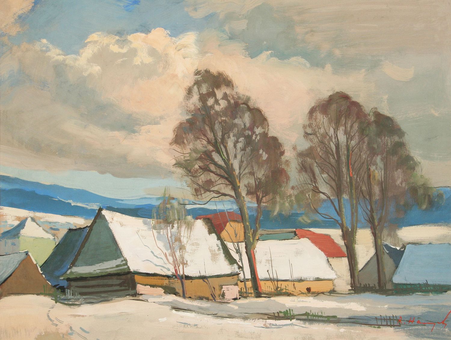 obraz zimní krajiny z Vysočiny s chlupami, olej tempera na papíře, ve výřezu 31 x 41 cm, s rámem 54 x 63 cm, autor Rudolf Hanych, podepsáno vpravo dole R. Hanych, rámováno v půvdní paspartě a zdobeném rámu pod sklem