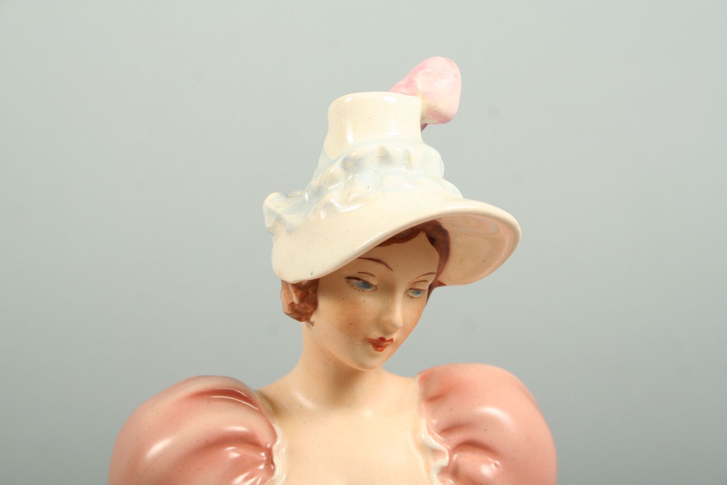 dáma v kloboučku a šatech s paraplíčkem v ruce, malovaná a glasovaná keramika, elegantní provedení, značeno na dně zeleným razítkem Royal DUX Deutschland, 31 cm