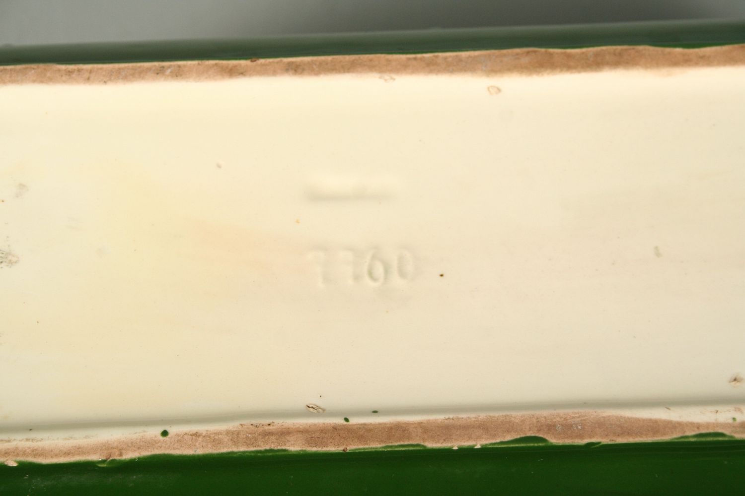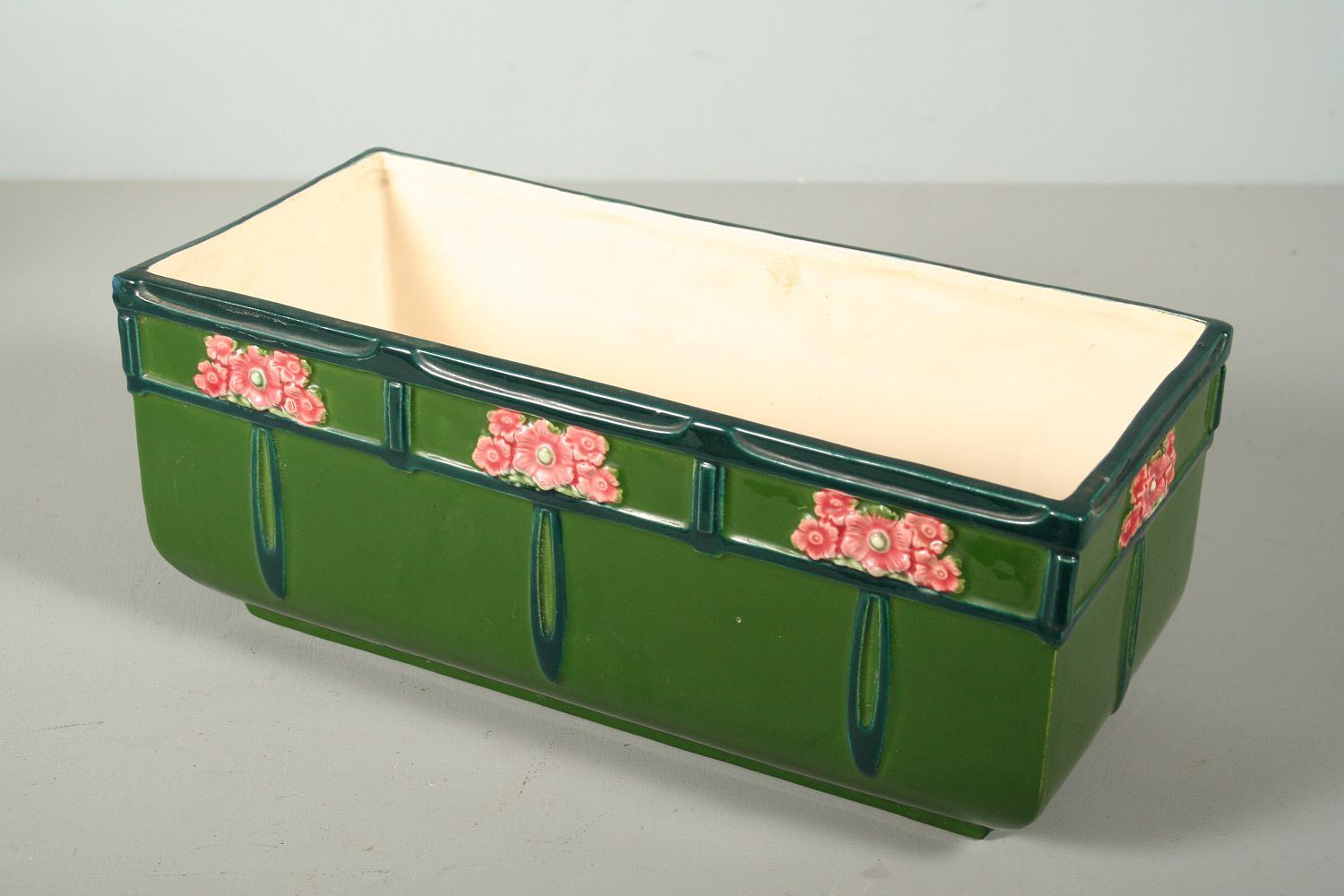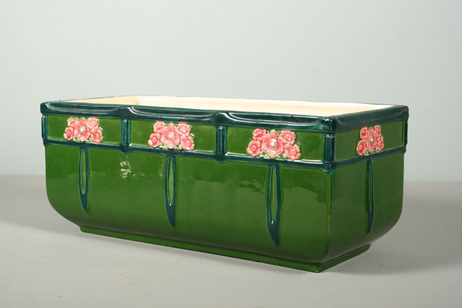 secesní keramický květináč obdelníkového tvaru na stranách s barevným dekorem květin a secesních ornamentů, na dně značený Eichwald, tlačené číslo 7760, 14 x 15 x 33 cm
