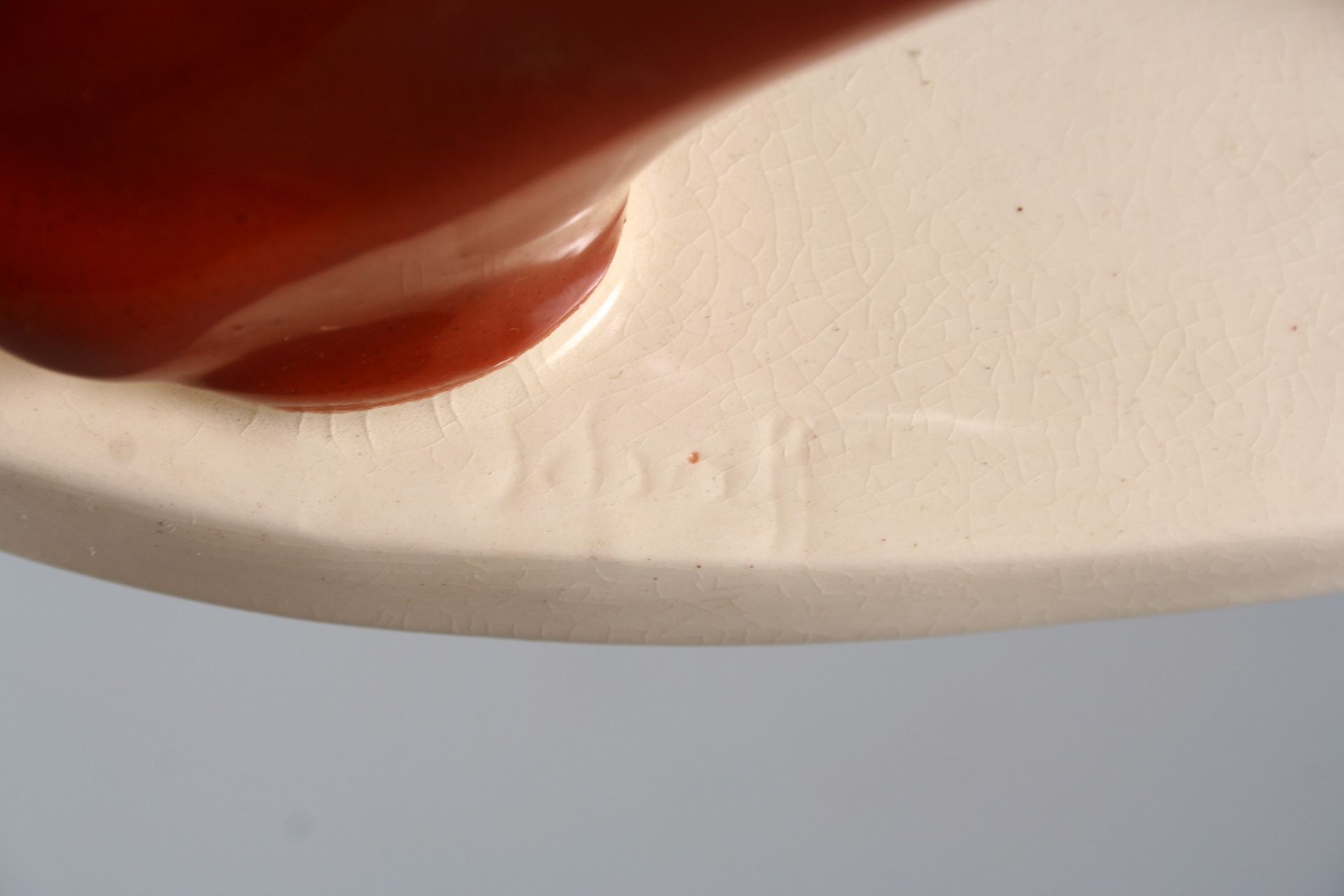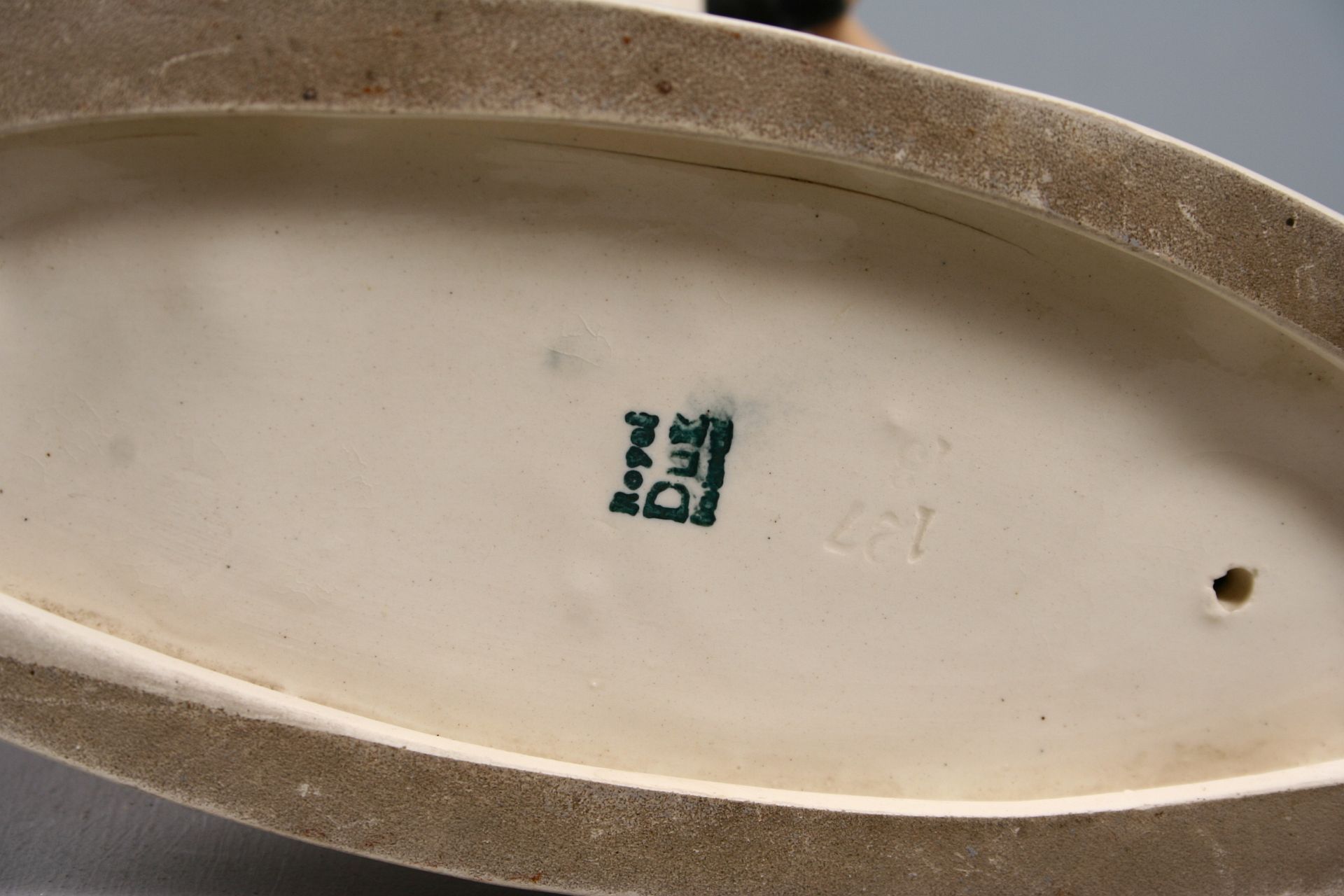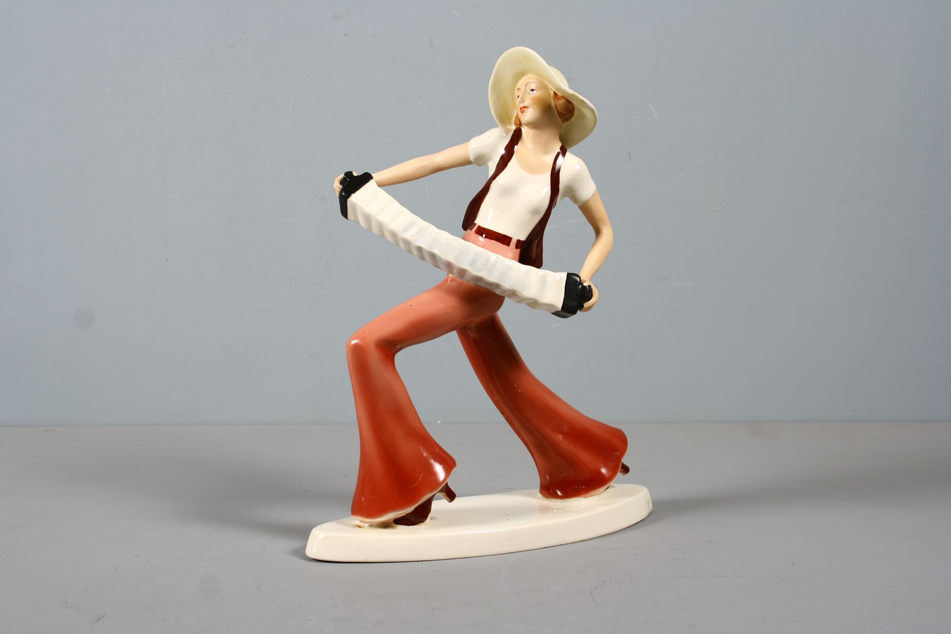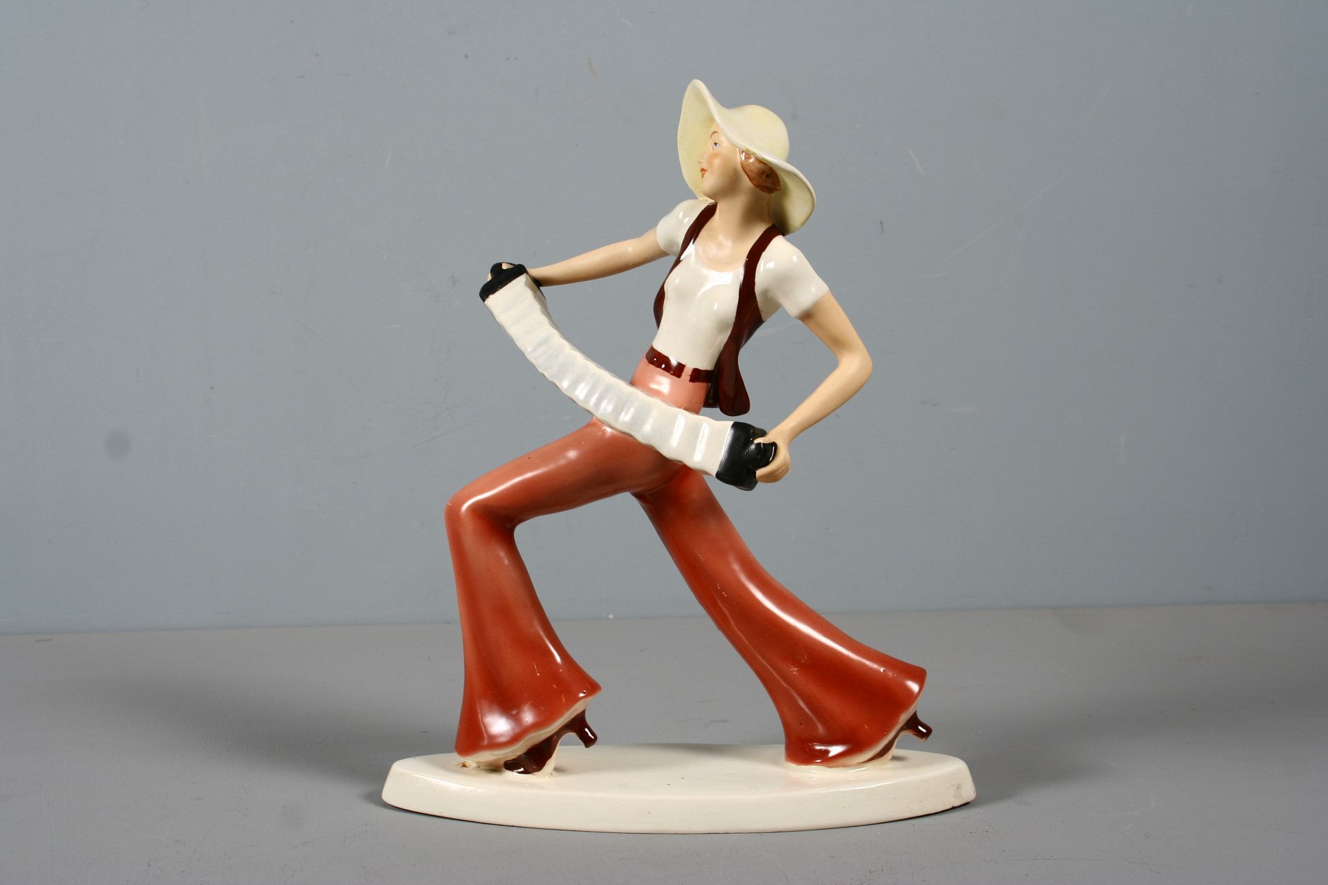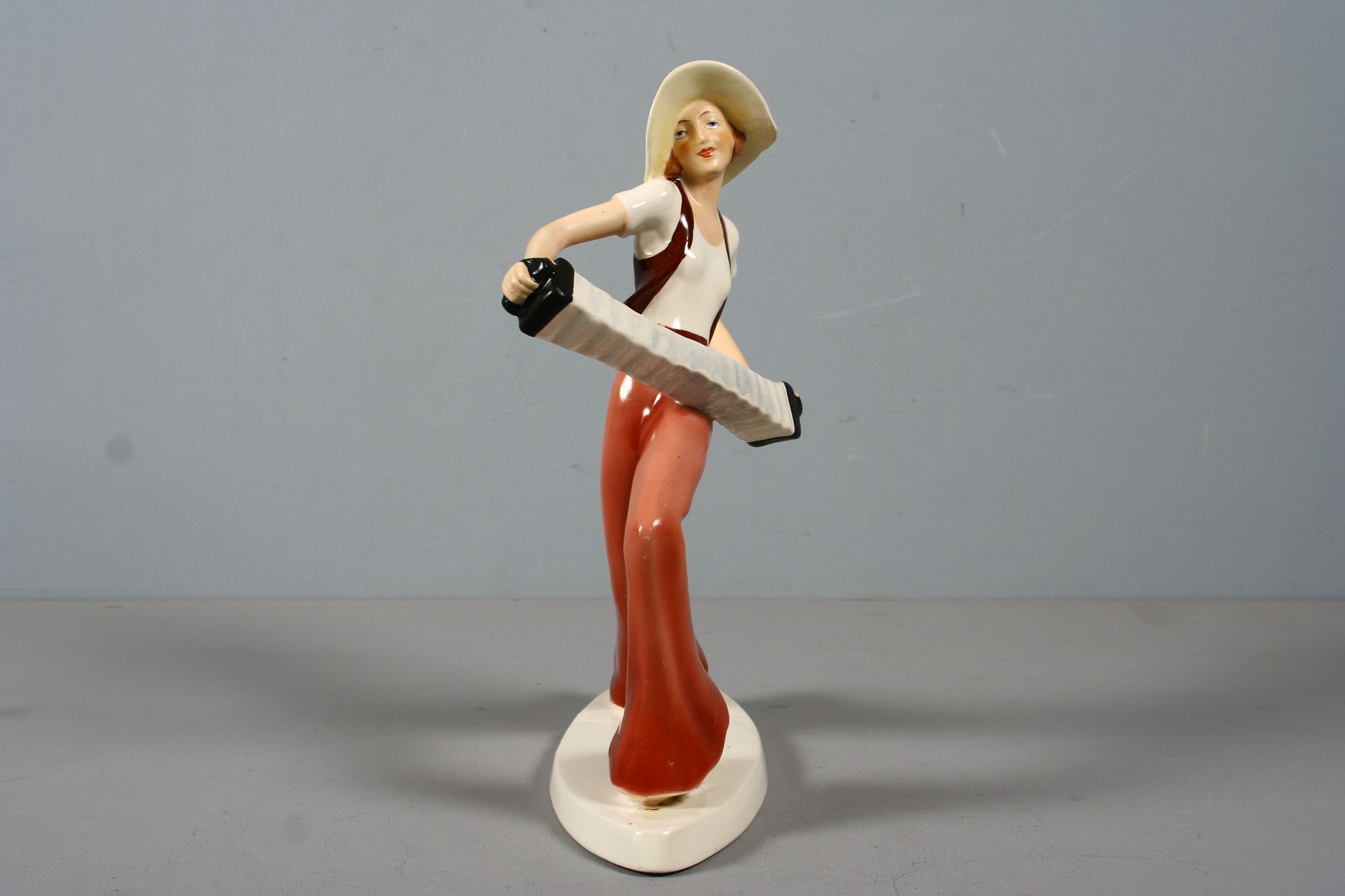 dívka v klobouku kráčející s harmonikou, malovaná a glasovaná keramika, elegantní provedení, značeno na dně zeleným razítkem Royal DUX Deutschland, 28 cm