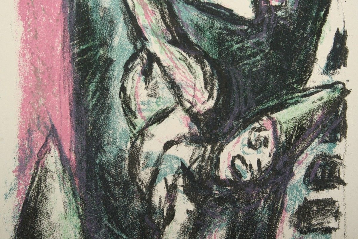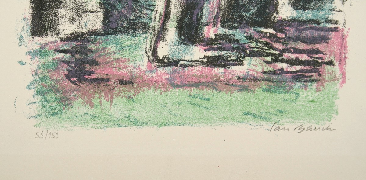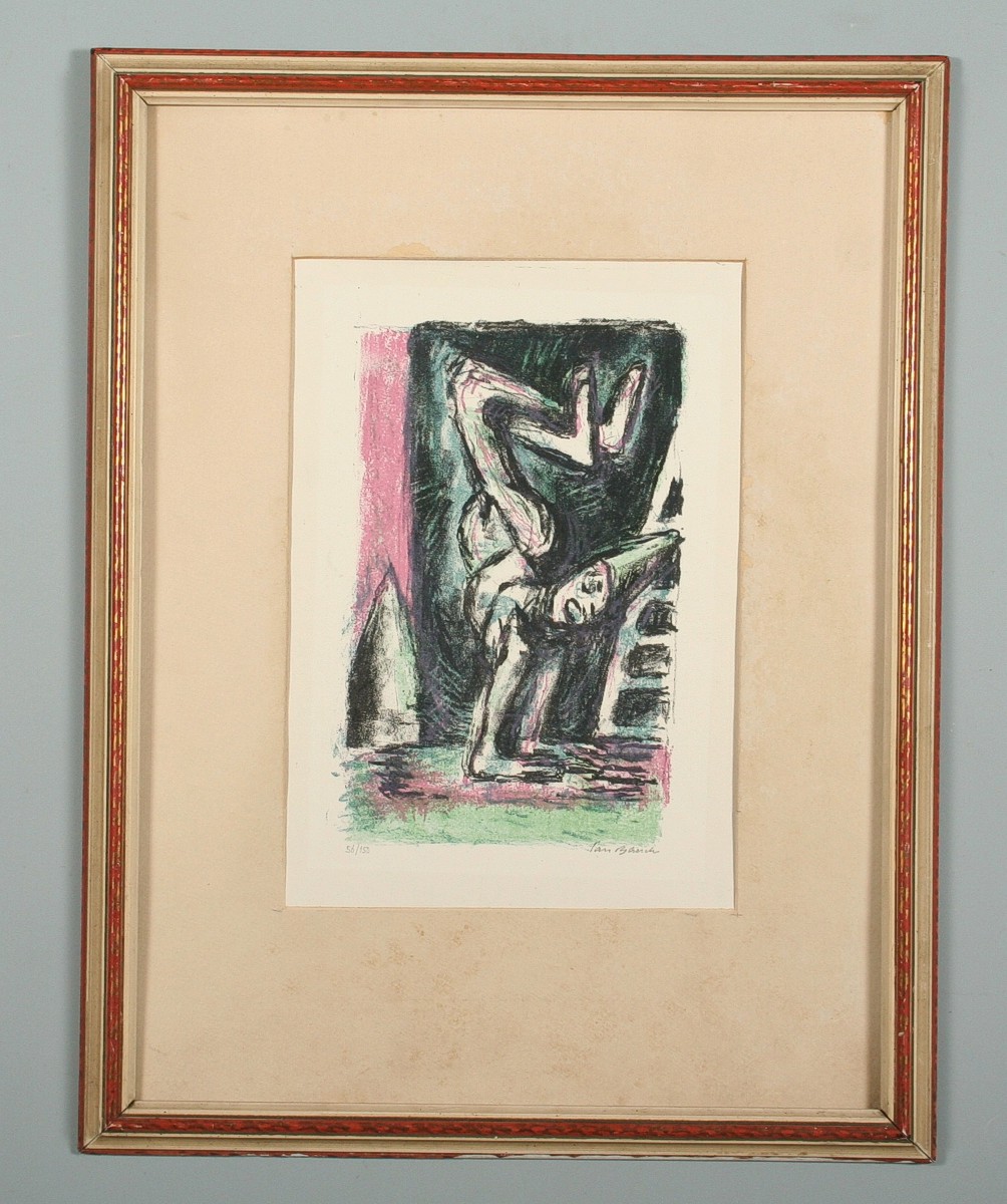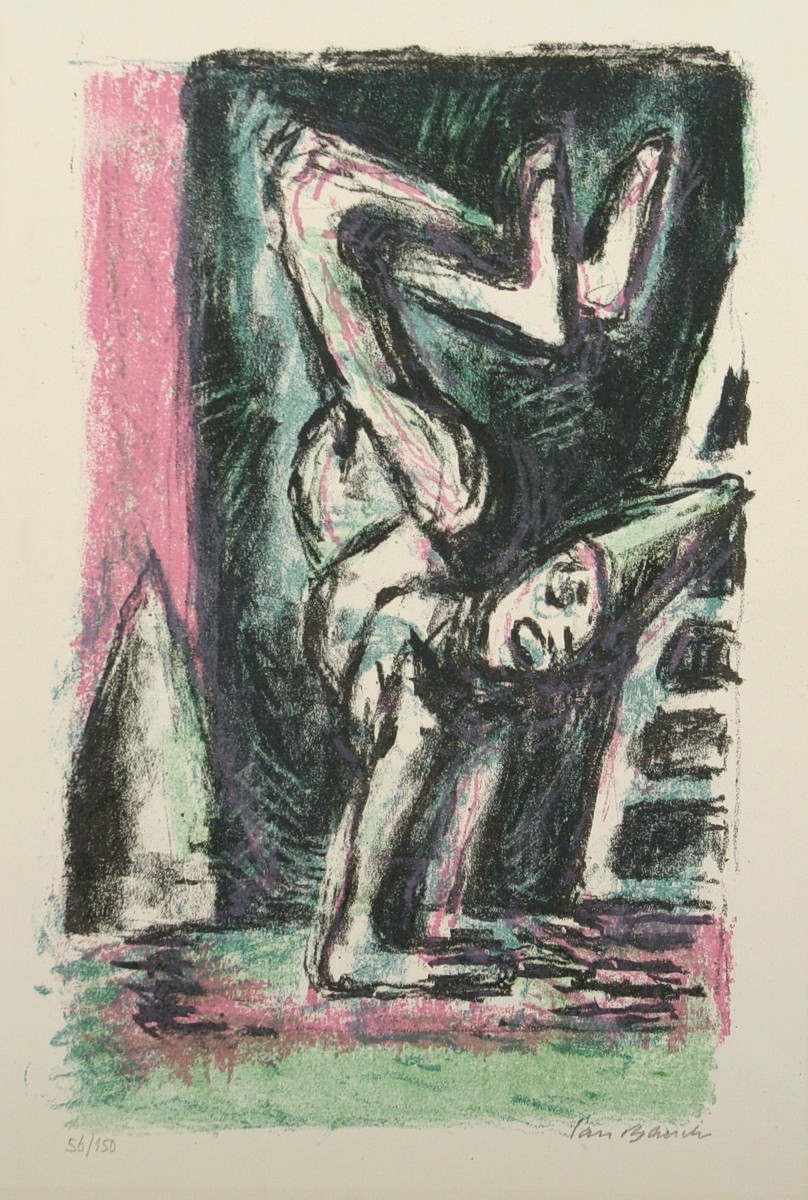 vyobrazení akrobata stojícího na rukou, barevná litografie na ručním papíře, tisková plocha 33 x 21 cm, s rámem 70 x 54 cm, autor Jan Bauch, podepsáno vpravo dole Jan Bauch, rámováno v paspartě a rámu pod sklem