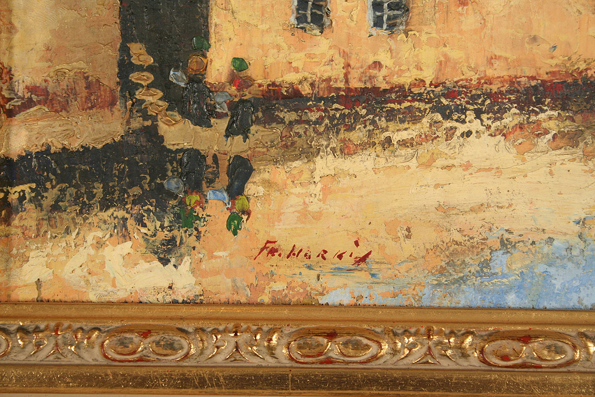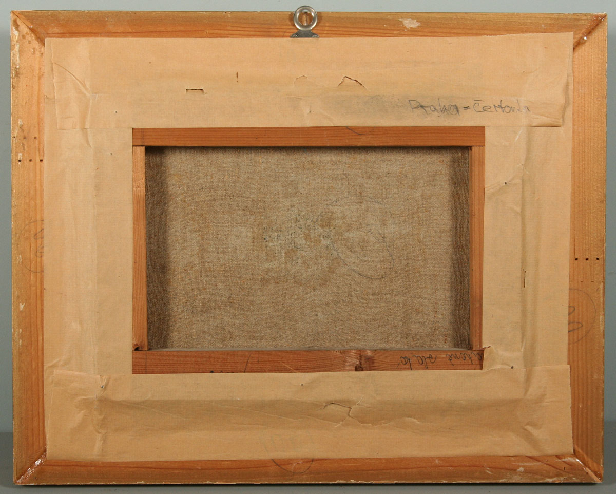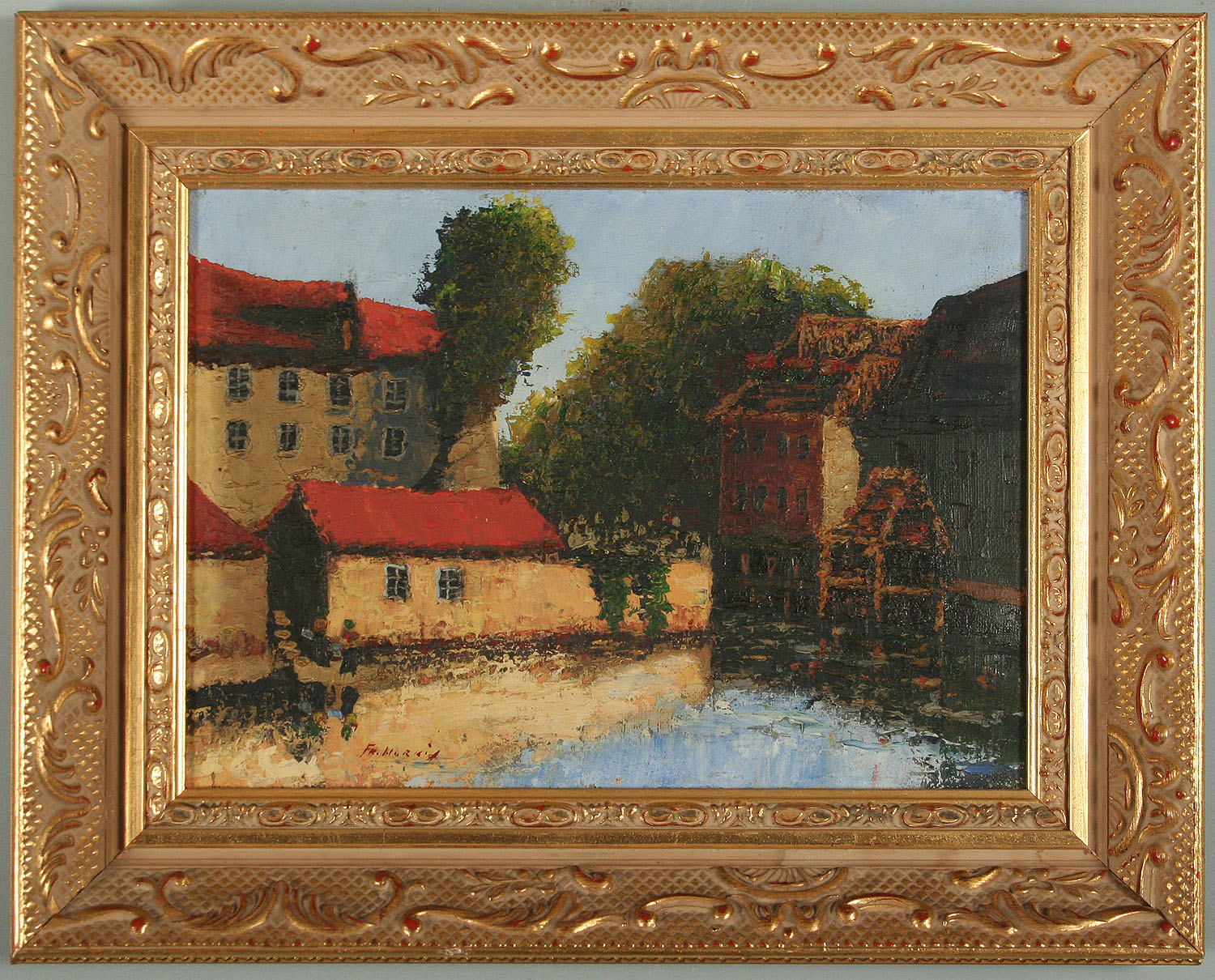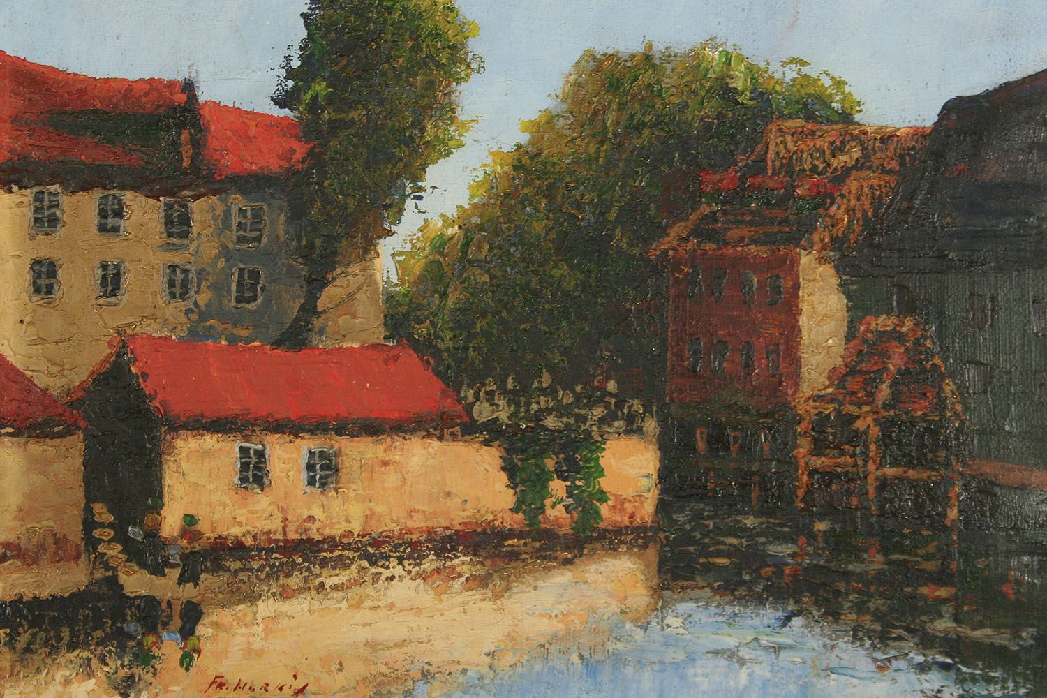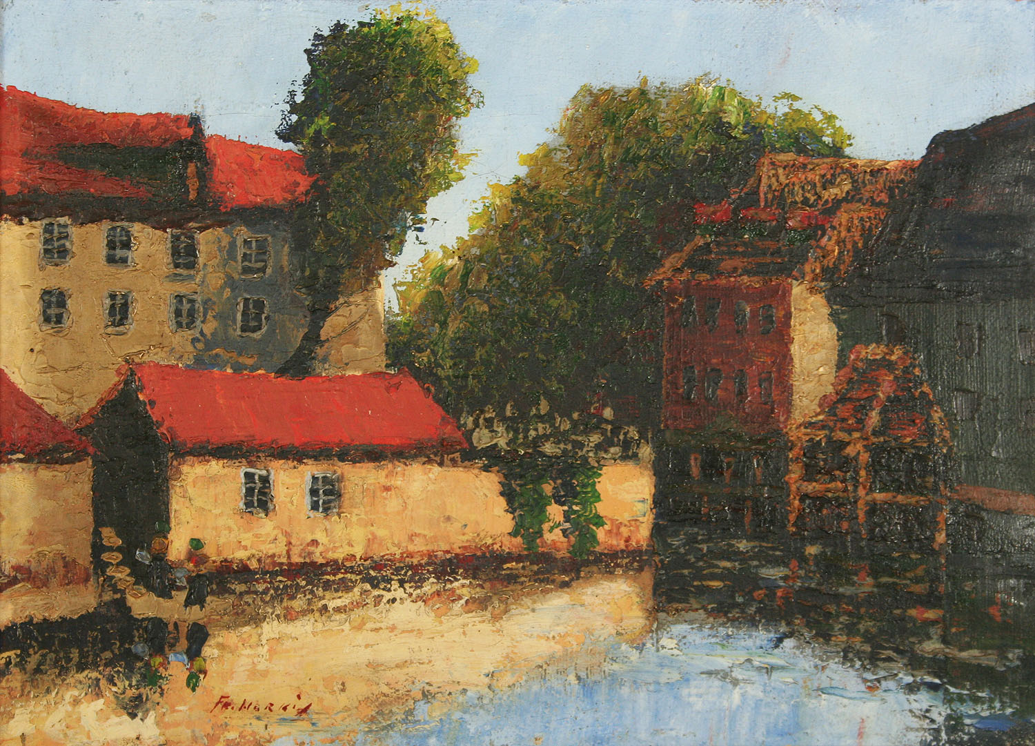 obraz staré Čertovky u Kampy v Praze, olej na plátně, 20 x 28 cm, s rámem 39 x 31 cm, autor František Horký, podepsáno dole vlevo Fr. Horký, rámováno