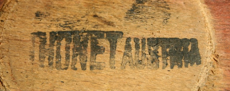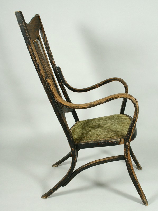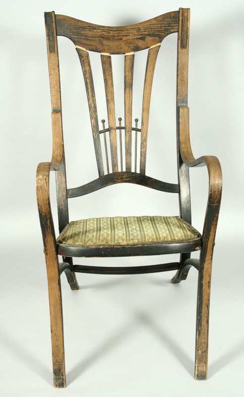křeslo z ohýbaného dřeva s mosaznými doplňky, nerestaurováno, značeno Thonet