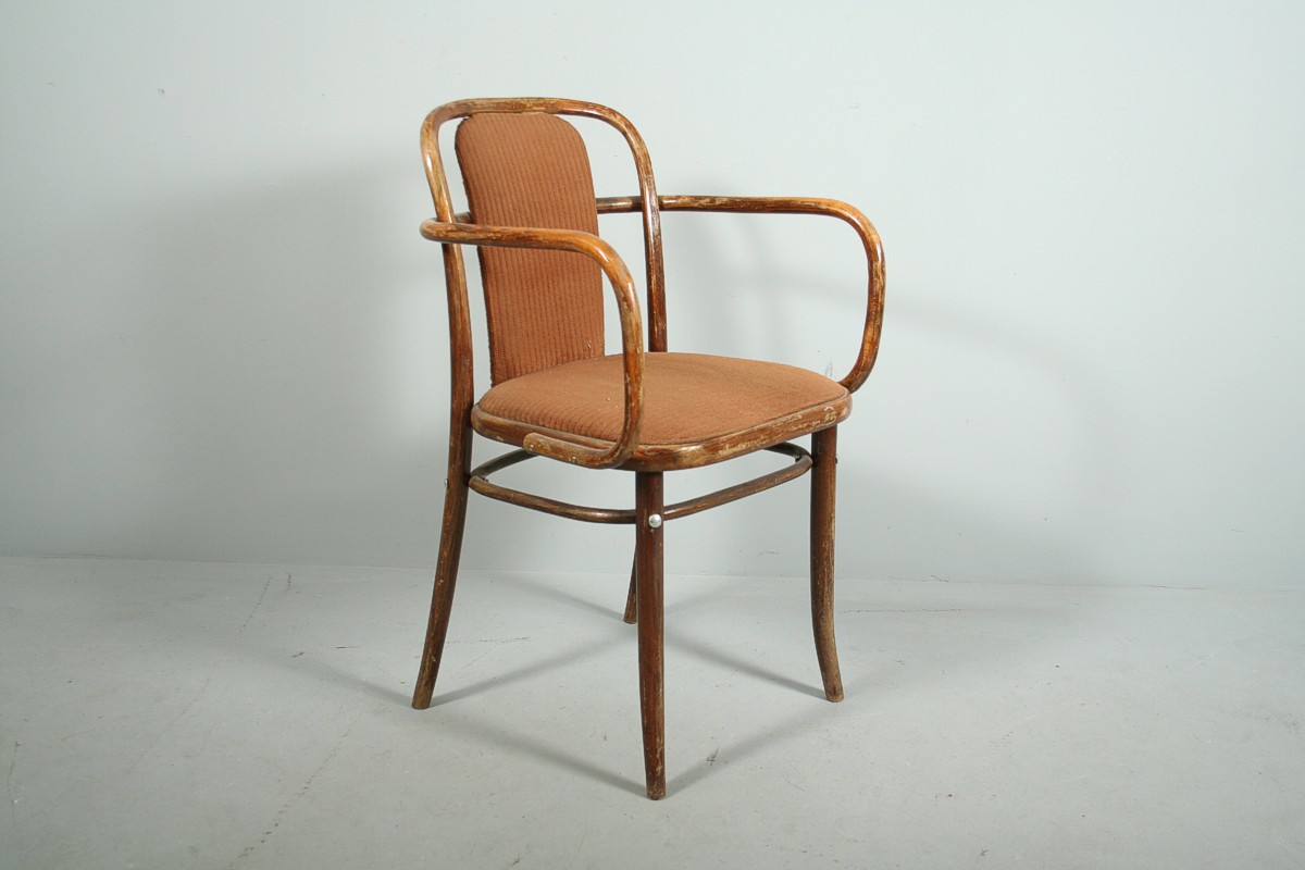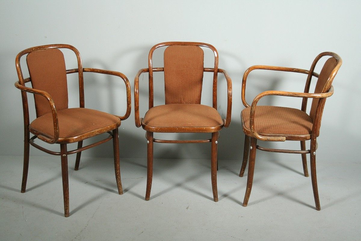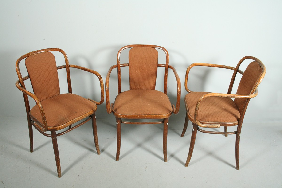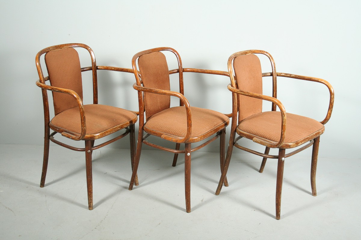 tři křesílka s polstrovaným sedákem a opěrákem z ohýbaného dřeva, každé značené vinětou výrobce TON Bystřice pod Hostýnem, následník firmy Thonet z 50. let 20. století, v původním stavu, dřevo nepoškozené, 81 x 53 cm