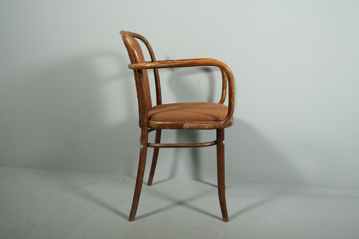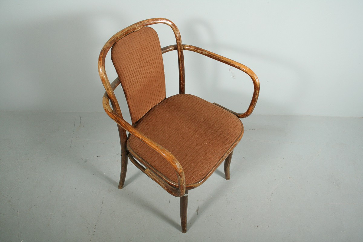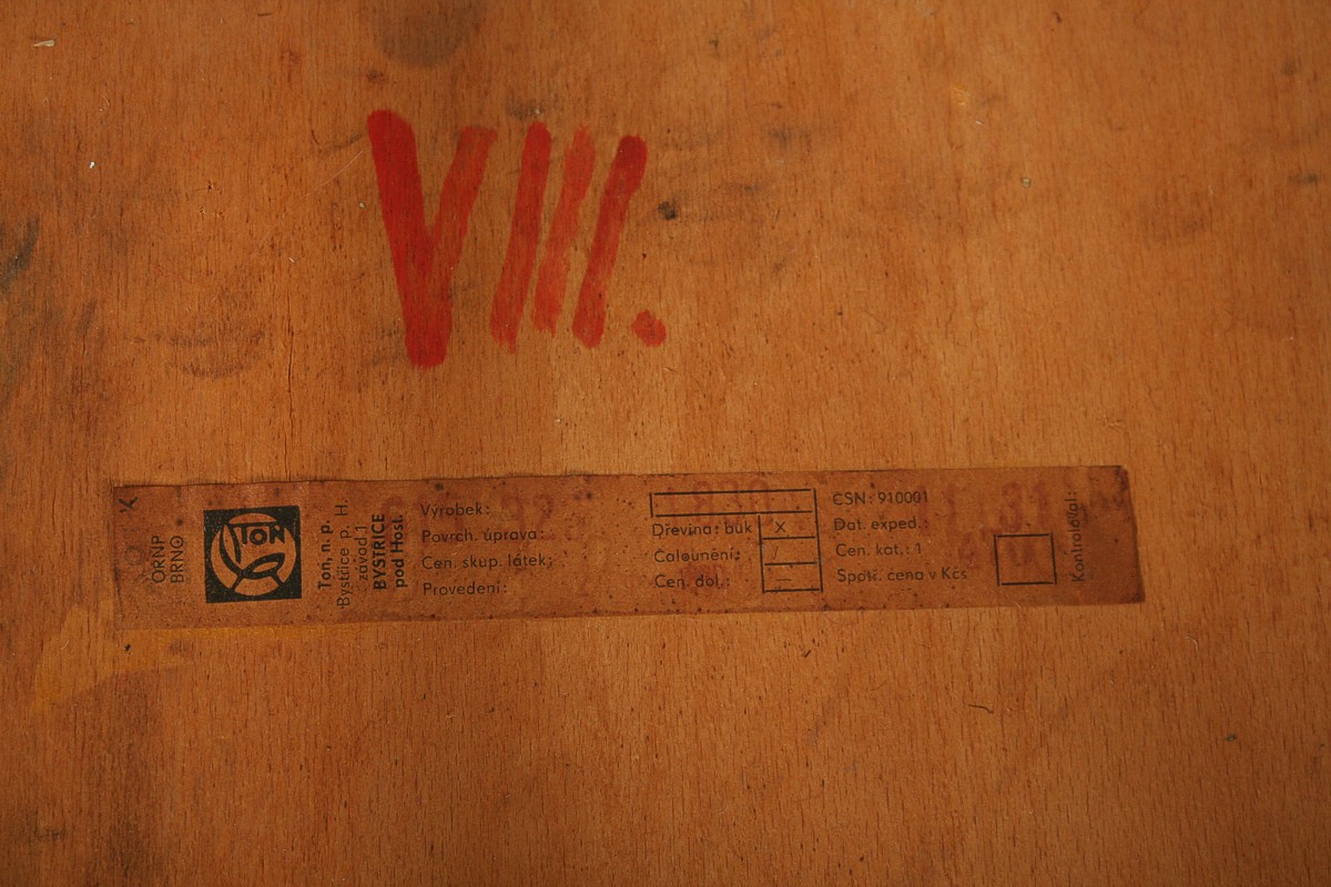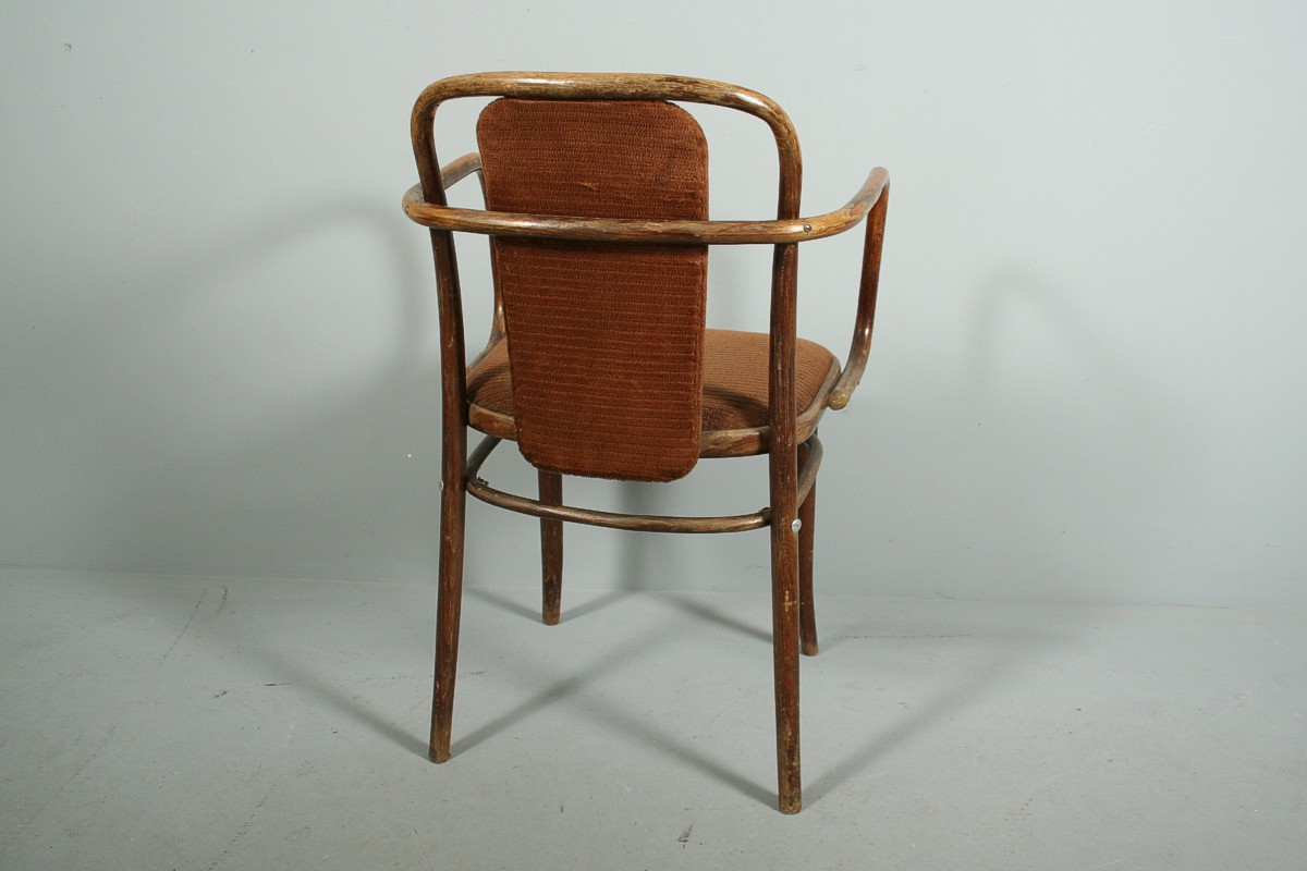 tři křesílka s polstrovaným sedákem a opěrákem z ohýbaného dřeva, každé značené vinětou výrobce TON Bystřice pod Hostýnem, následník firmy Thonet z 50. let 20. století, v původním stavu, dřevo nepoškozené, 81 x 53 cm