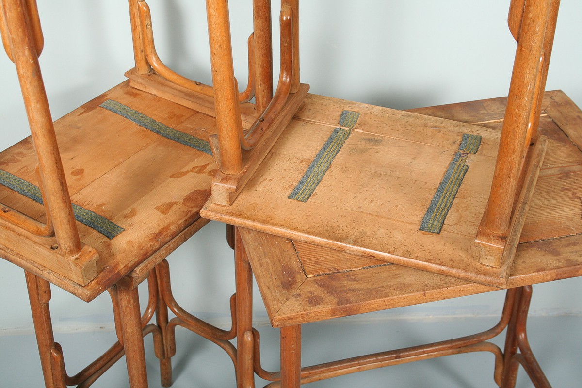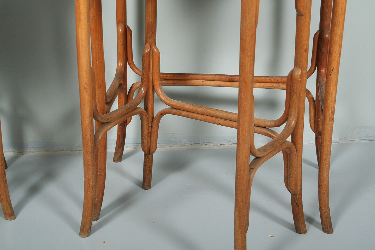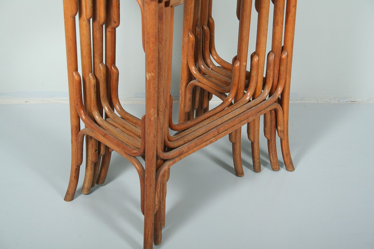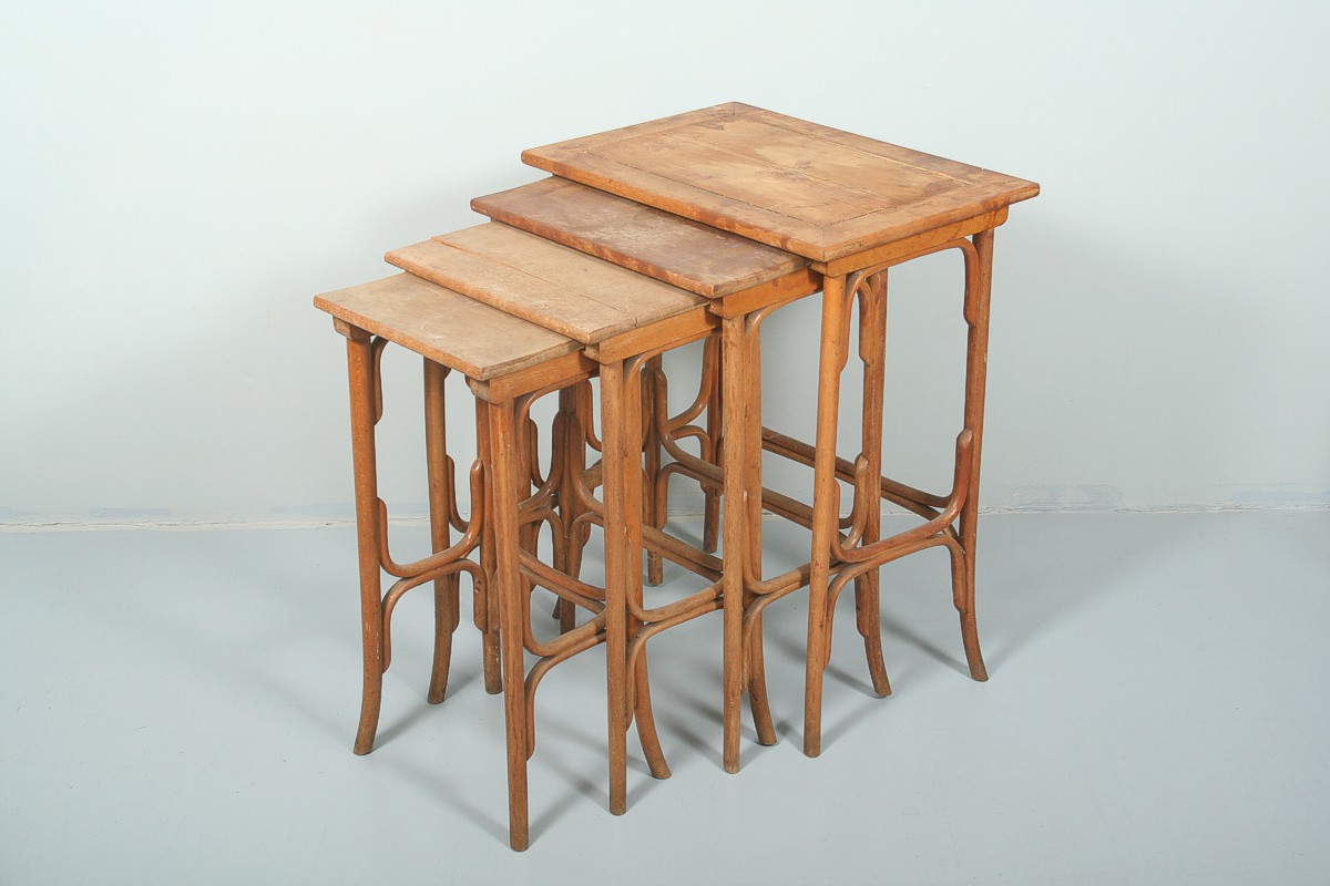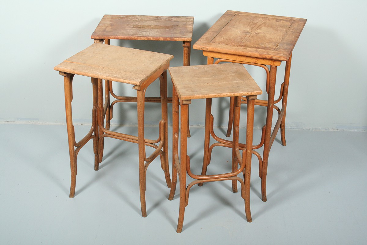 kompletní hnízdové stolky z ohýbaného dřeva 4 kusy, patrně produkce Thonet, vše v původním stavu, vhodné k restaurování, místy v desce stopy po škůdci, 70 x 55 x 39,5 cm