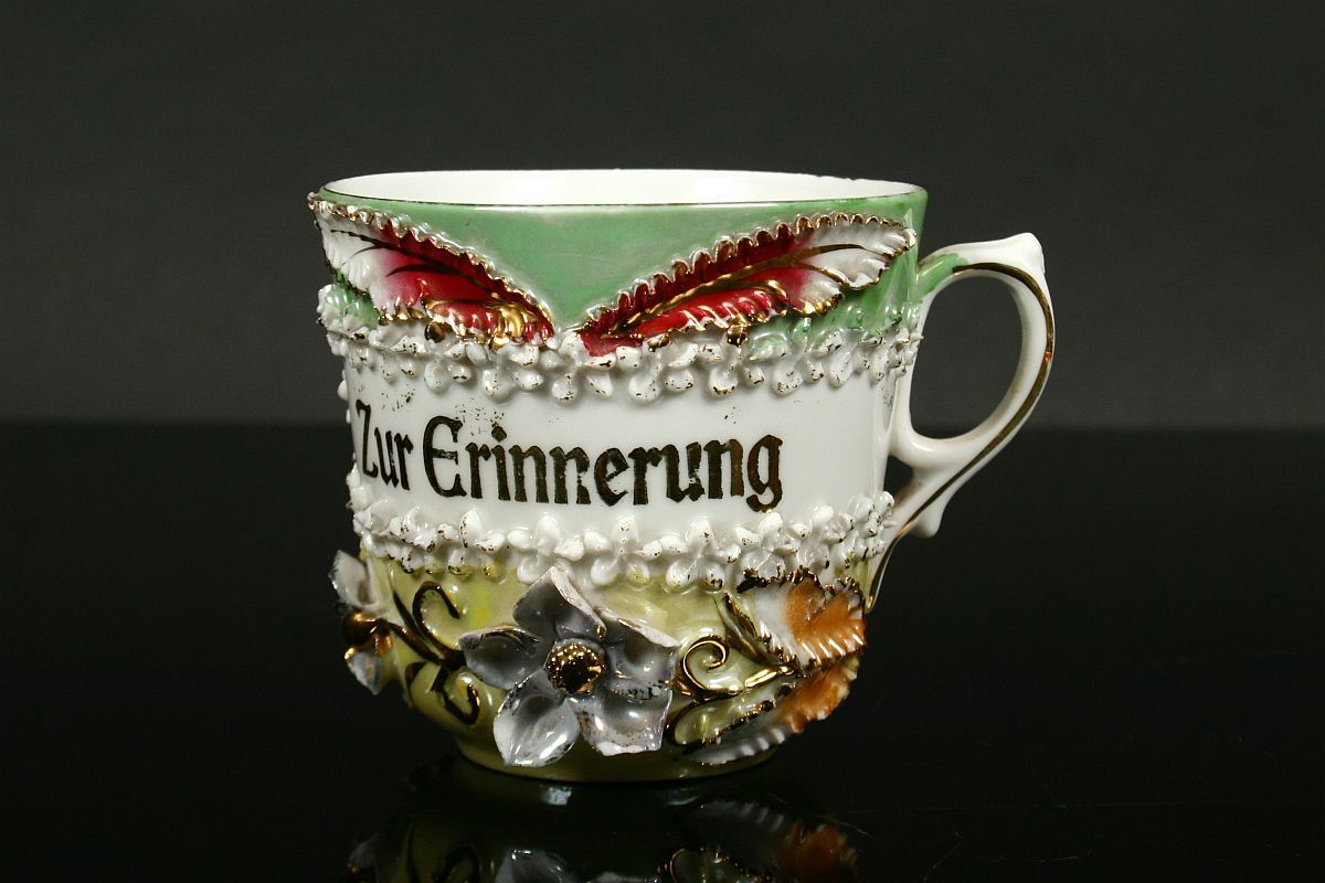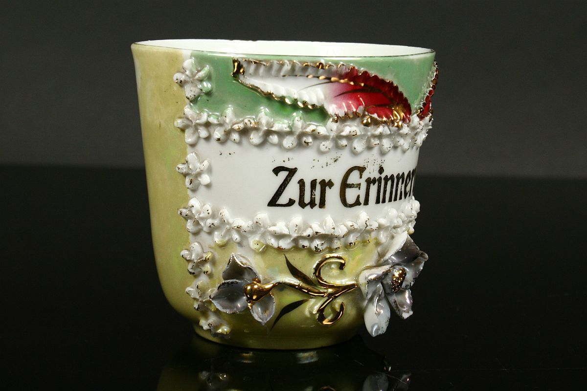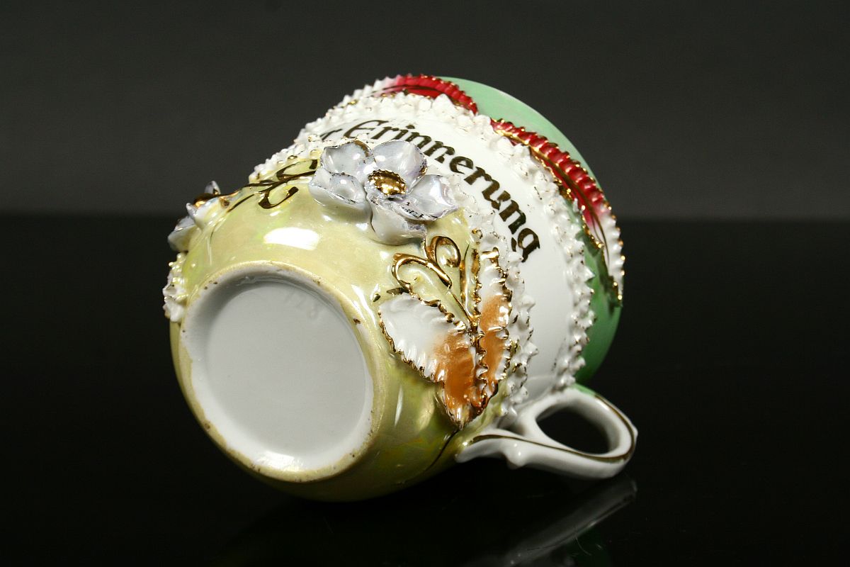 hrnek, se zeleno žlutým podkladem bohatě plasticky zdobený květinovým motivem se zlacenými detaily a nápisem v německém jazyce "ZUR ERINNERUNG", bílý malovaný zlacený porcelán, 8 cm, značený tlačeným písmem 128