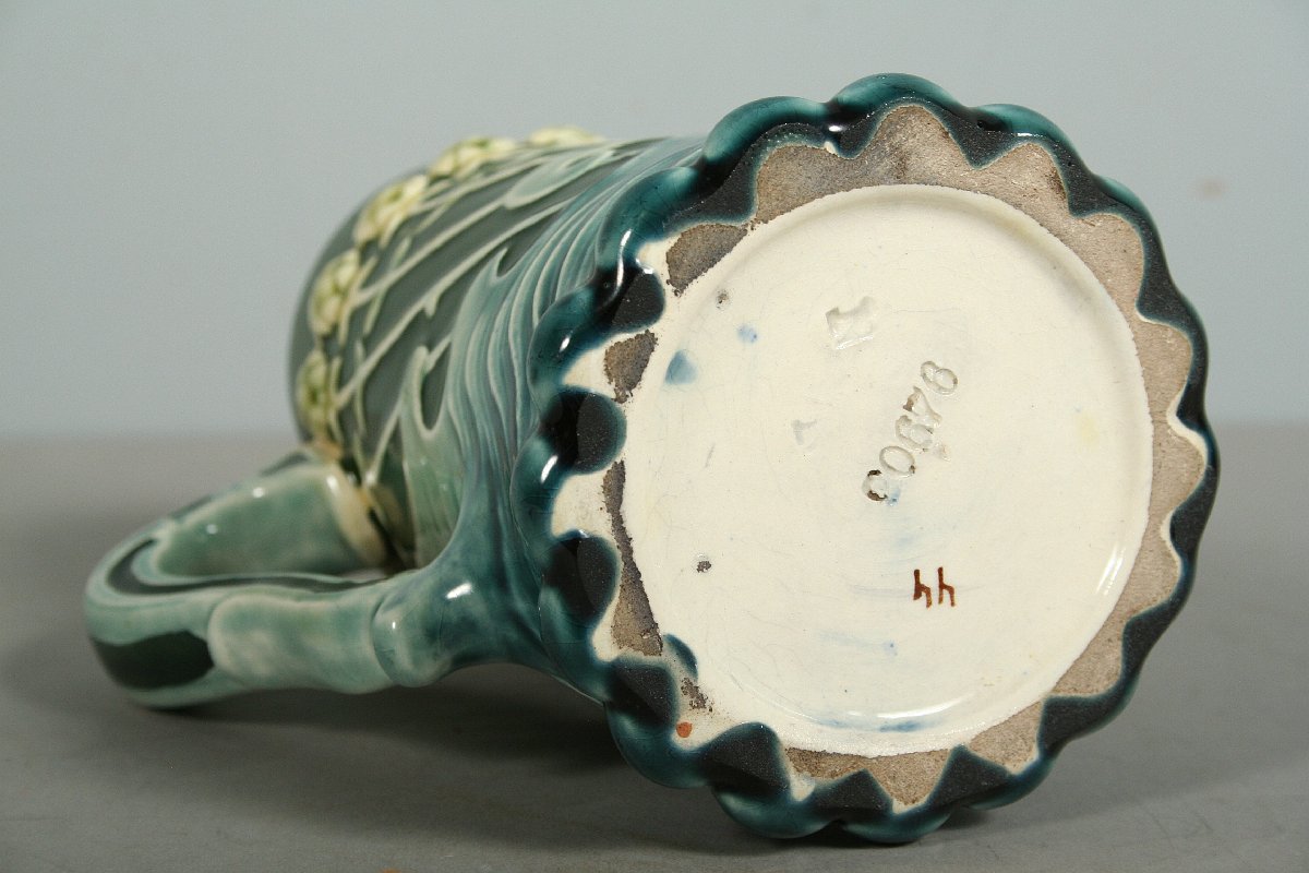 keramický secesní korbel s ryskou 0,3 L, fajánsová keramika malovaná, reliéfní detaily v secesním stylu, počátek 20. století, značeno na dně nečitelně, 15 cm