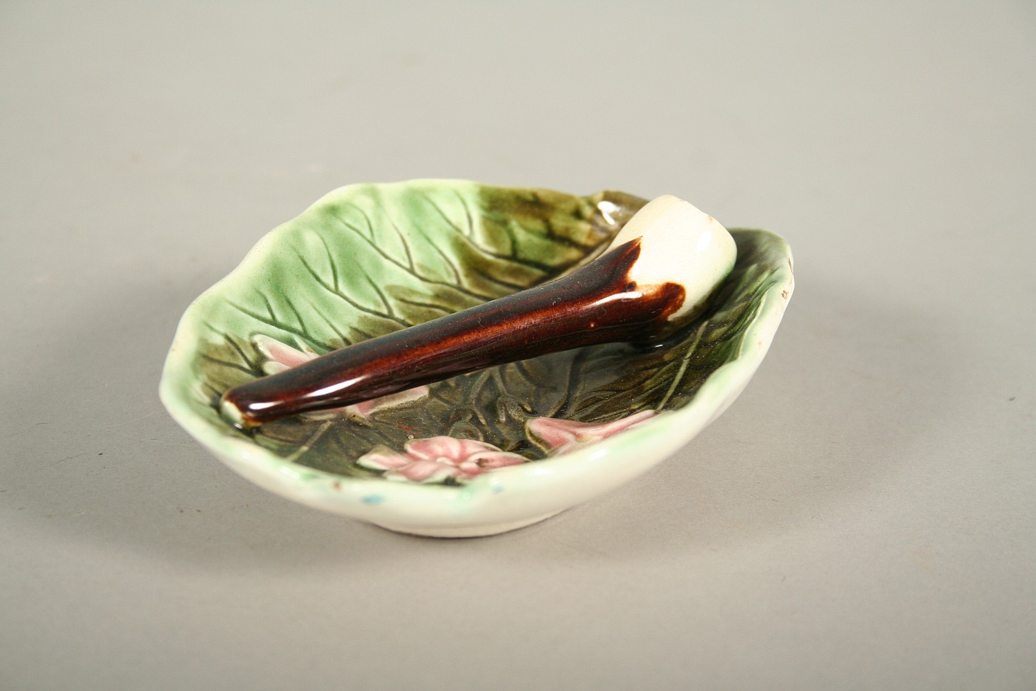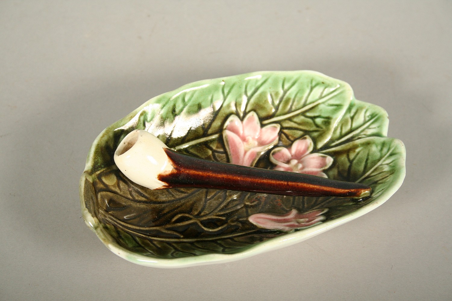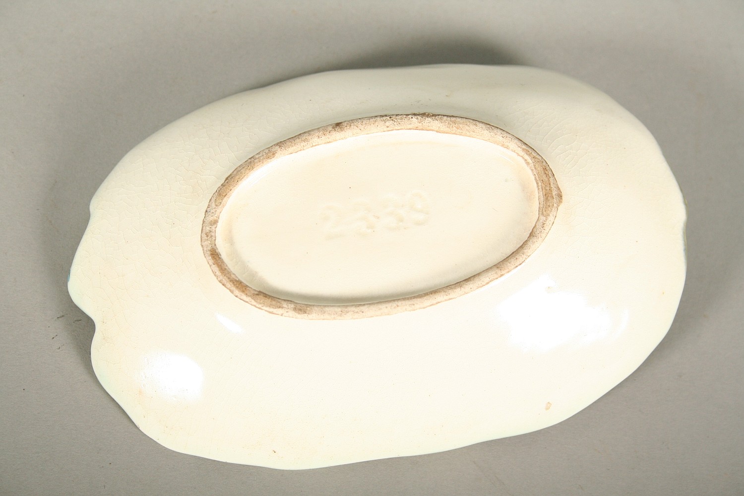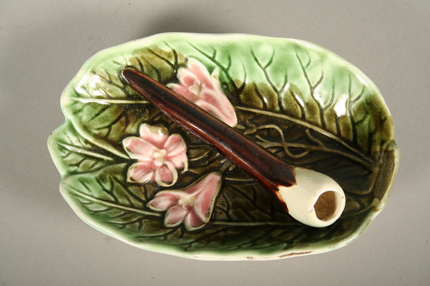 secesní miska s fajfkou na květech zvonků, malovaná fajáns, značená tlačeným číslem, 14 x 9,5 cm