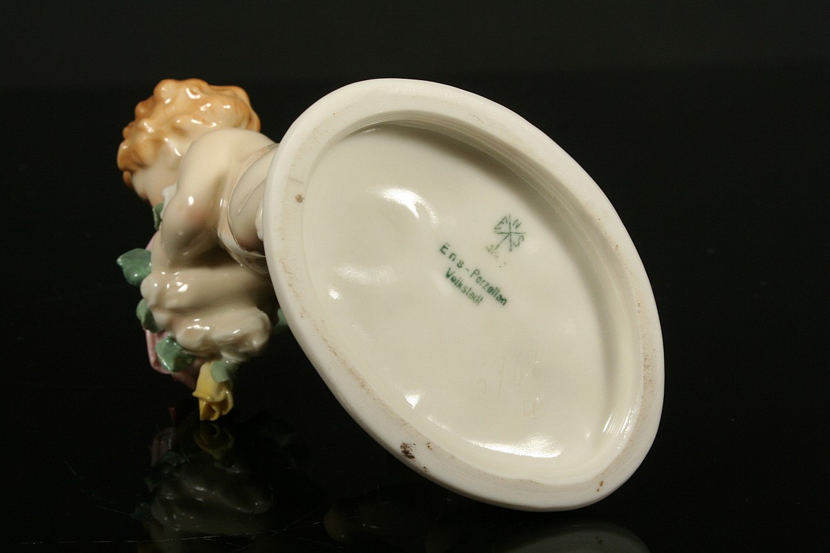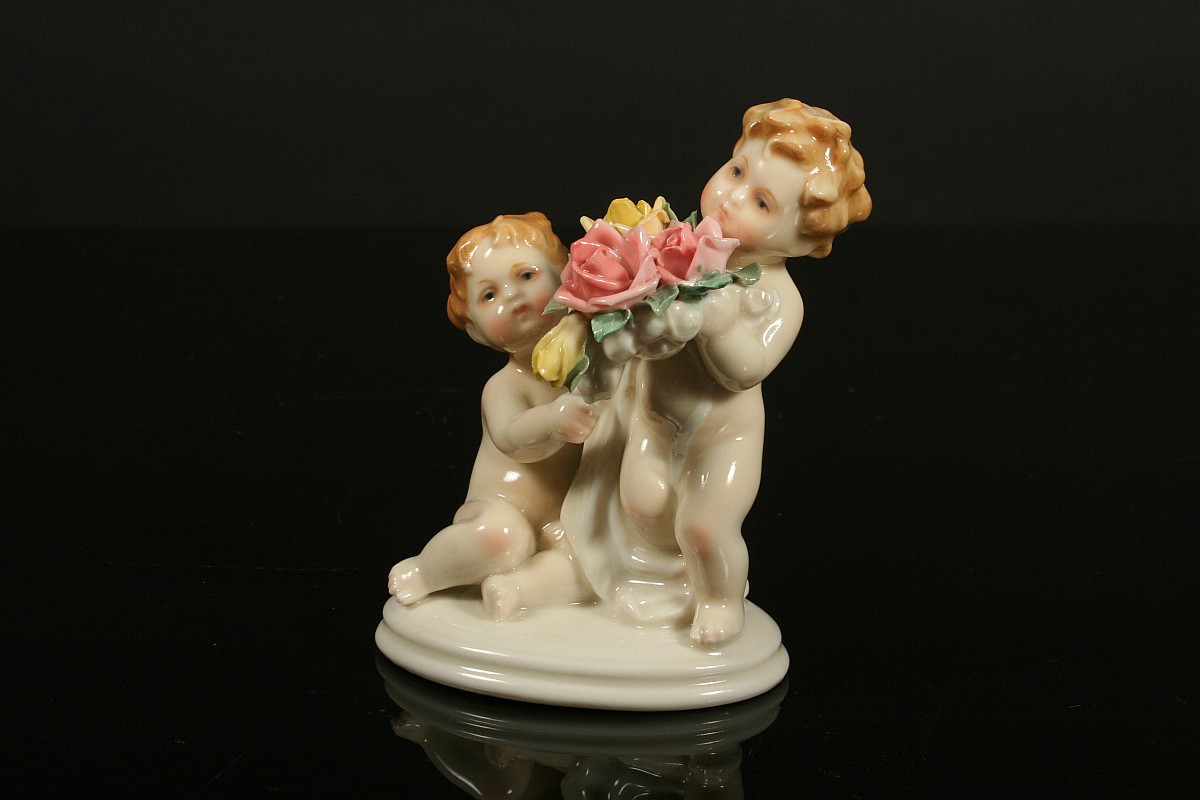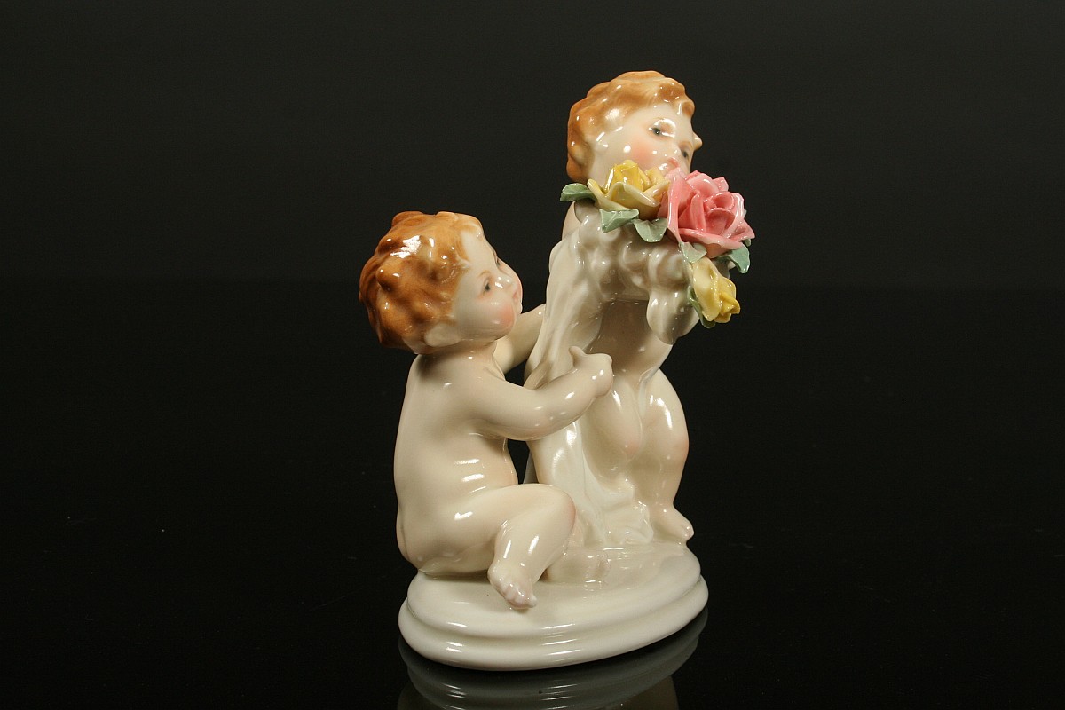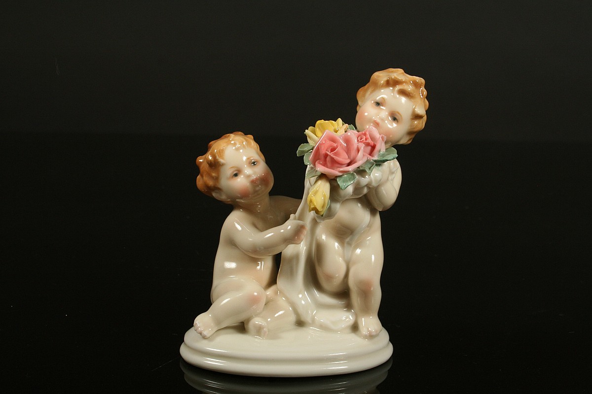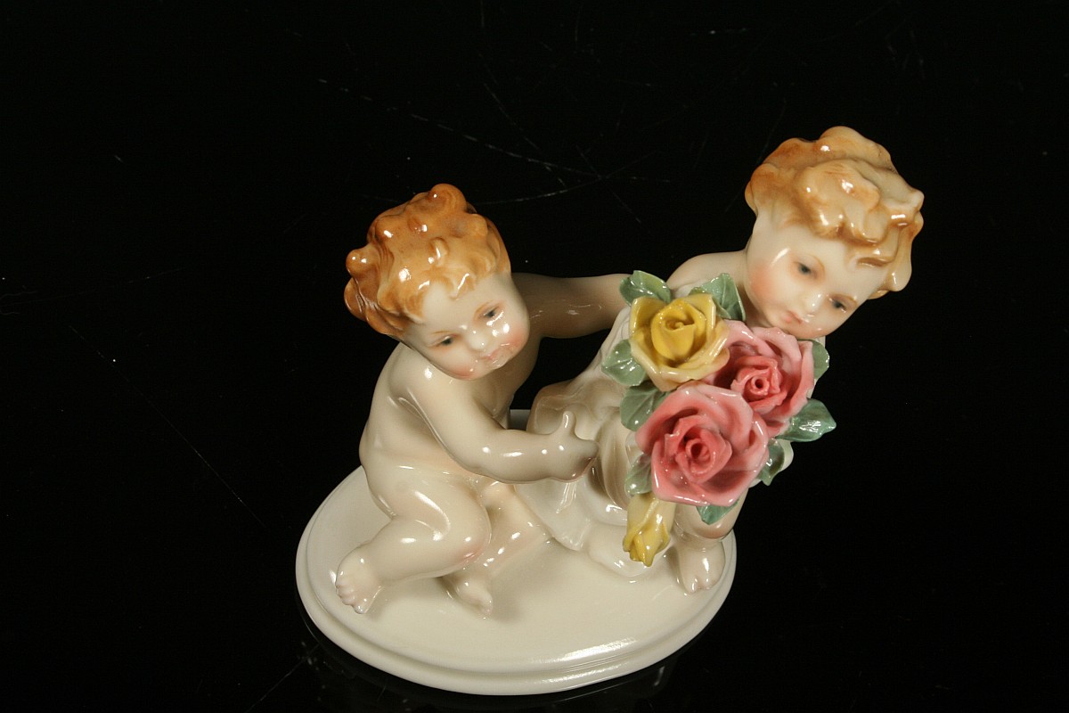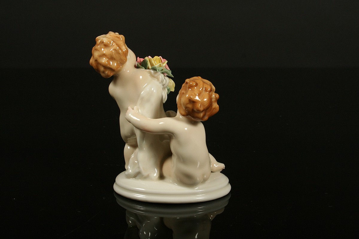 porcelánové sousoší nahých dítek s bohatou kyticí růží, malovaný bílý porcelán, značeno na dně Volkstedt Karl ENS, 12 cm