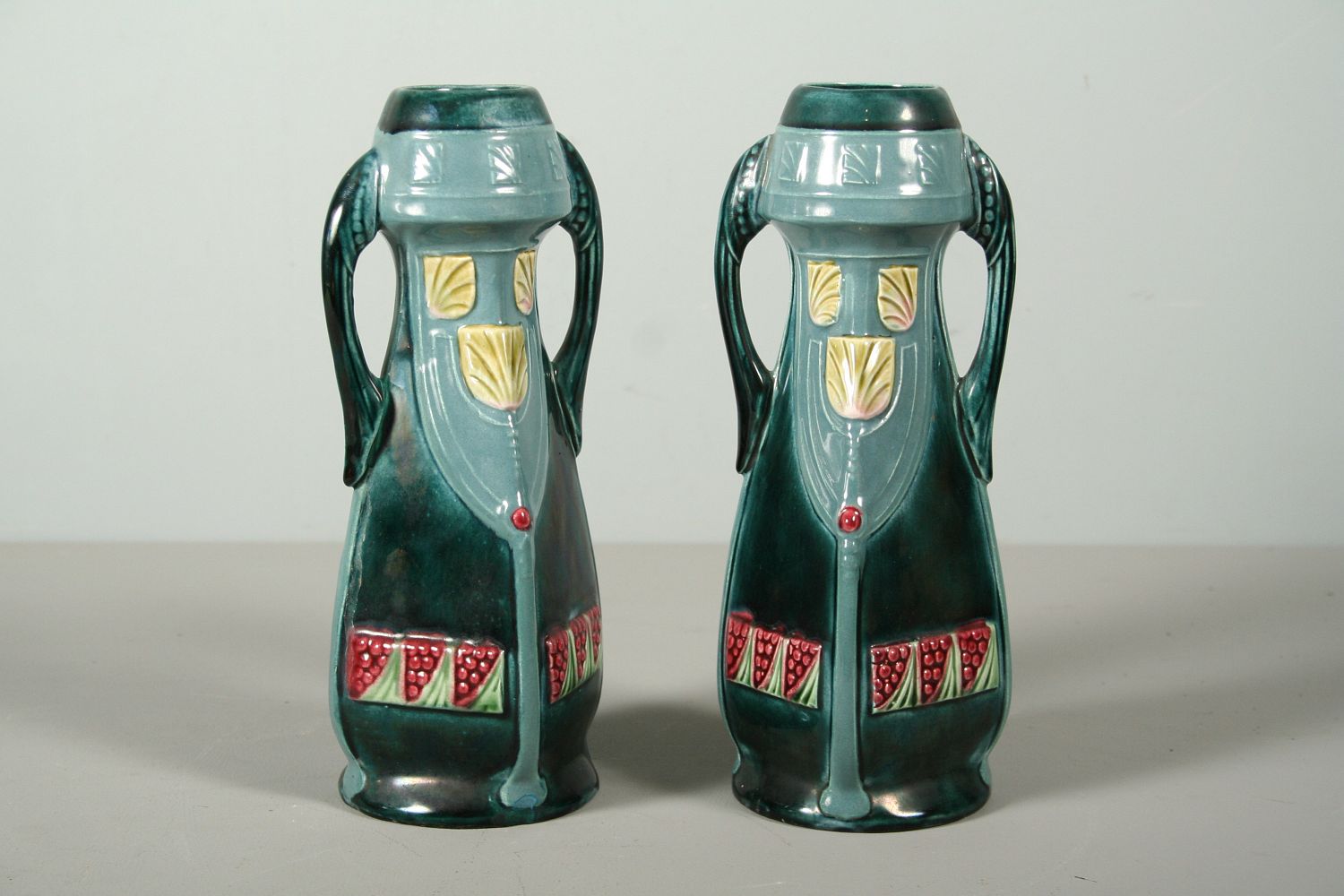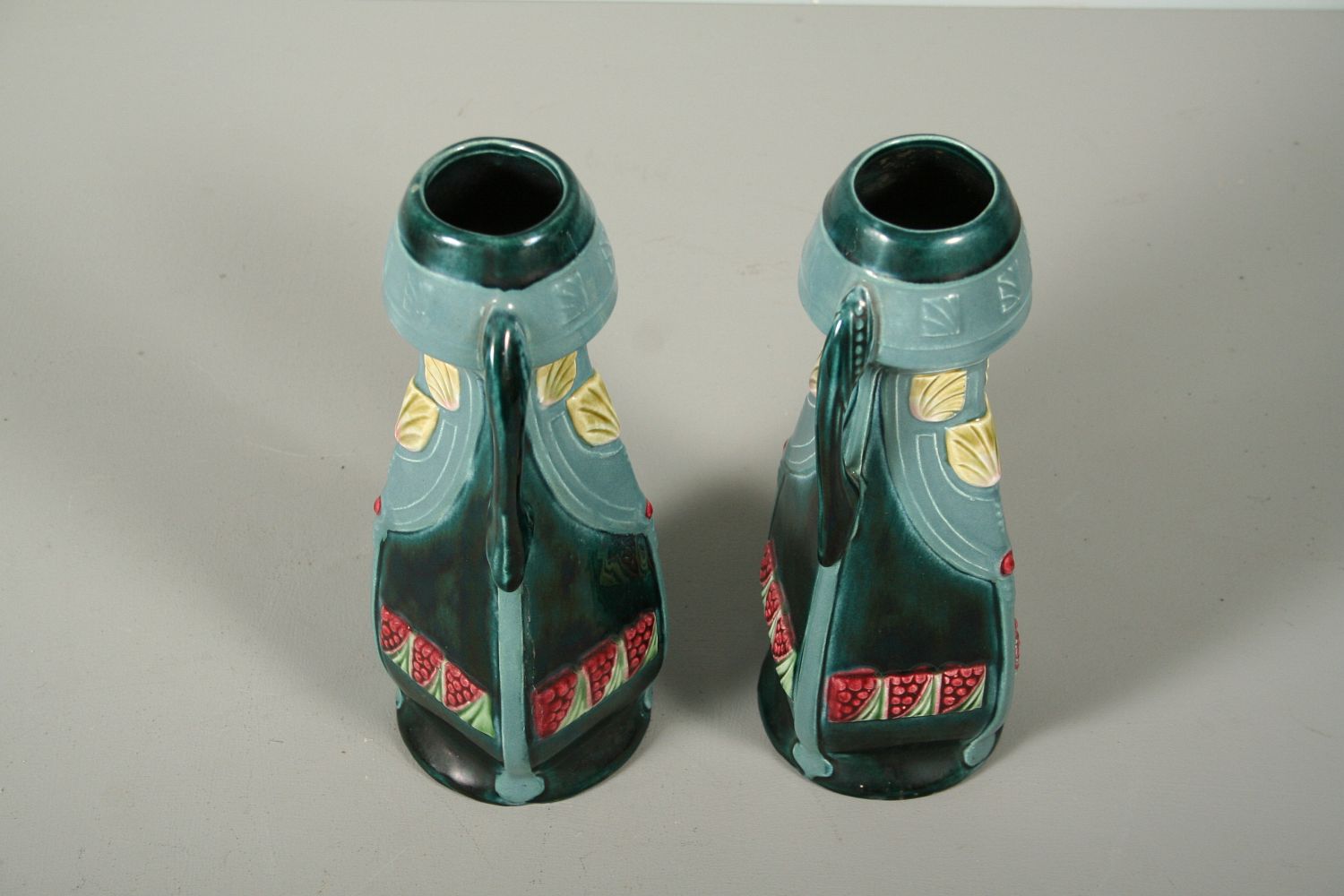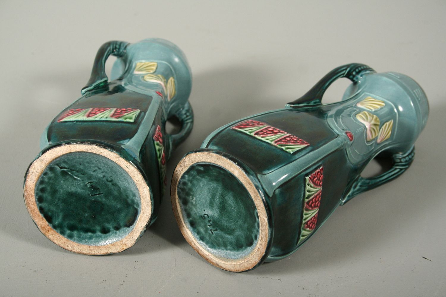 párové secesní vázy, glazovaná keramika plasticky dekorovaná, secesní tvary, výška 22,5 cm, na dně tlačená čísla 745, patrně produkce Dubí Eichwald