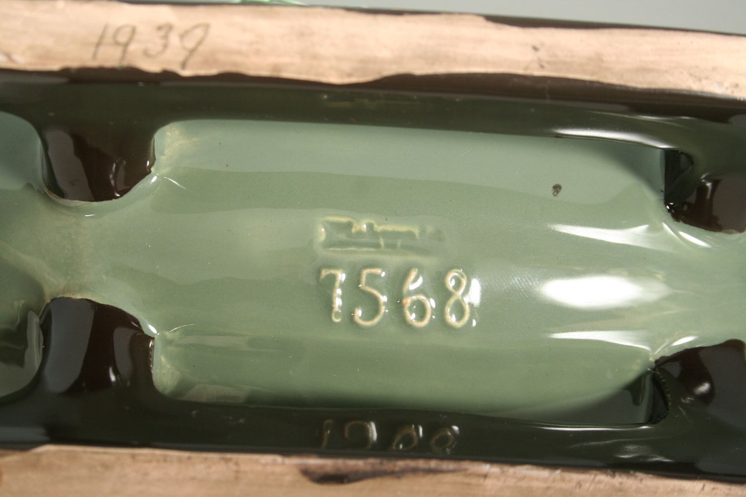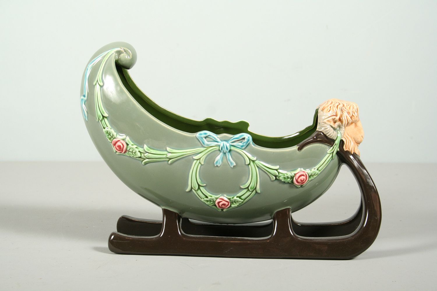 mísa na ovoce sáňky s hlavou berana, glazovaná keramika plasticky dekorovaná, výška 21 cm a délka 28 cm, na dně tlačená čísla 7568 a tlačená značka Eichwald