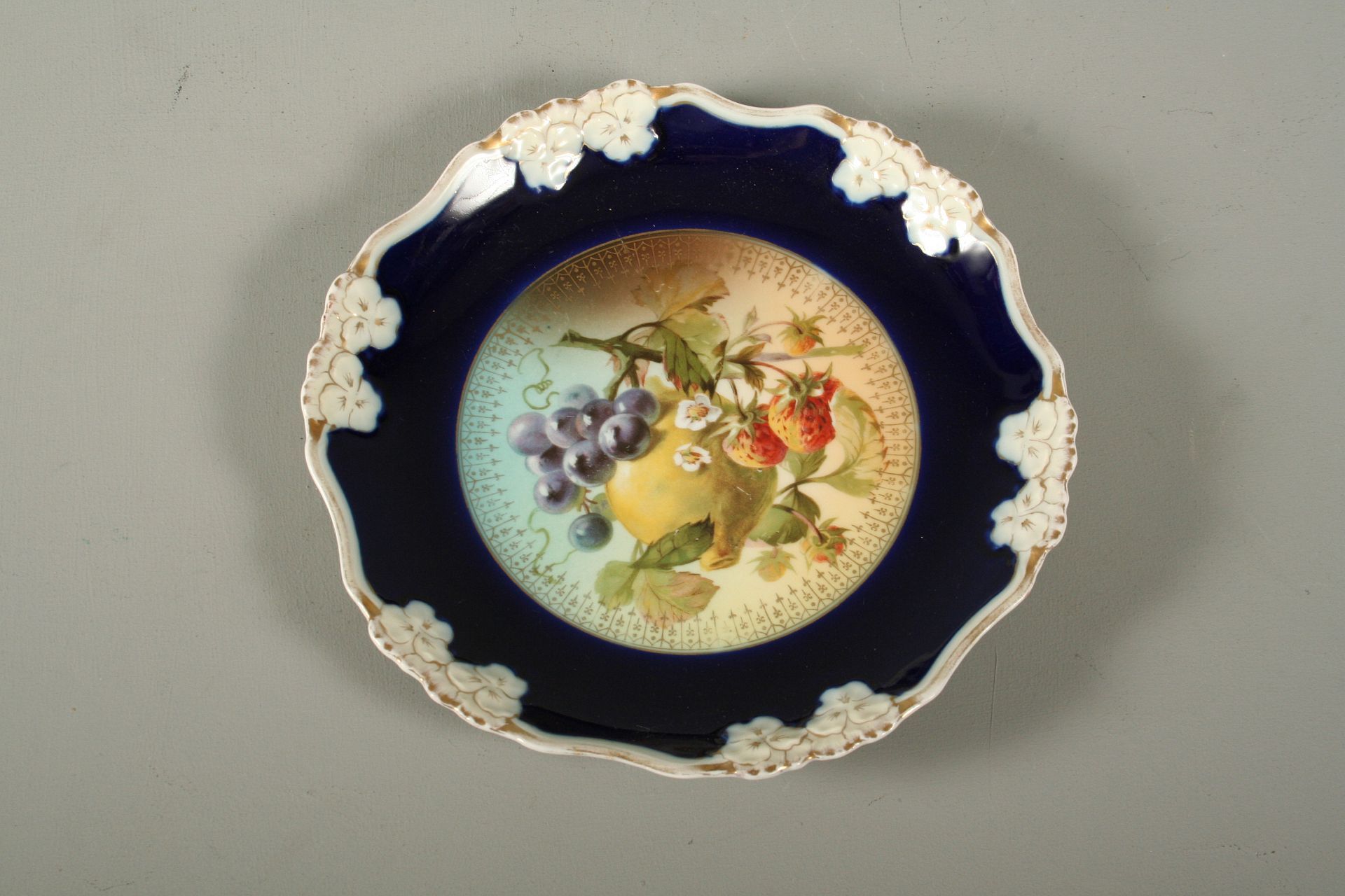 porcelánový dekorativní talíř, malovaný kobaltem, centrální barevný motiv ovocného zátiší, po obvodu reléfní dekor a zlacení, značeno na dně zelenou značkou Rosenthal, průměr 23 cm