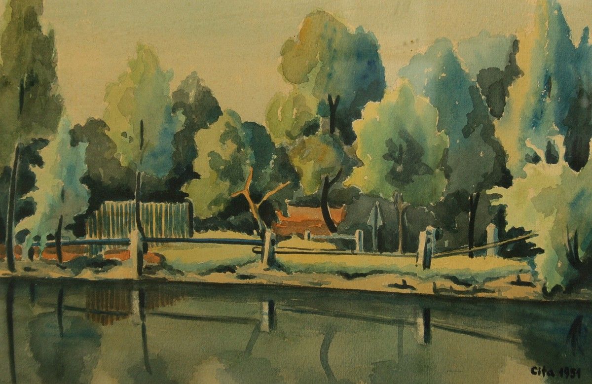 krajina s vodou a rybníkem, akvarel na papíře ve výřezu 18 x 27 cm s rámem 34 x 44 cm autor Jaroslav Cita, podepsáno vpravo dole Cita 1951, rámováno v paspartě a rámu pod sklem
