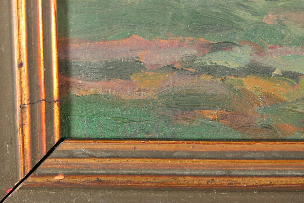 obraz břízek v širé krajině, olej na kartonu 21 x 33 cm s rámem 34 x 46 cm, autor Zdeněk Nemastil, podepsáno vlevo dole tužkou špatně čitelně (bez pomůcek) NEMASTIL, rámováno v původním rámu