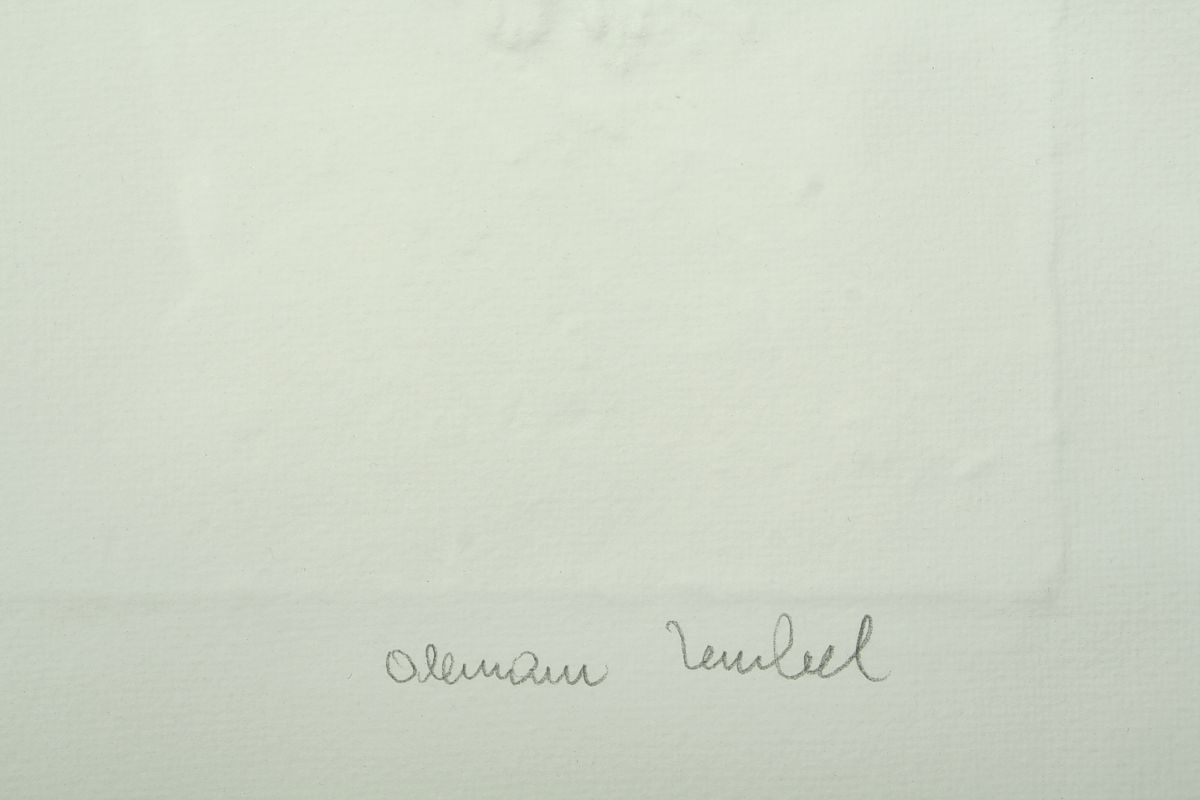 Marie a Josef s ratolestí 1996, zlacený slepotisk na papíře, výřez pasparty 42 x 40 cm s rámem 62 x 58 cm, autor Olbram Zoubek, podepsáno vpravo dole Olbram Zoubek, na zadní straně listu přípis Marie a Josef s ratolestí r. 1996, rámováno v paspartě a rámu pod sklem
