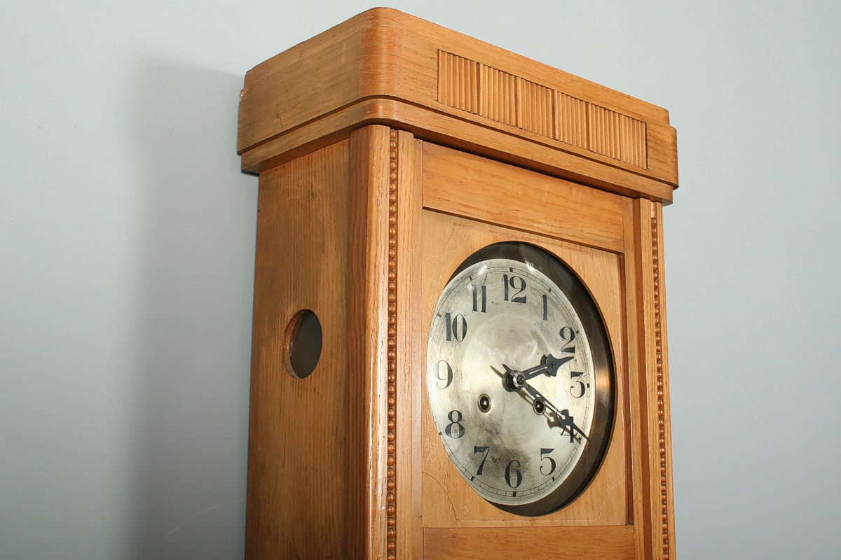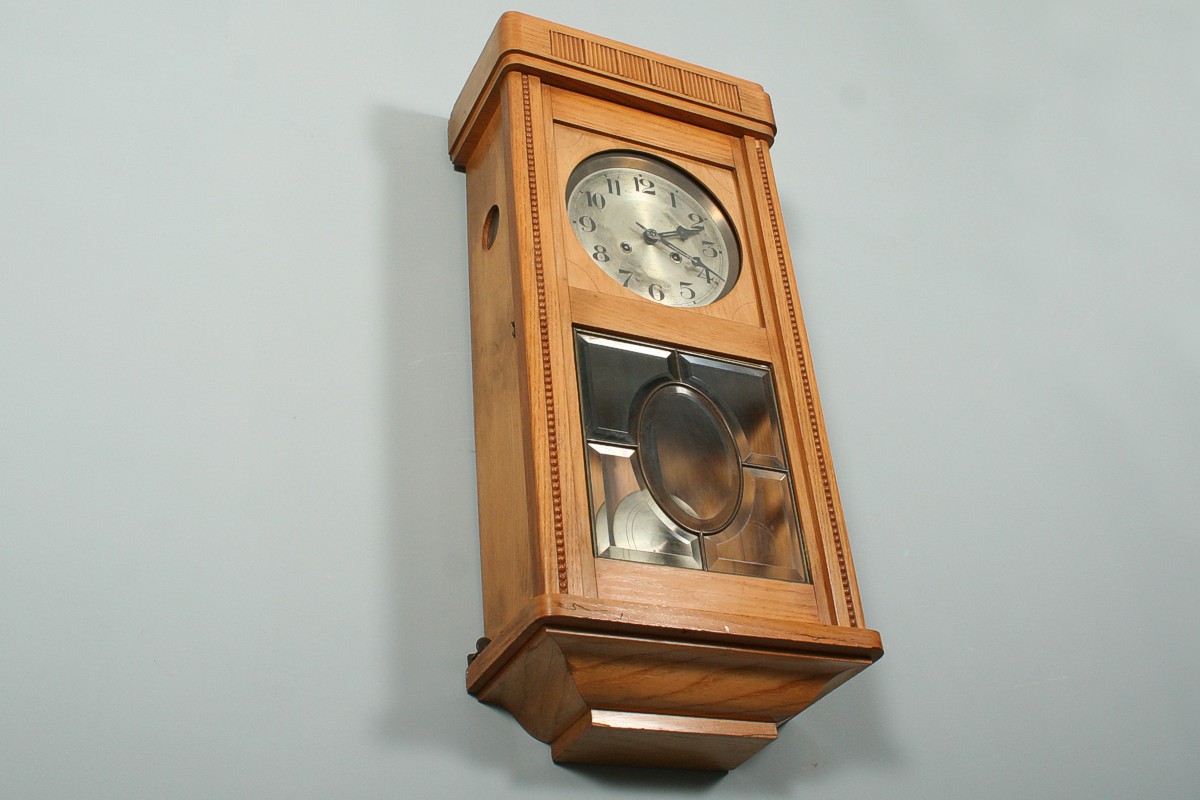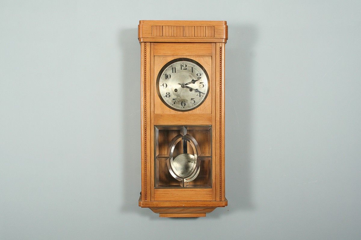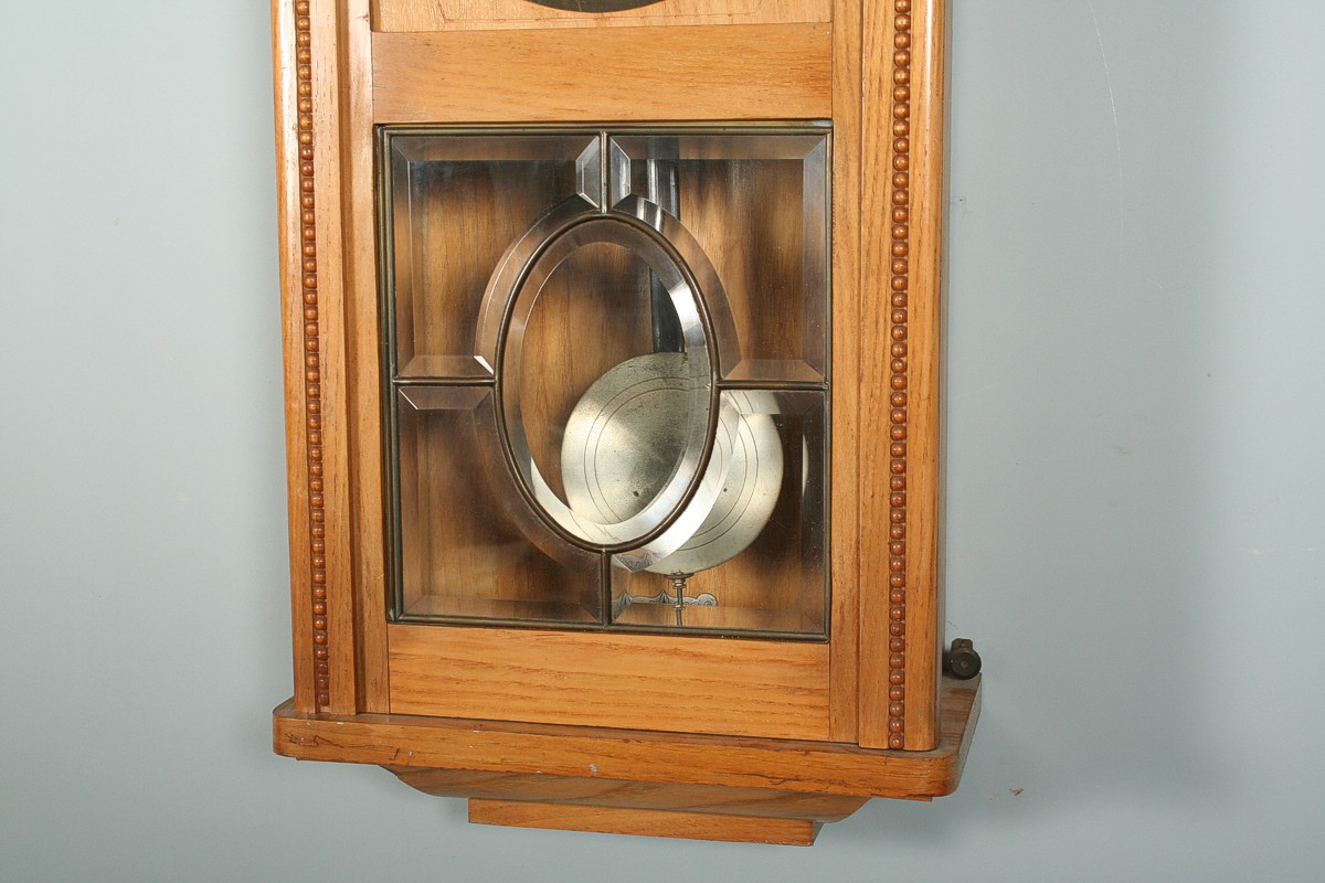 závěsné bicí hodiny v pozdně secesní dřevěné skříňce s fazetovanými skly s mosaznou vitráží oválného tvaru, světle jasanový masiv s ozdobnou římsou, 76 x 35 cm, stroj na pérový chod s plechovým ciferníkem, stroj značený Gustav Becker, pěkné dunivé bití do tyčí, funkční s klíčem