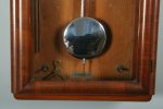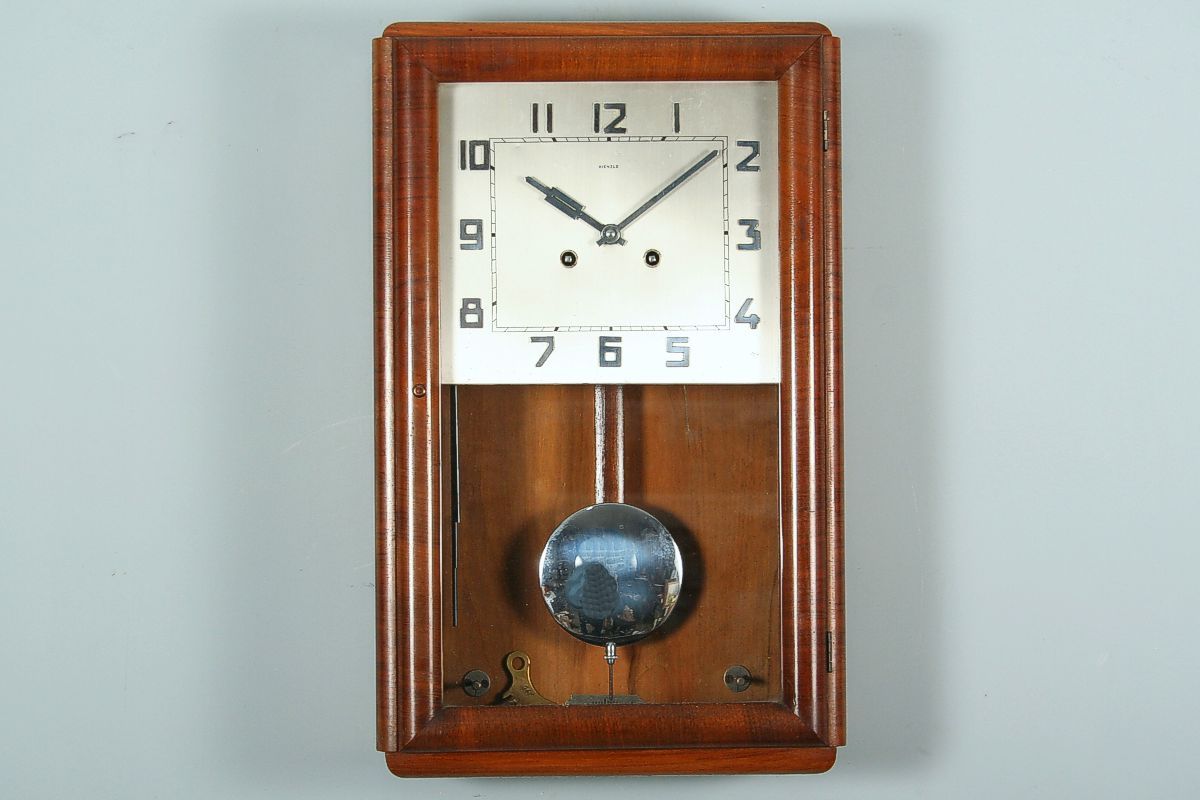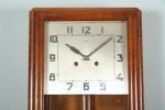závěsné hodiny v dřevěné skříňce dýhované ořechovou dýhou v moderním stylu 30. let, chromový plechový ciferník značený Kienzle, dvoutónové bití do tyčí, stroj na pérový pohon značený Kienzle, zcela funkční s kličkem na natahování, uvnitř skříňky aretační šrouby, 51 x 32 x 12 cm